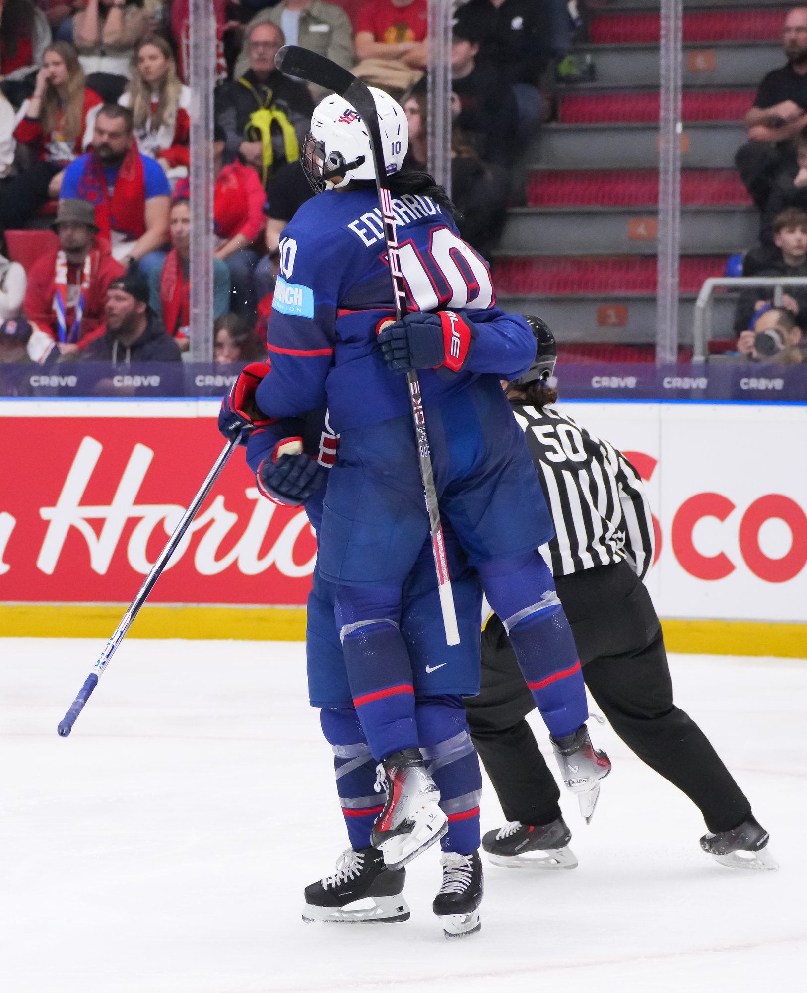 And when that PP came in the 29th minute, the Americans got the tying goal. Edwards’ delicious snipe from the left-hand dot quelled the decibels in the arena to the point that the cheers from U.S. bench were clearly audible around the building.