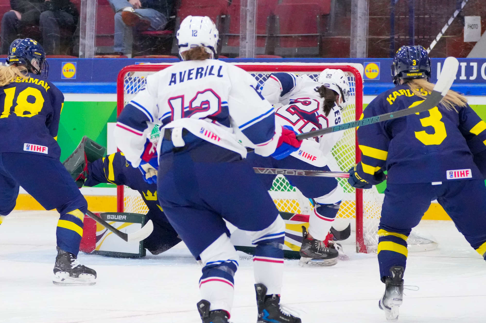 With 8.15 remaining, a broken play in the Swedish zone left Christina Scalese all by herself in front of Helge, and she made a nifty move to beat the Swedish goalie to give the Americans a 1-0 lead in the game. Caroline Averill and Ella Johnson picked up assists.