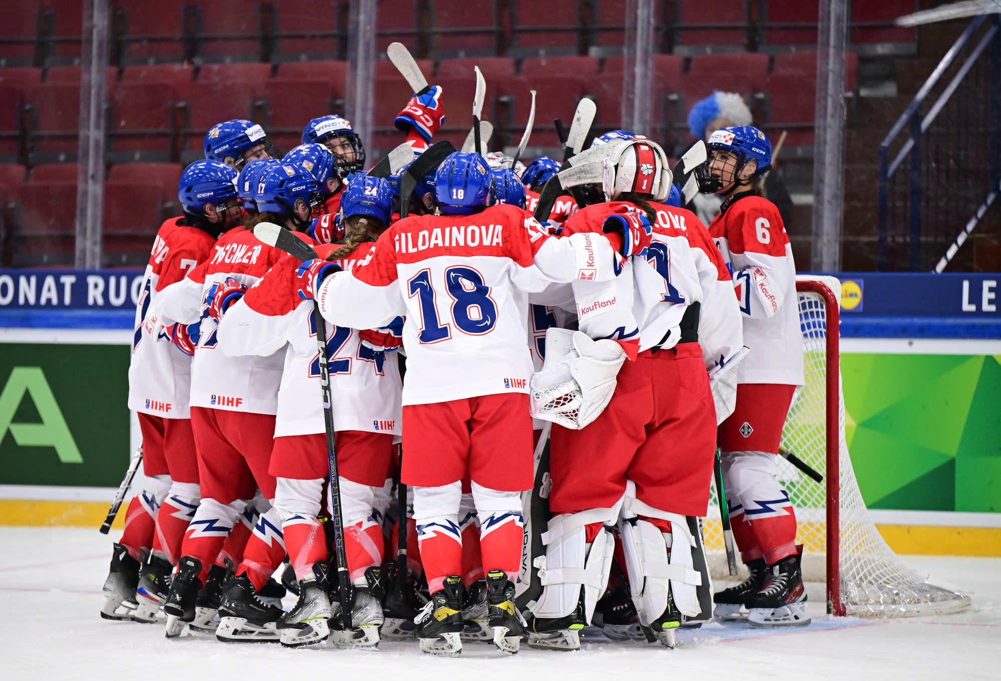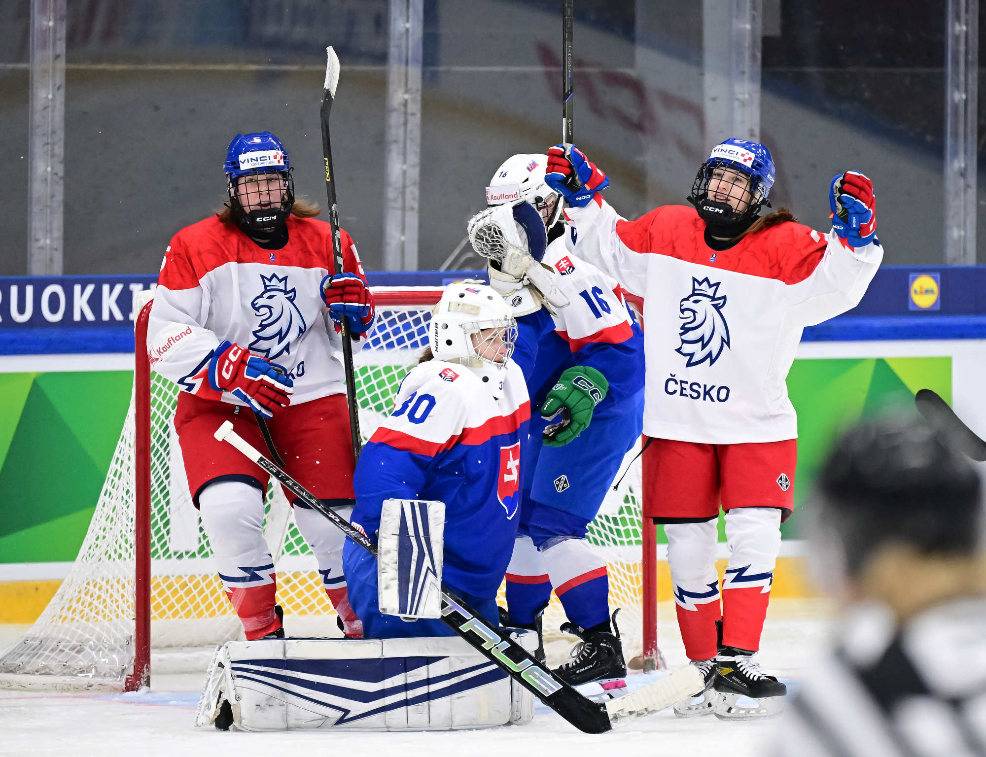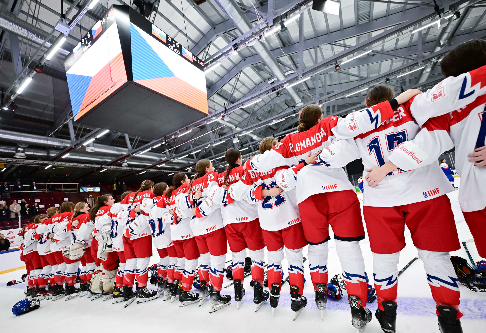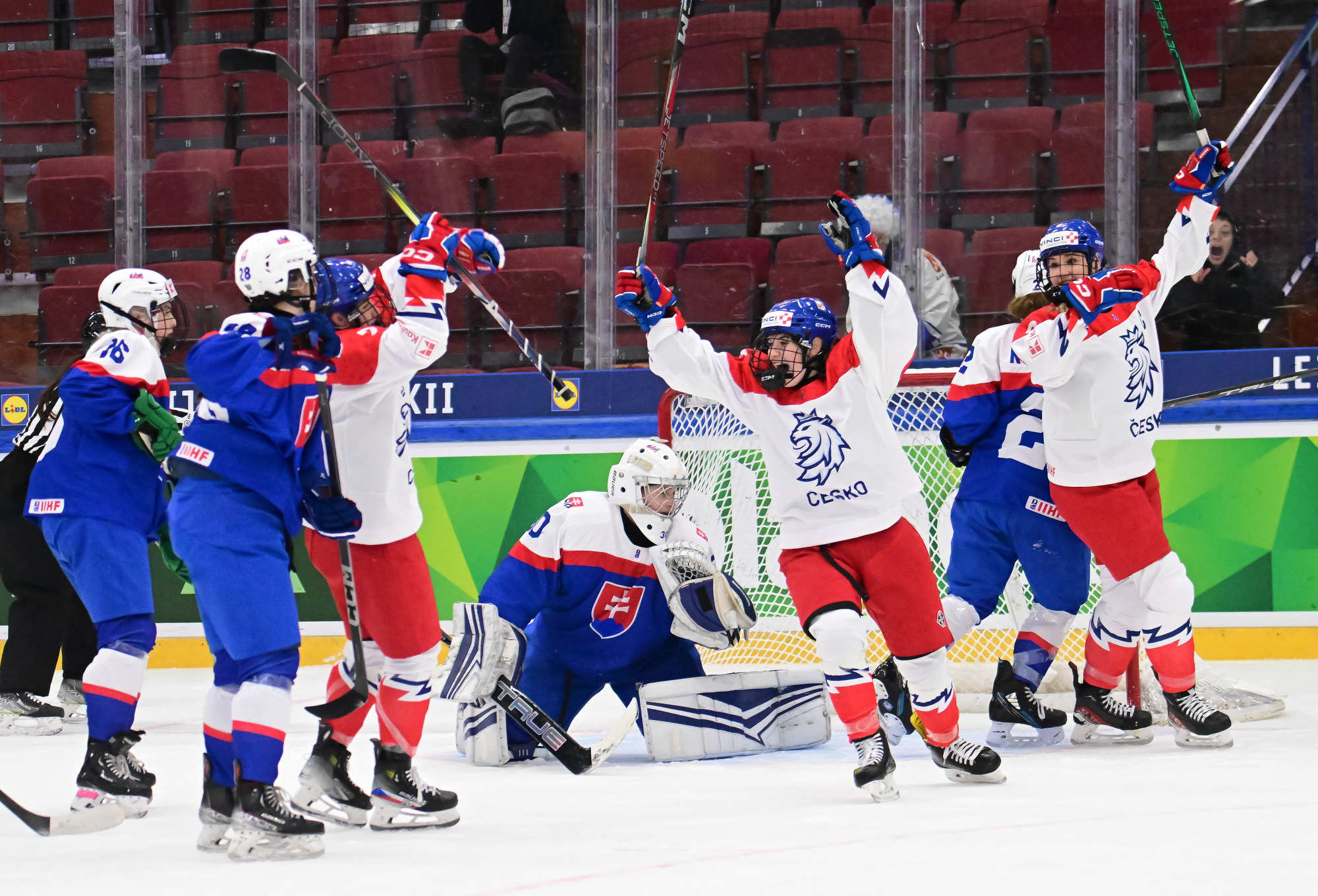 Czechia's players (white jerseys) celebrate after regaining the lead in a pulsating battle against Slovakia at the IIHF Women's U18 World Championship.