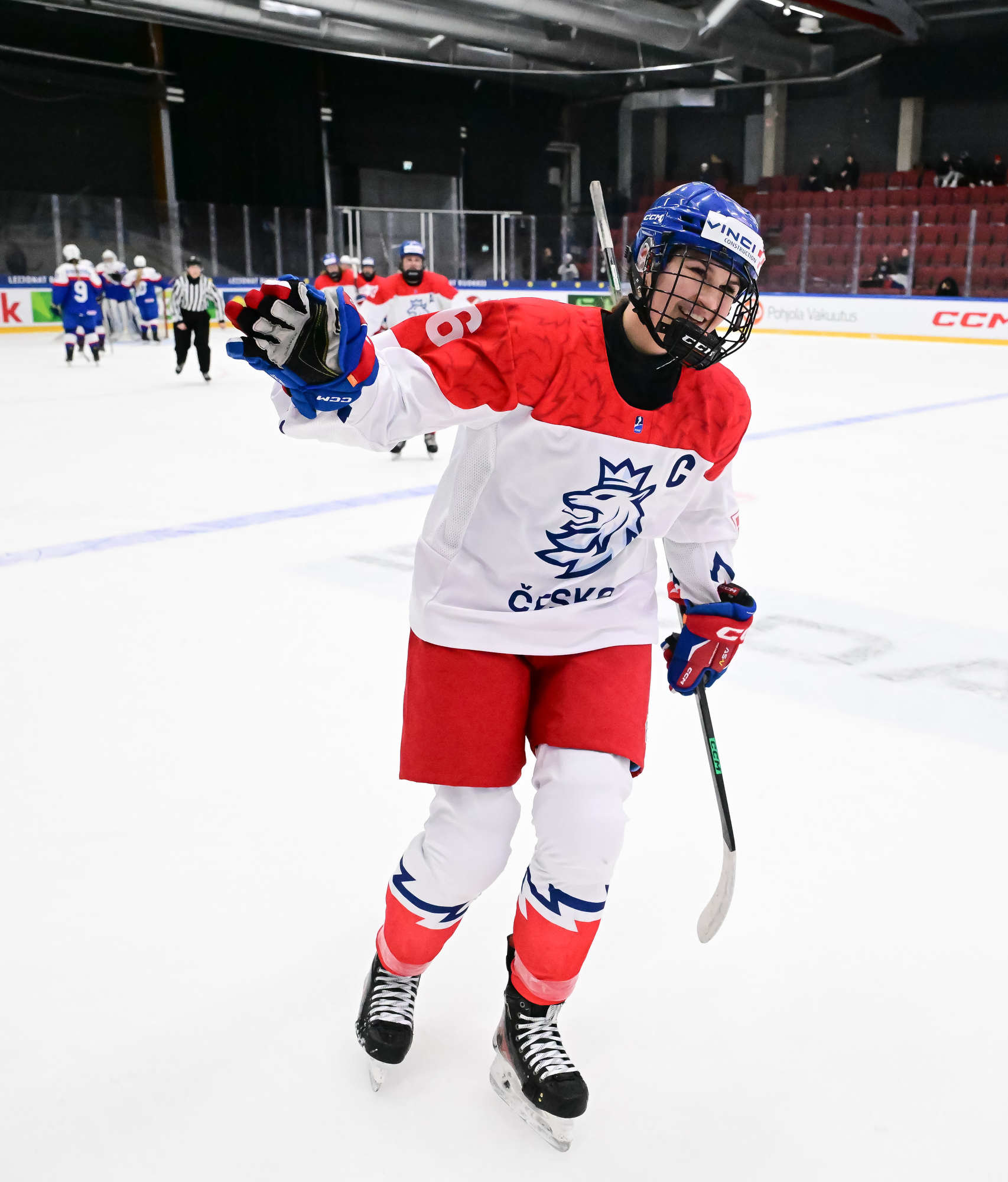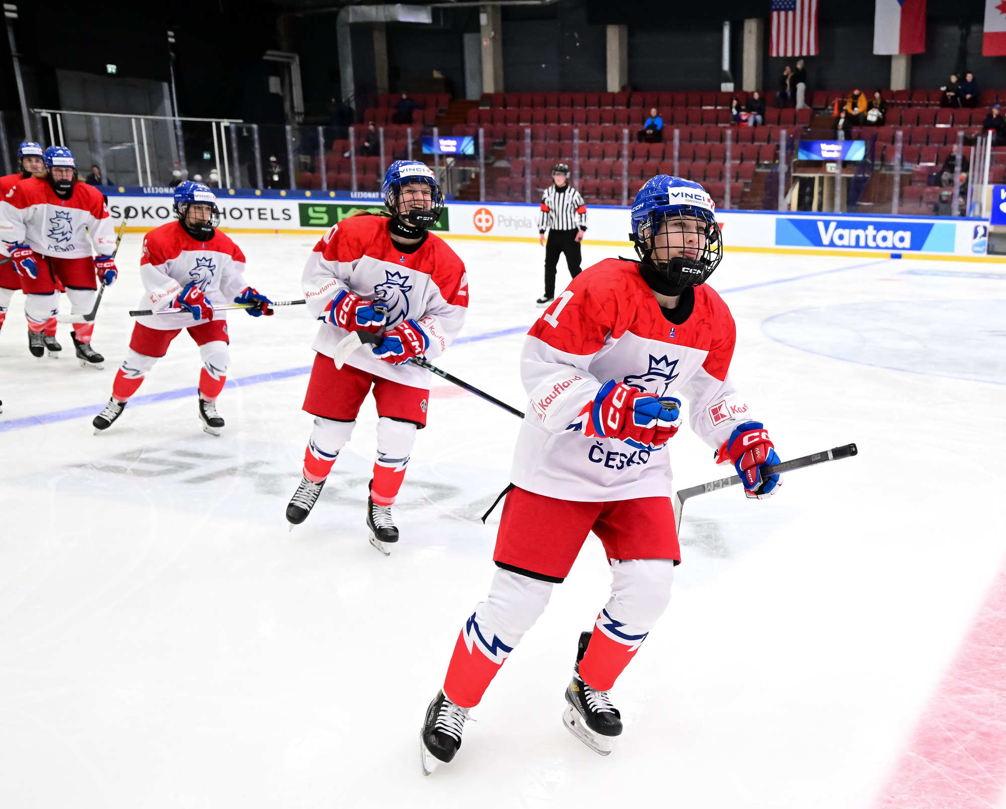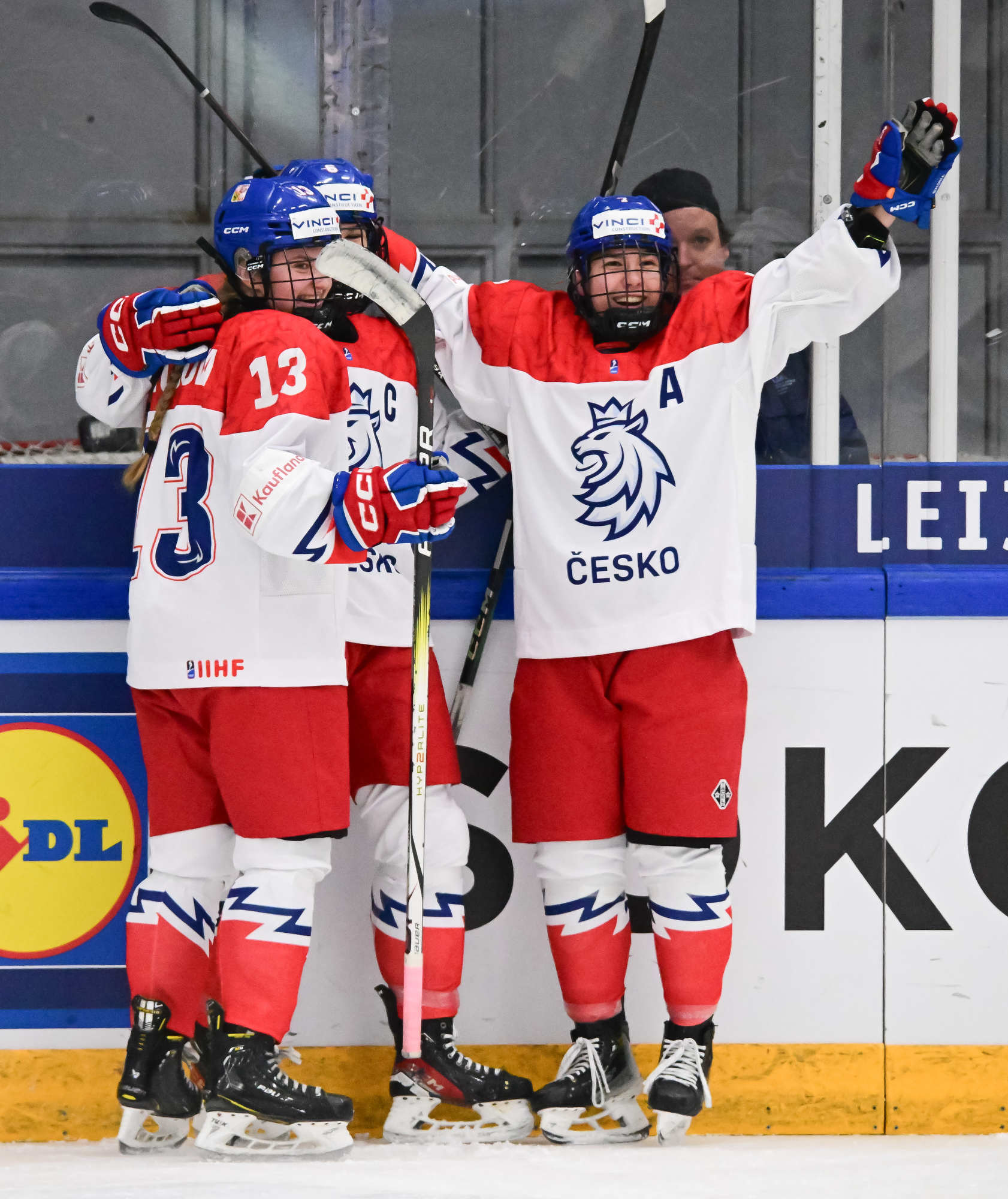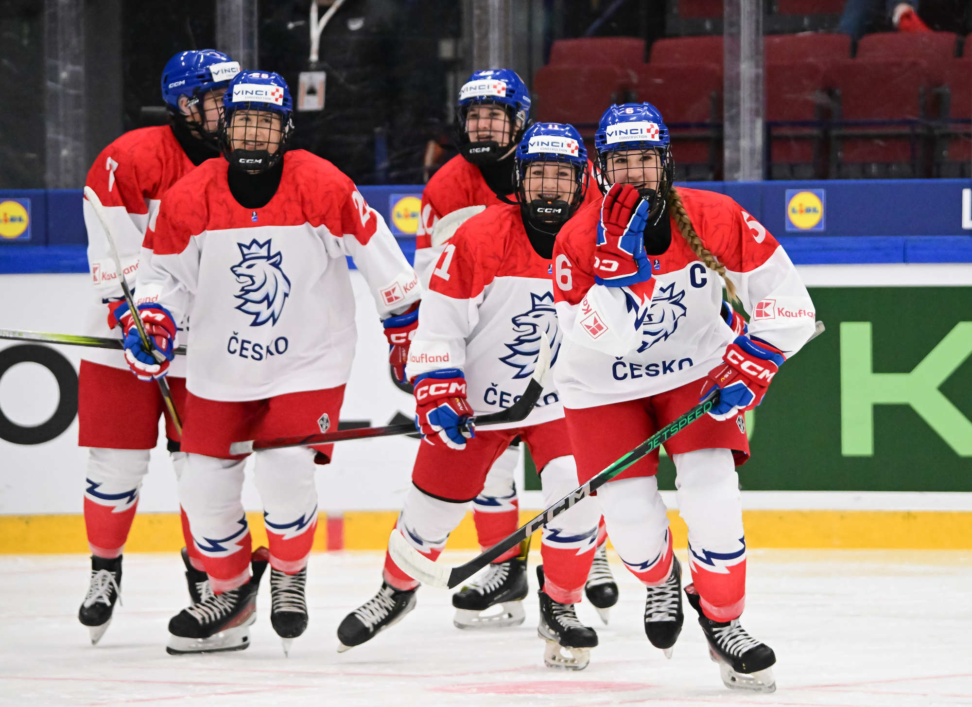 Czechia's players (white jerseys) celebrate after regaining the lead in a pulsating battle against Slovakia at the IIHF Women's U18 World Championship.