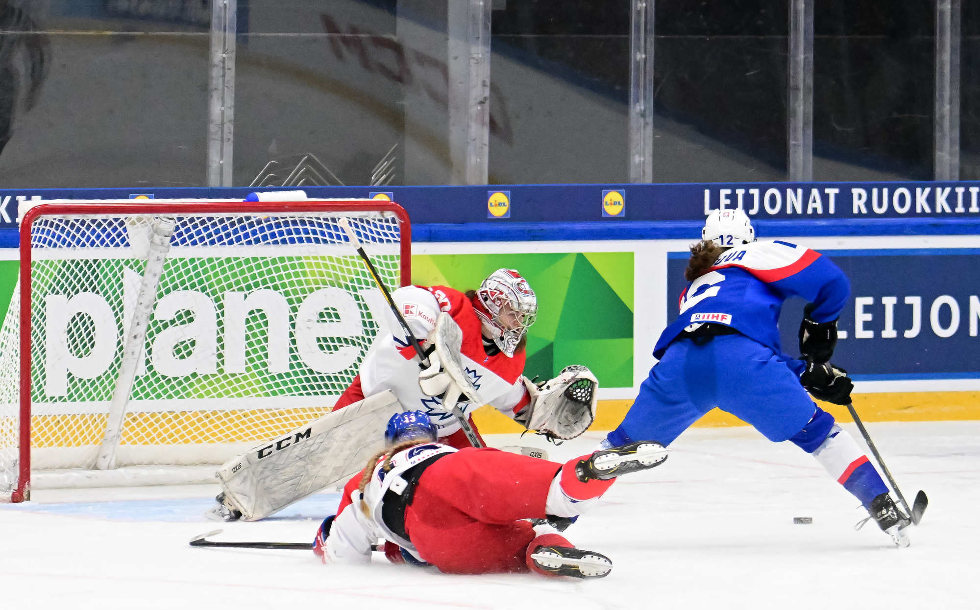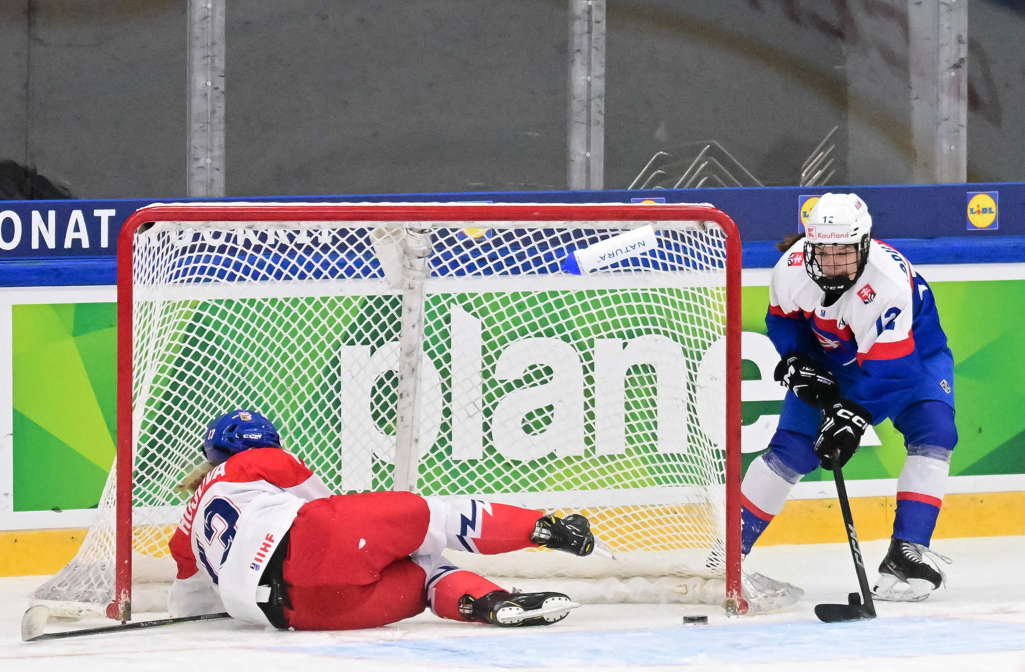 Five minutes later, Slovakia was back in front – albeit on a goal that will be discussed for some time. Tothova’s stretch pass sent Lopusanova through. She held off a challenge from Veronika Hujova, and the Czech defender ultimately went sliding into the net, knocking it off the moorings before Lopusanova could get around goalie Novakova and finish the play. A video review ruled a good goal, and Lopusanova’s hat-trick had Slovakia up 3-2 midway through the second.