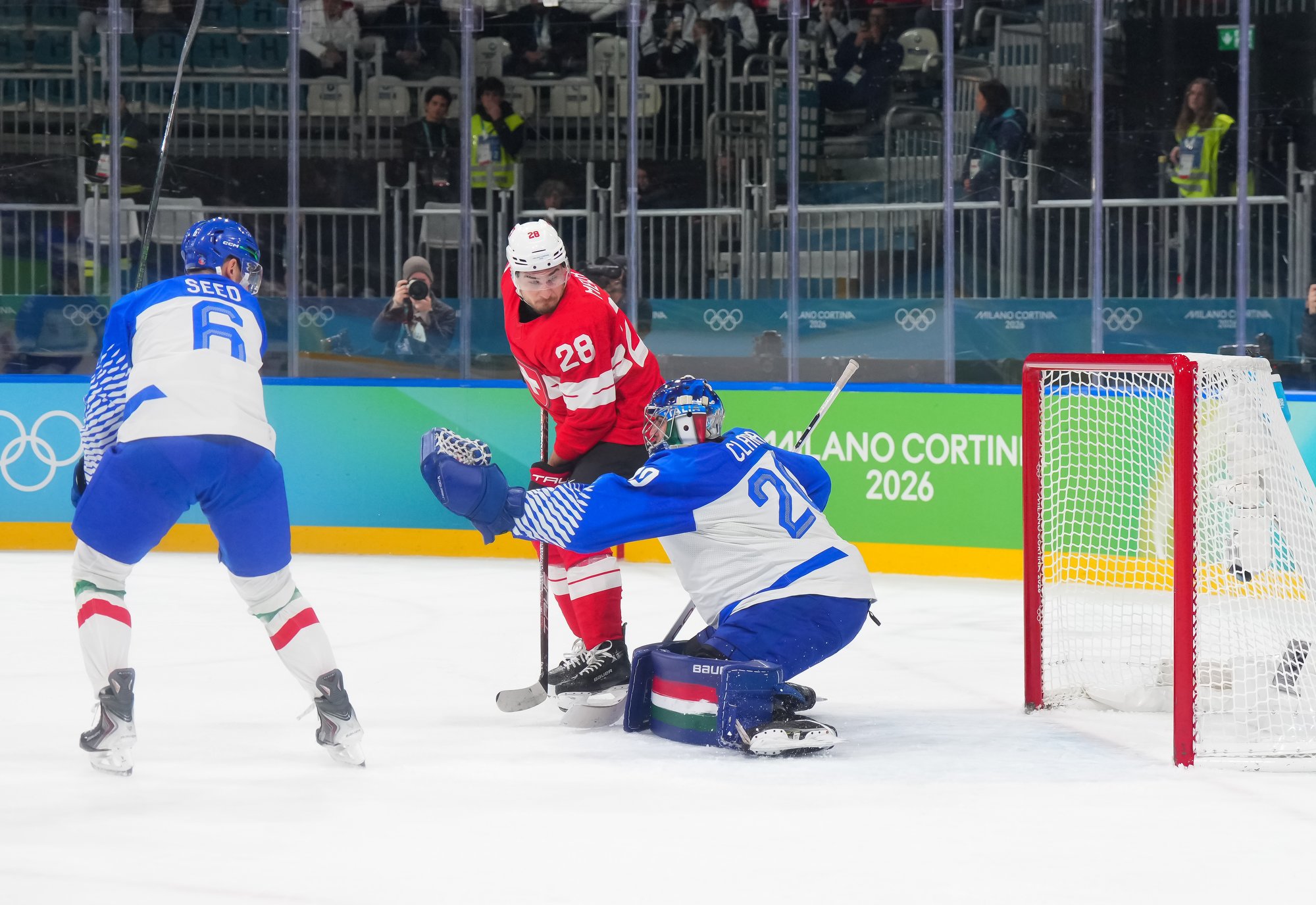 Near the five-minute mark of a scoreless second period, Genoni earned his keep when he foiled Italy's Martin Zanetti close-in on a quick turnover in the Swiss zone. Later, Clara came up huge against Sandro Schmid on a 3-on-1 chance set up by Nino Niederreiter. The on-ice tension as Switzerland maintained its lead bubbled over with a scrum in front of Clara's net shortly before the buzzer.