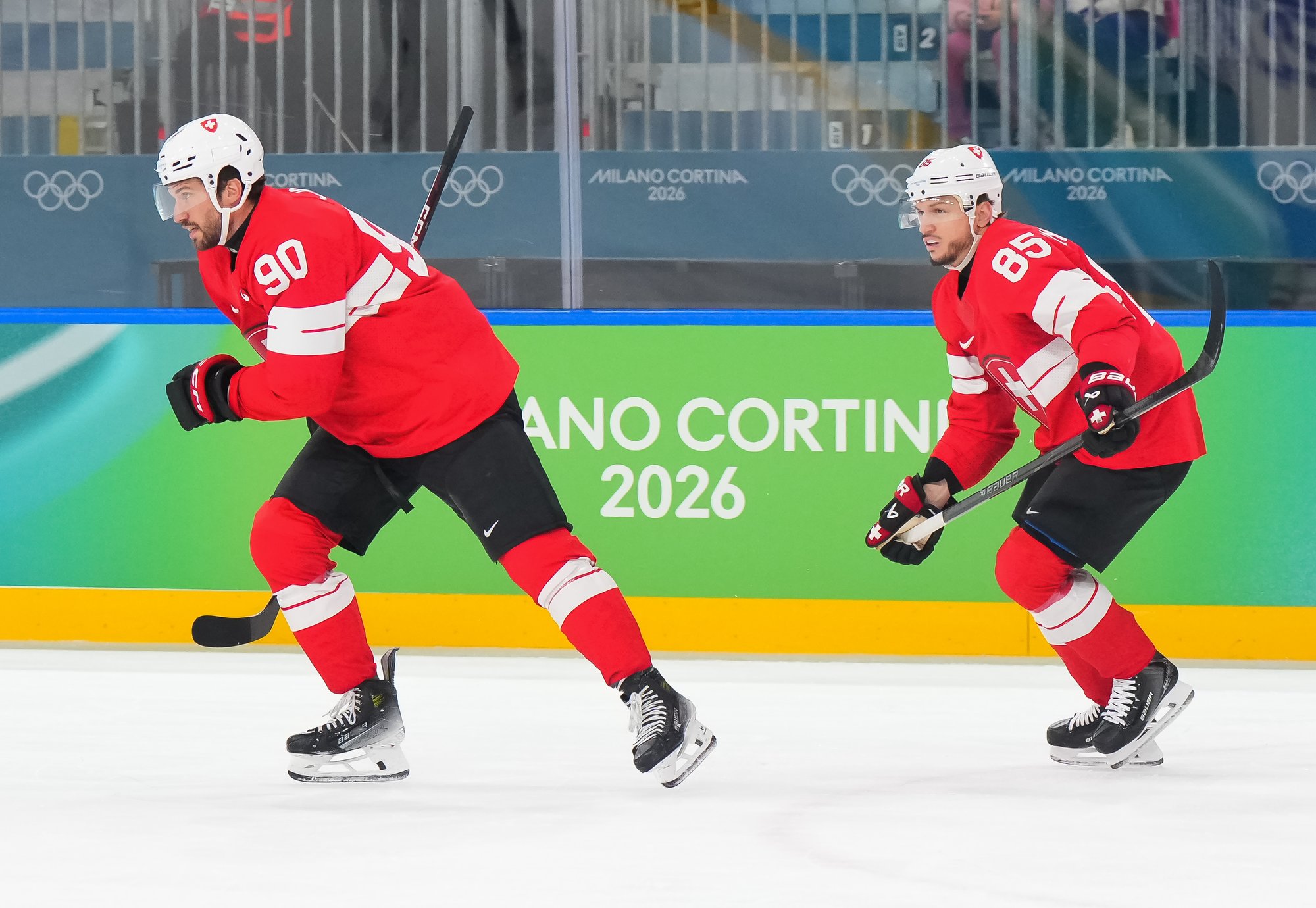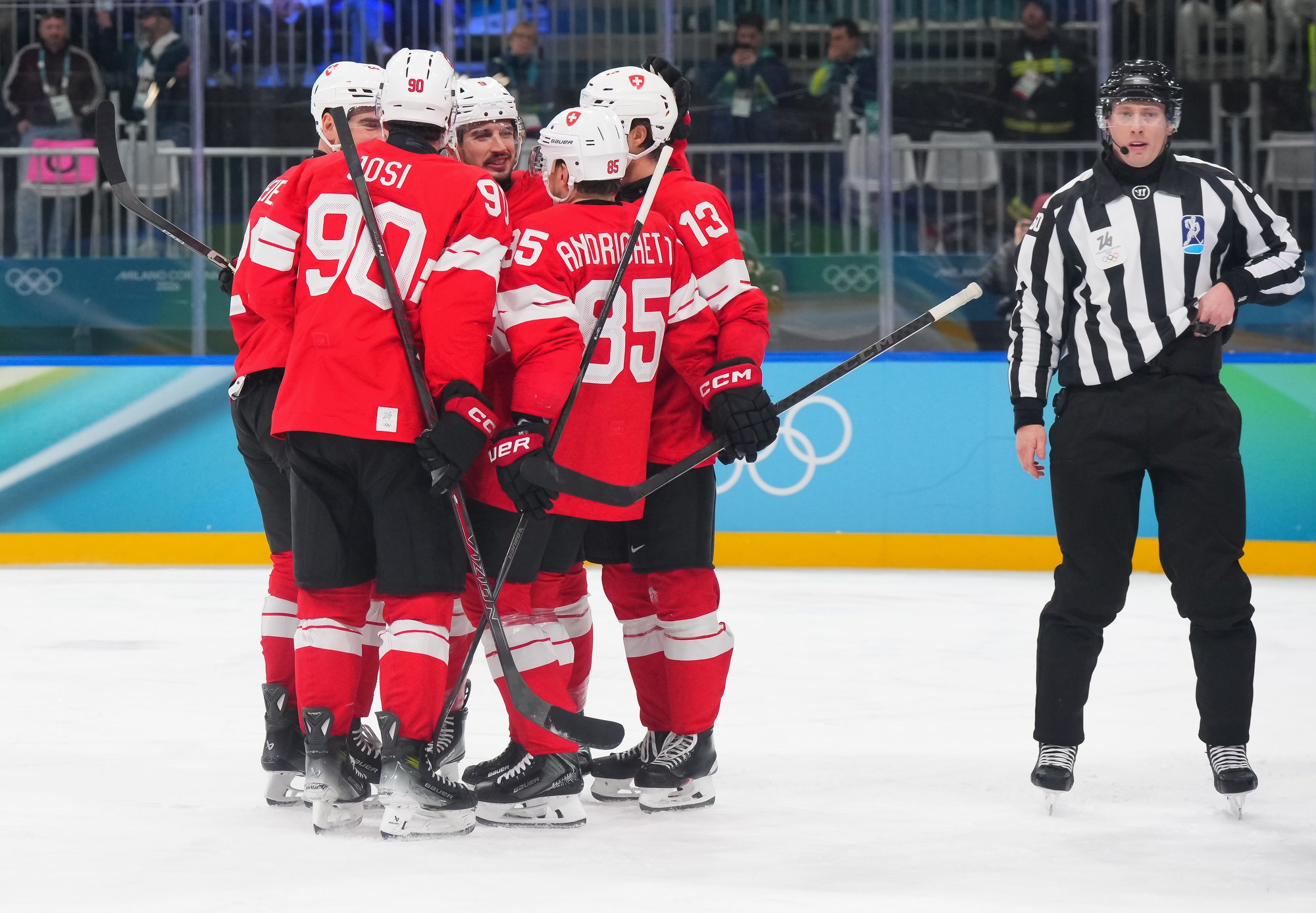 Swiss captain Roman Josi (#90, left) celebrates after scoring in a 3-0 win over host Italy in the qualification playoffs of the 2026 Olympic men's hockey tournament.