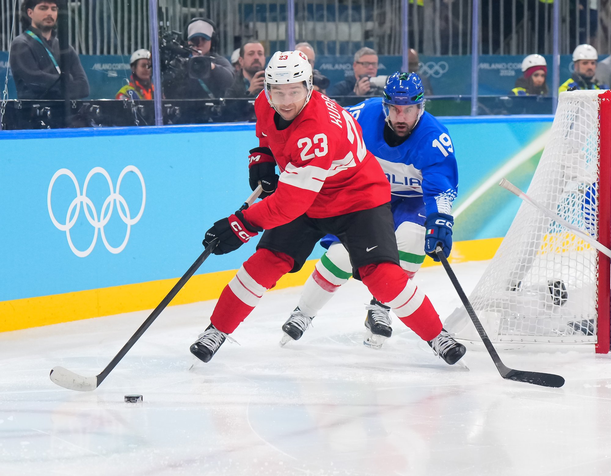 The Italians had a rough start. Centre Matt Bradley, who leads Italy with two goals, fell heavily into the boards in the first minute and was helped off. And at 1:19, Kurashev opened the scoring, converting a juicy rebound into a wide-open net.