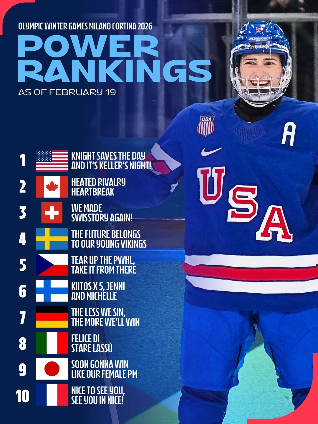 What a dramatic climax to the 2026 Olympic women’s hockey tournament! With a 2-1 comeback victory over archrival Canada on Megan Keller’s spectacular sudden-death goal, the U.S. wins its third Olympic gold medal and winds up in top spot in our final Power Rankings. After playing a strong tournament with their trademark heart and grit, the Canadians sadly settle for second place. The Swiss, who claimed their second Olympic bronze medal on Alina Muller’s overtime winner, take third place over Sweden. If you enjoy your international women’s hockey updates with a touch of humor, come back and see us again during the 2026 IIHF Women’s World Championship in Denmark!