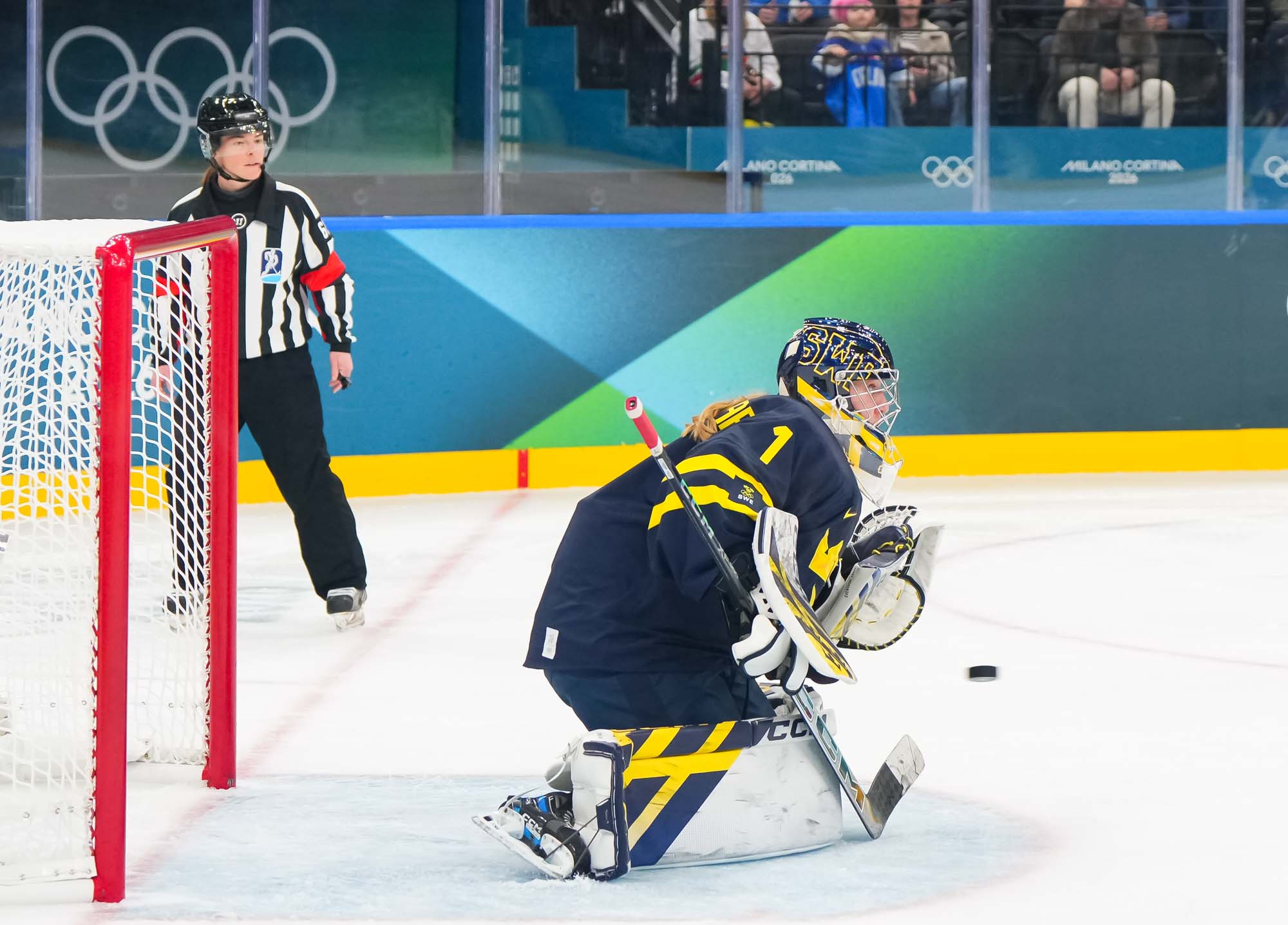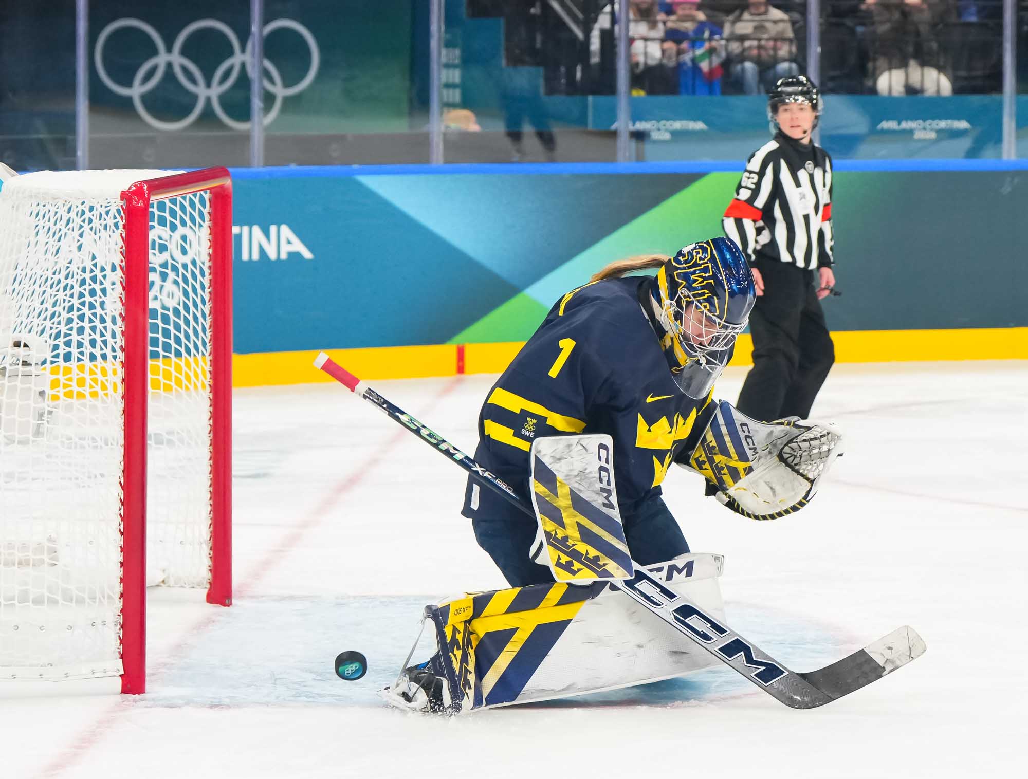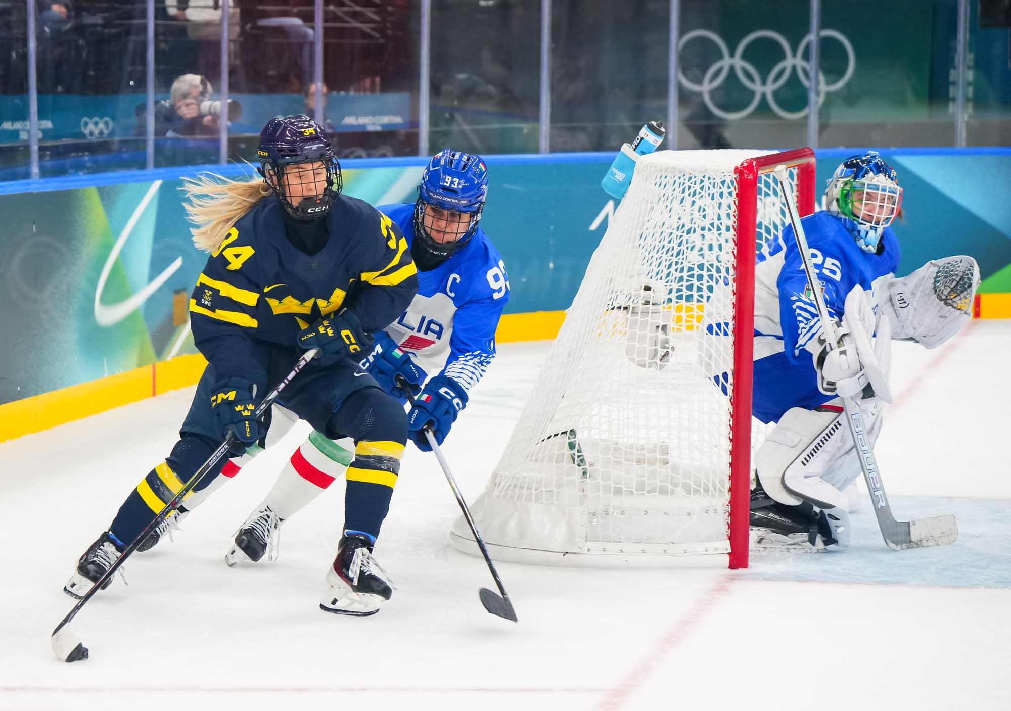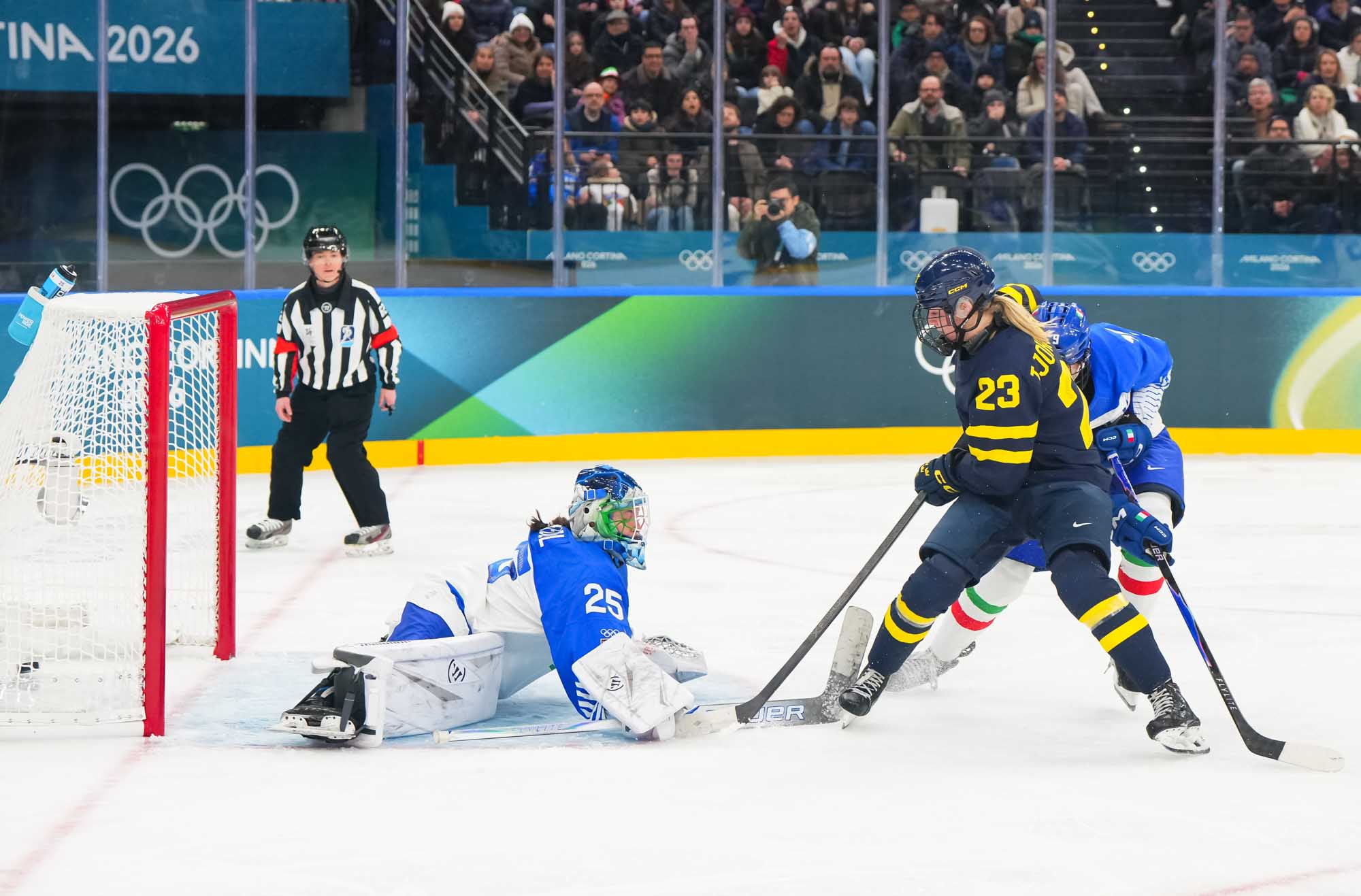 The opening period was evenly played, but the better chances were against Martina Fedel, who was the winning goalie against France two days ago. Nevertheless, the Swedes opened the scoring midway through the opening period. Hanna Thuvik fought off a check behind the net and got the puck to Jessica Adolfsson, and she snapped a shot high to the short side at 9:50 to make it a 1-0 game. It was her first career goal at the Olympics, having been held goalless in five games in 2022.