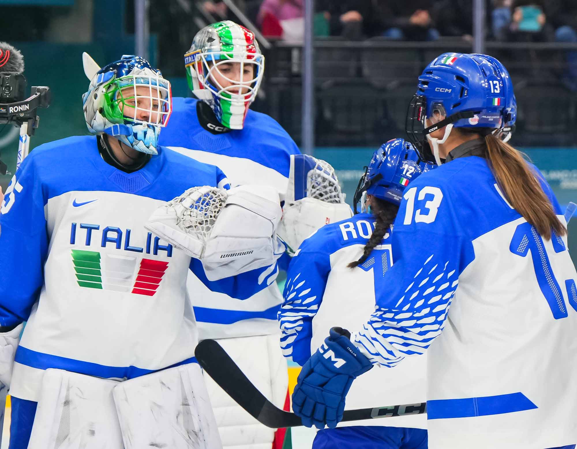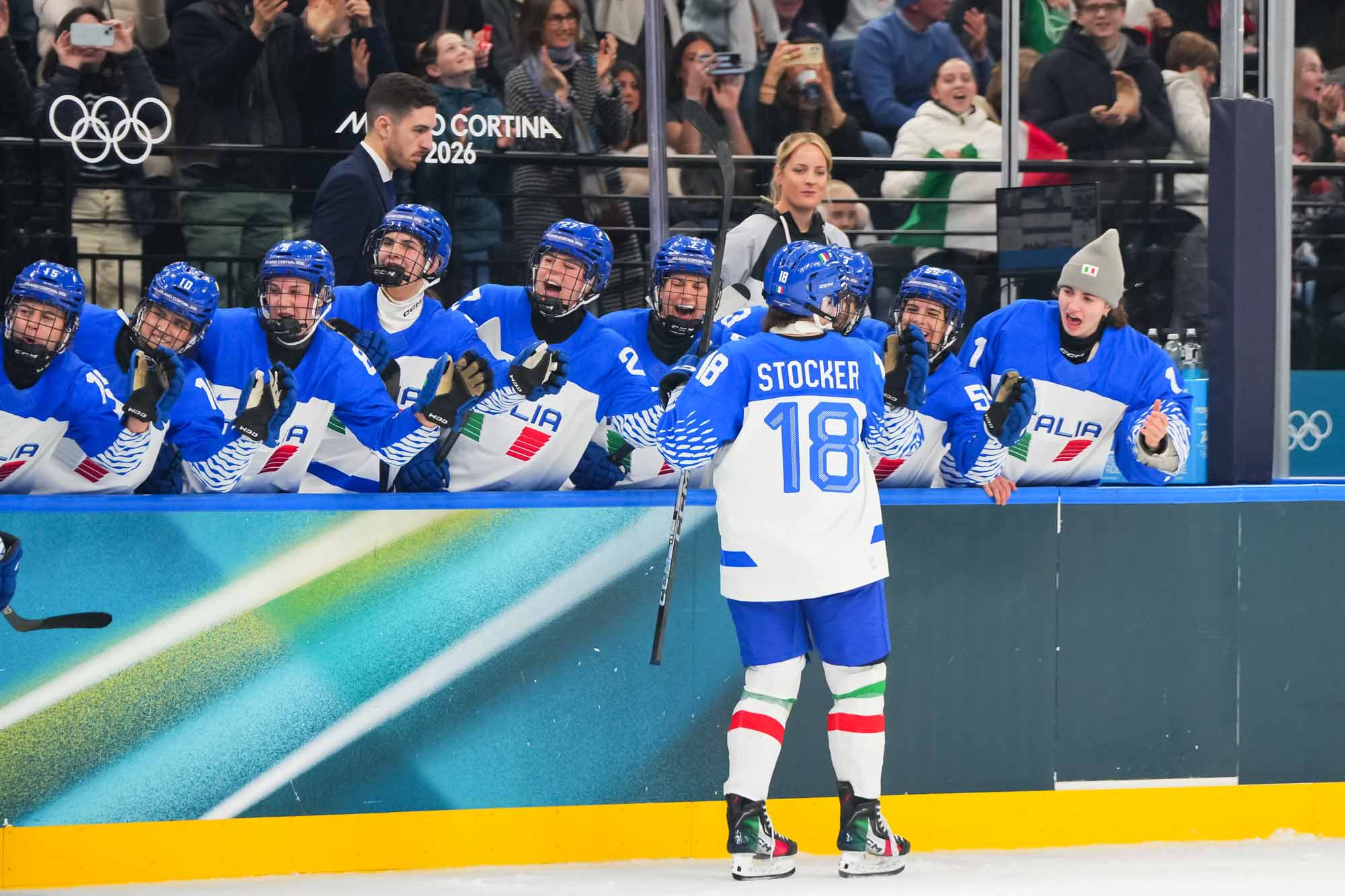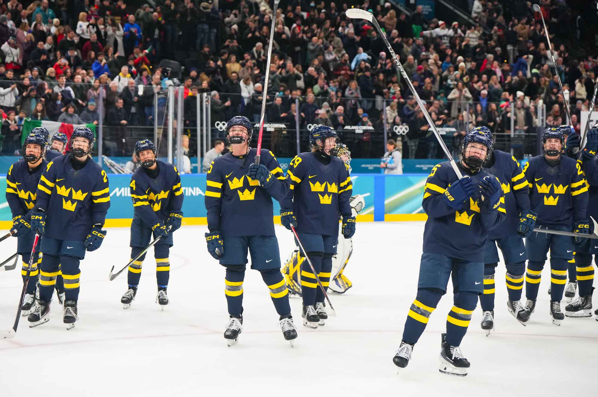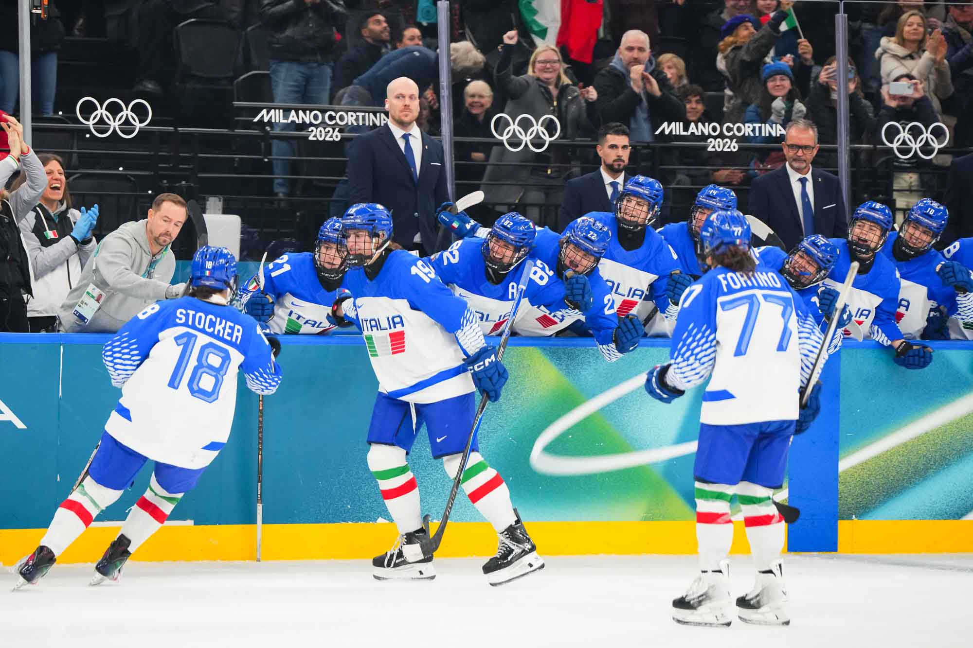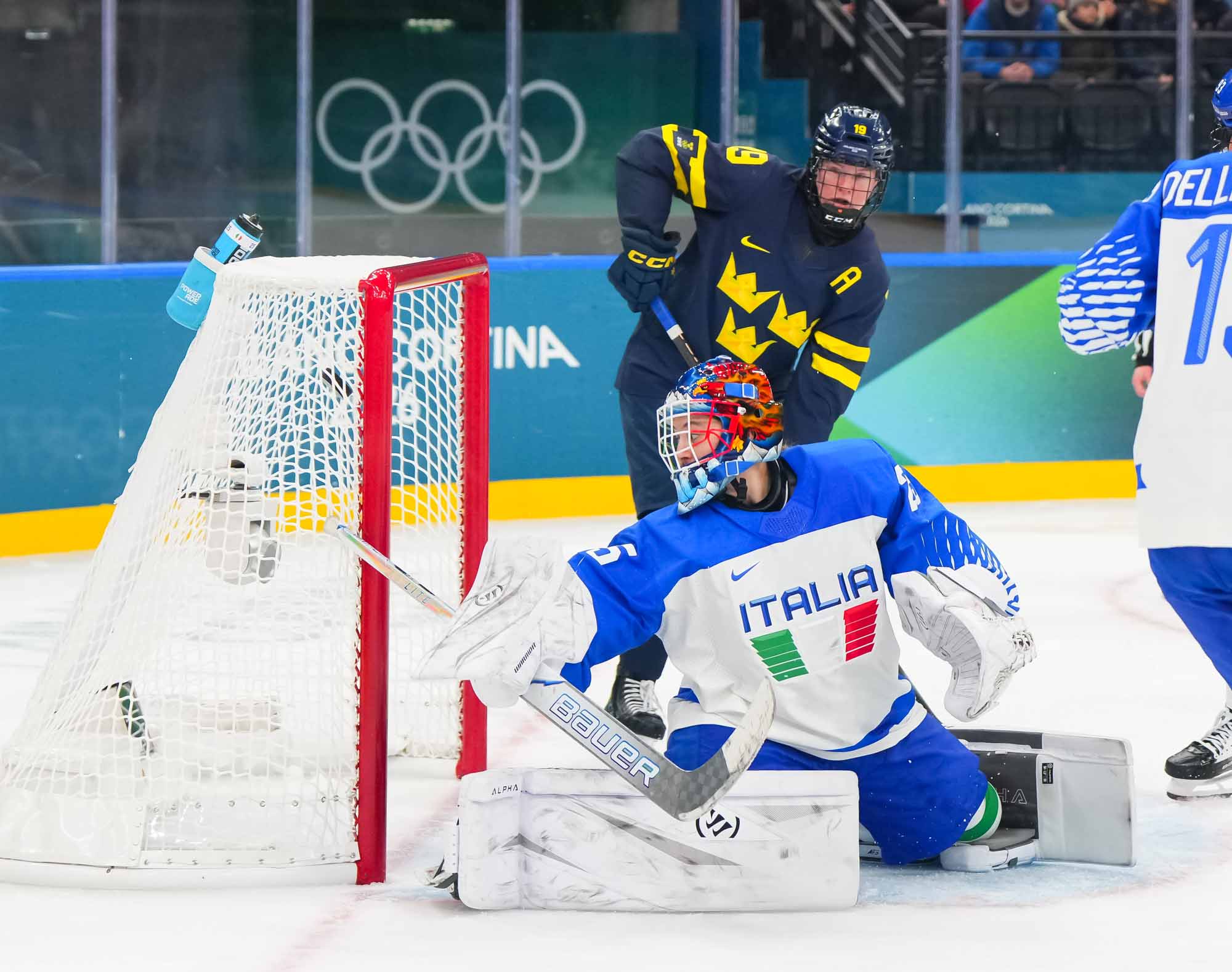 The crucial Group B game was a battle of undefeated teams, both having won their Olympic-openers by 4-1 scores. Today Sweden had the better of the play and more of the top-notch scoring chances. But even though the Swedes were listed as the home team on the game sheet, there was no mistake that the overwhelming majority of fans in the sold-out Santagiulia were screaming, “Eee—tal—yaaaa!”