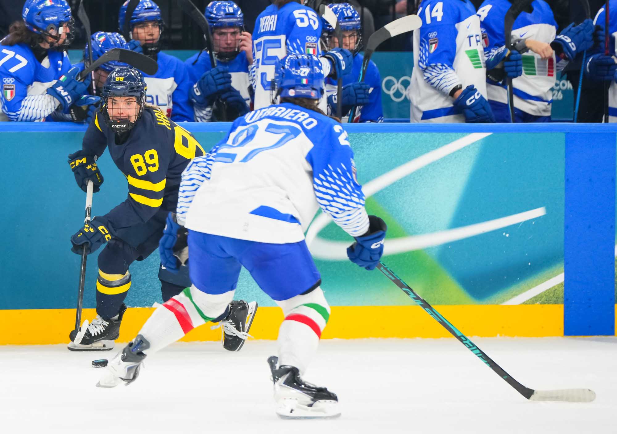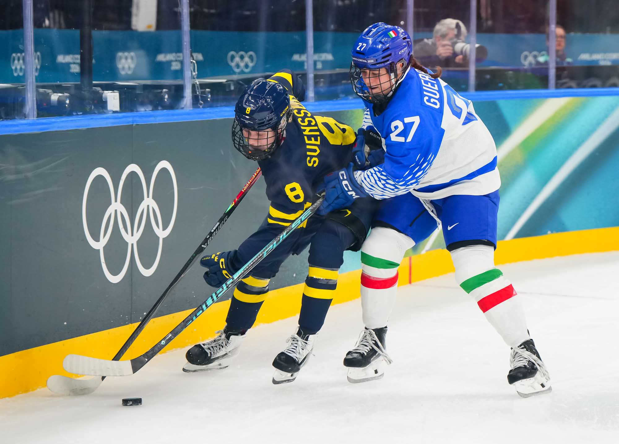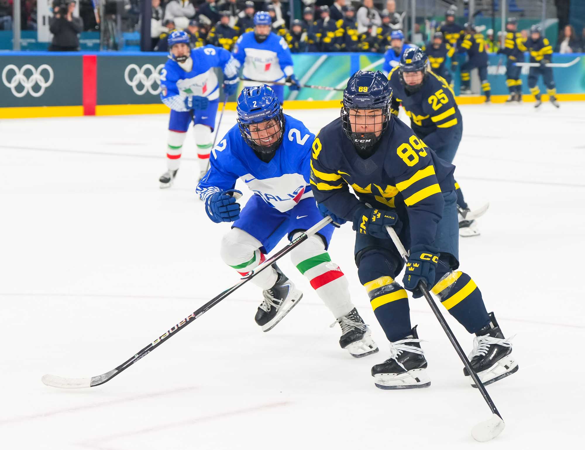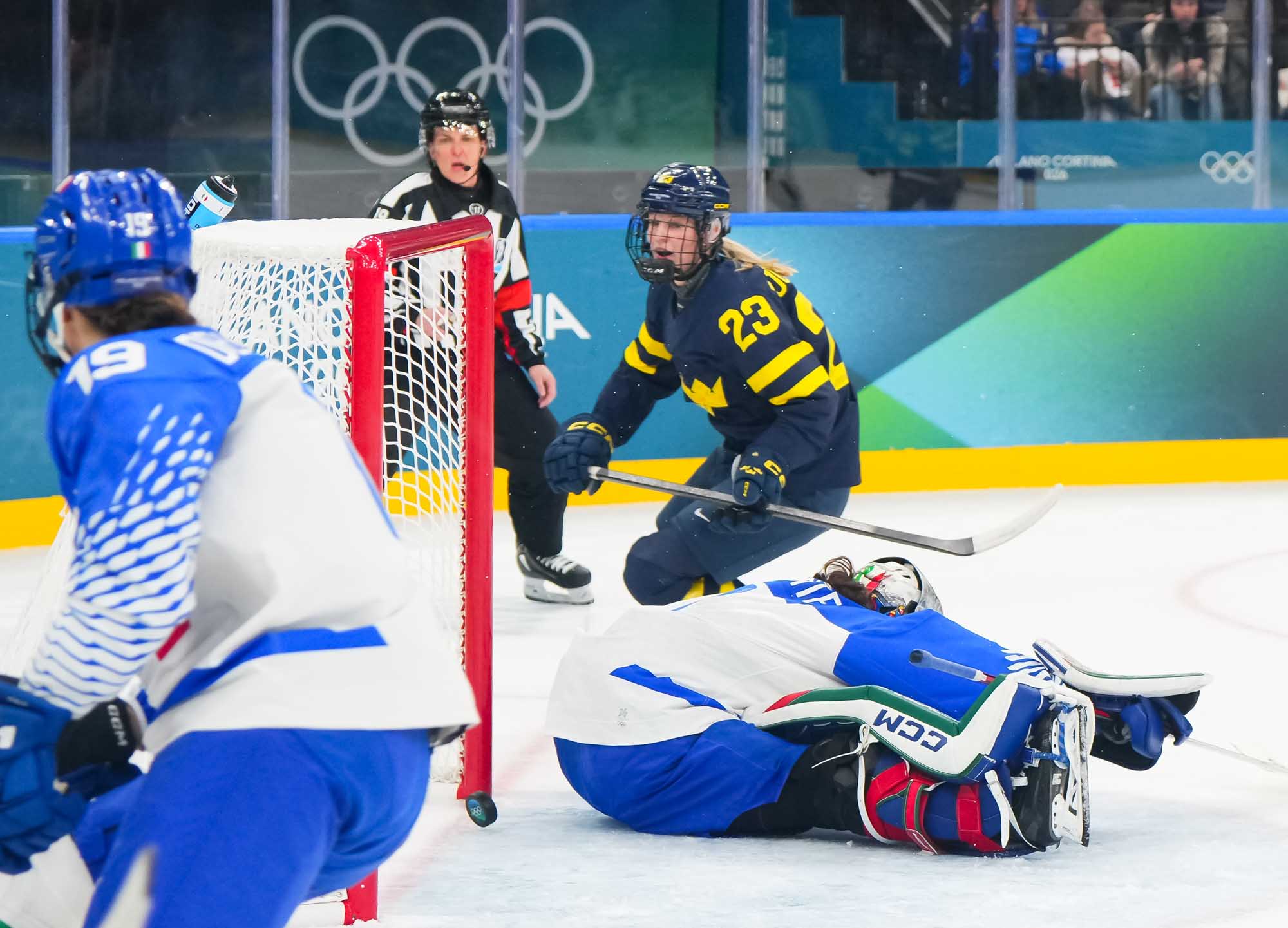 Sweden scored three goals in the second period and pulled away to defeat Italy to the tune of 6-1 this afternoon before a raucous crowd of 10,727. Thea Johansson had two goals and an assist, and she is now tied with German Laura Kluge for the tournament scoring lead with four points through two games.