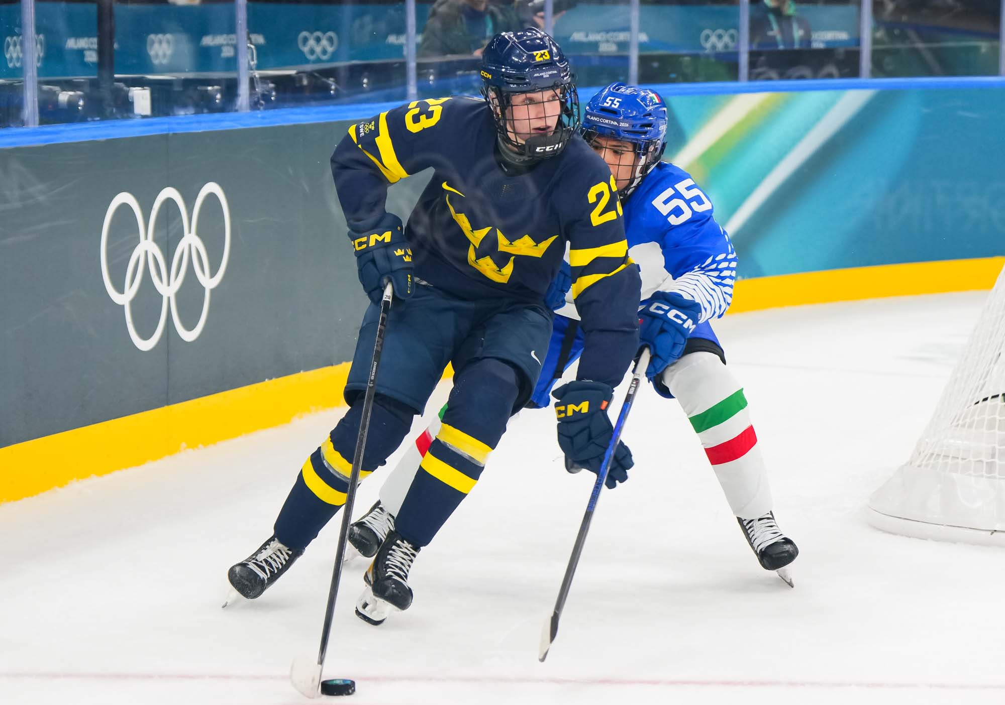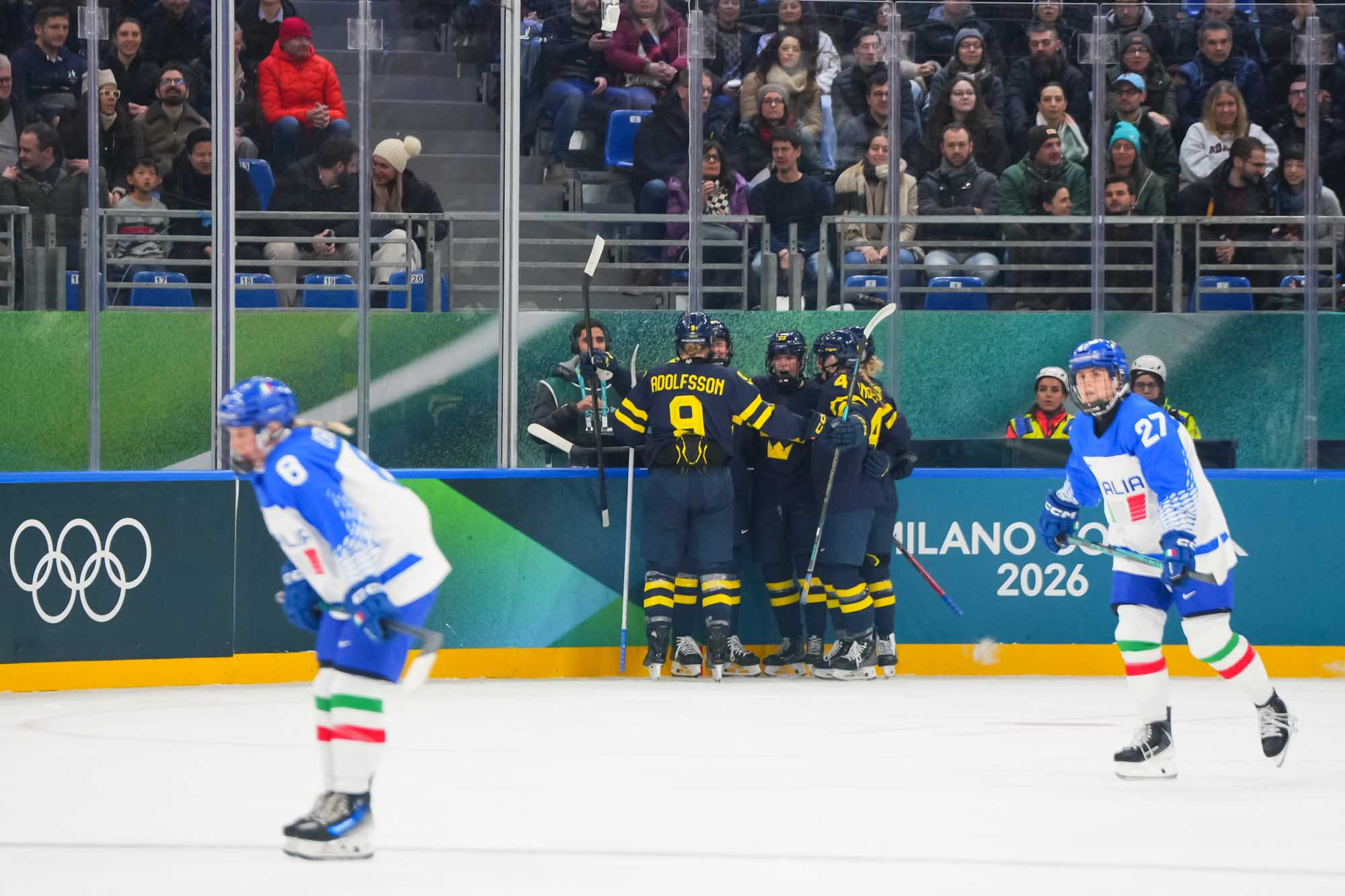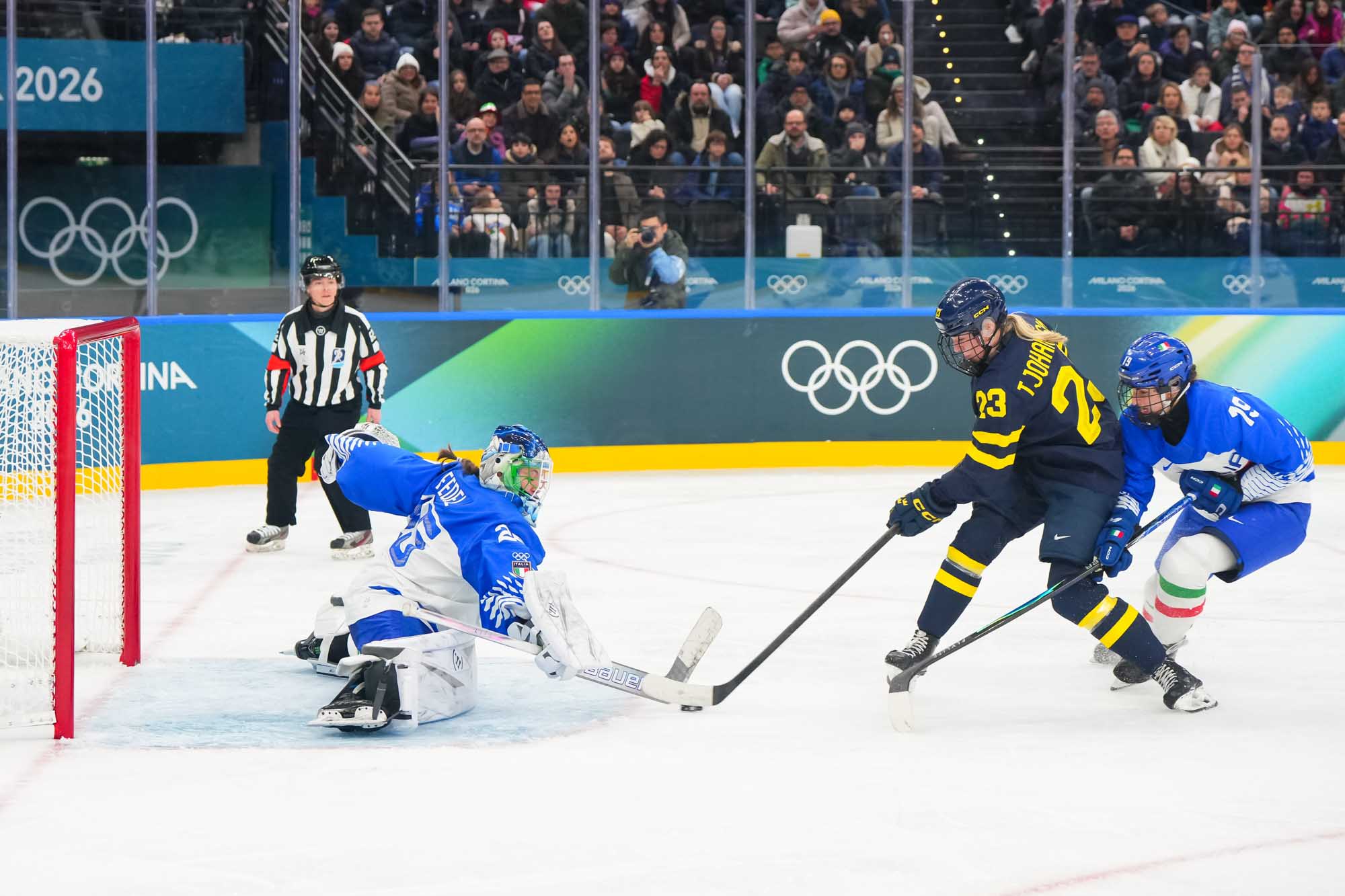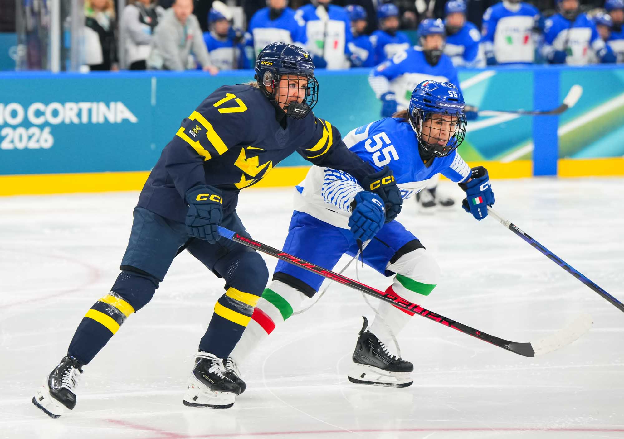 Sweden scored three goals in the second period and pulled away to defeat Italy to the tune of 6-1 this afternoon before a raucous crowd of 10,727. Thea Johansson had two goals and an assist, and she is now tied with German Laura Kluge for the tournament scoring lead with four points through two games.