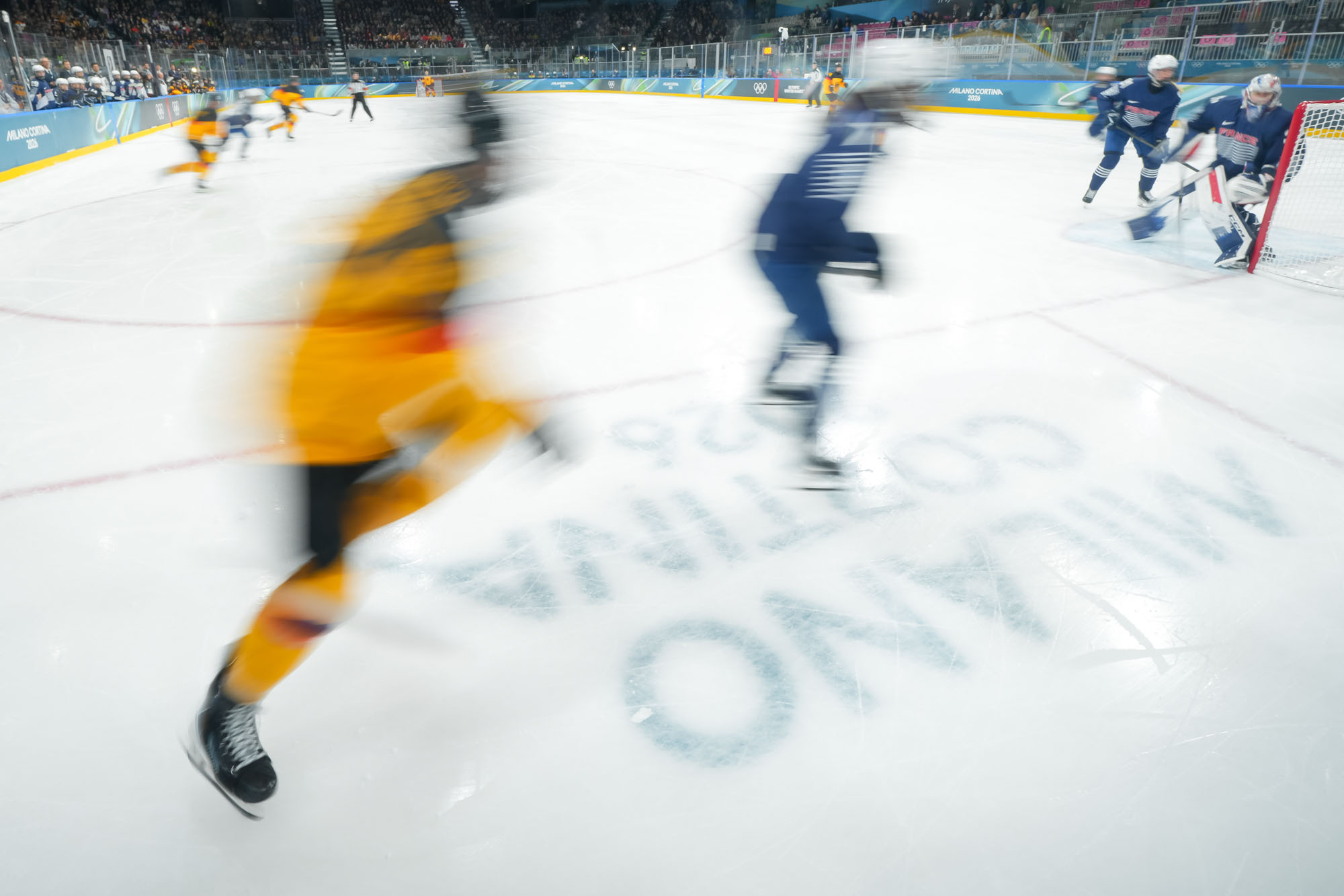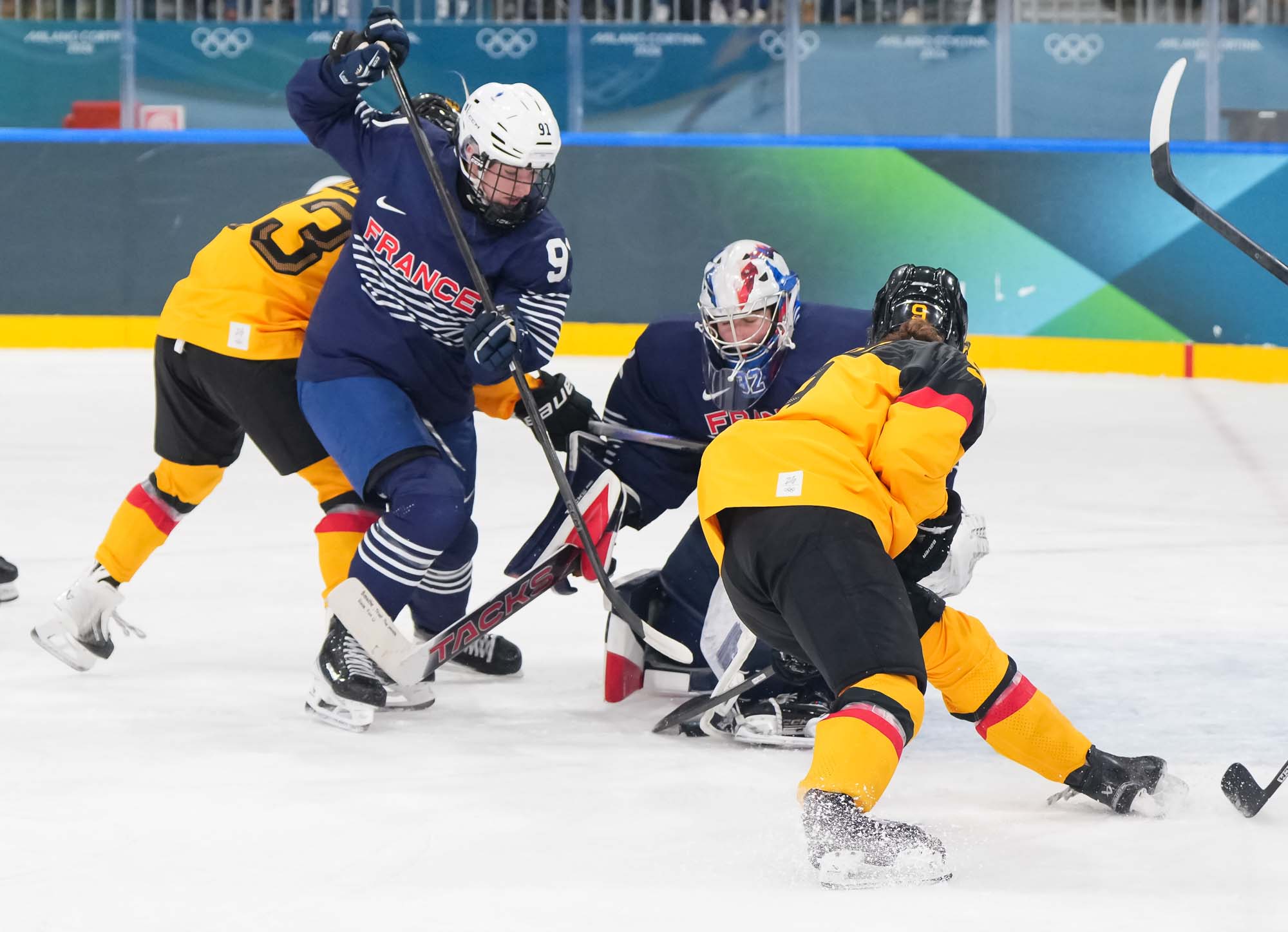 The Germans came out with purpose but were kept at bay by Philbert for much of the opening period. The French took four of the five penalties in the period, and although the penalty killing was perfect the first four times, they finally conceded a goal in the dying seconds.