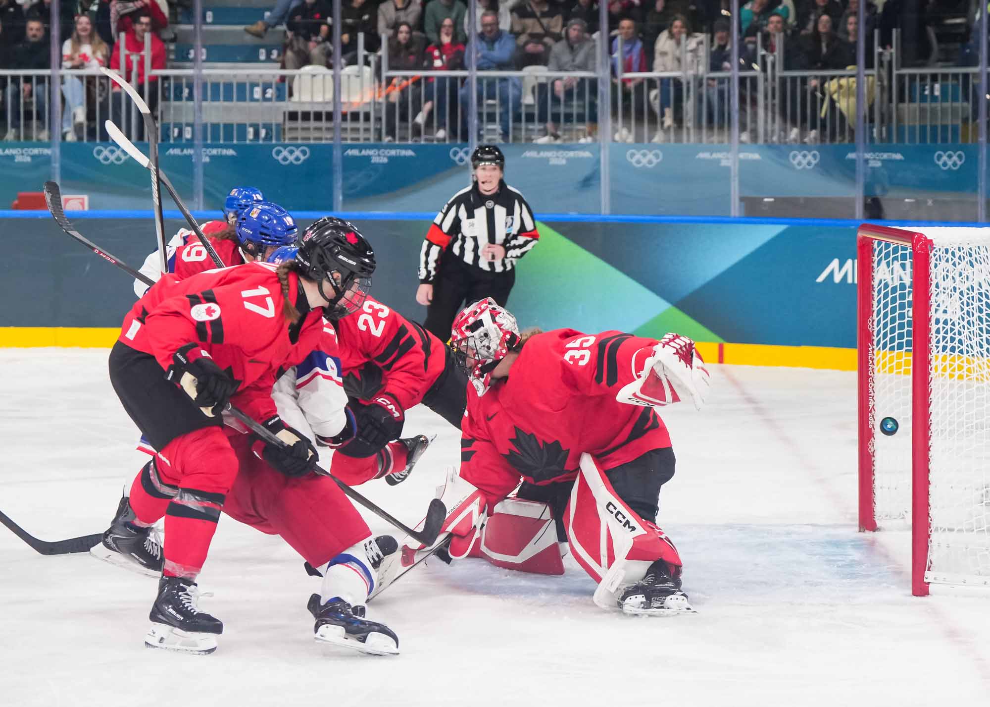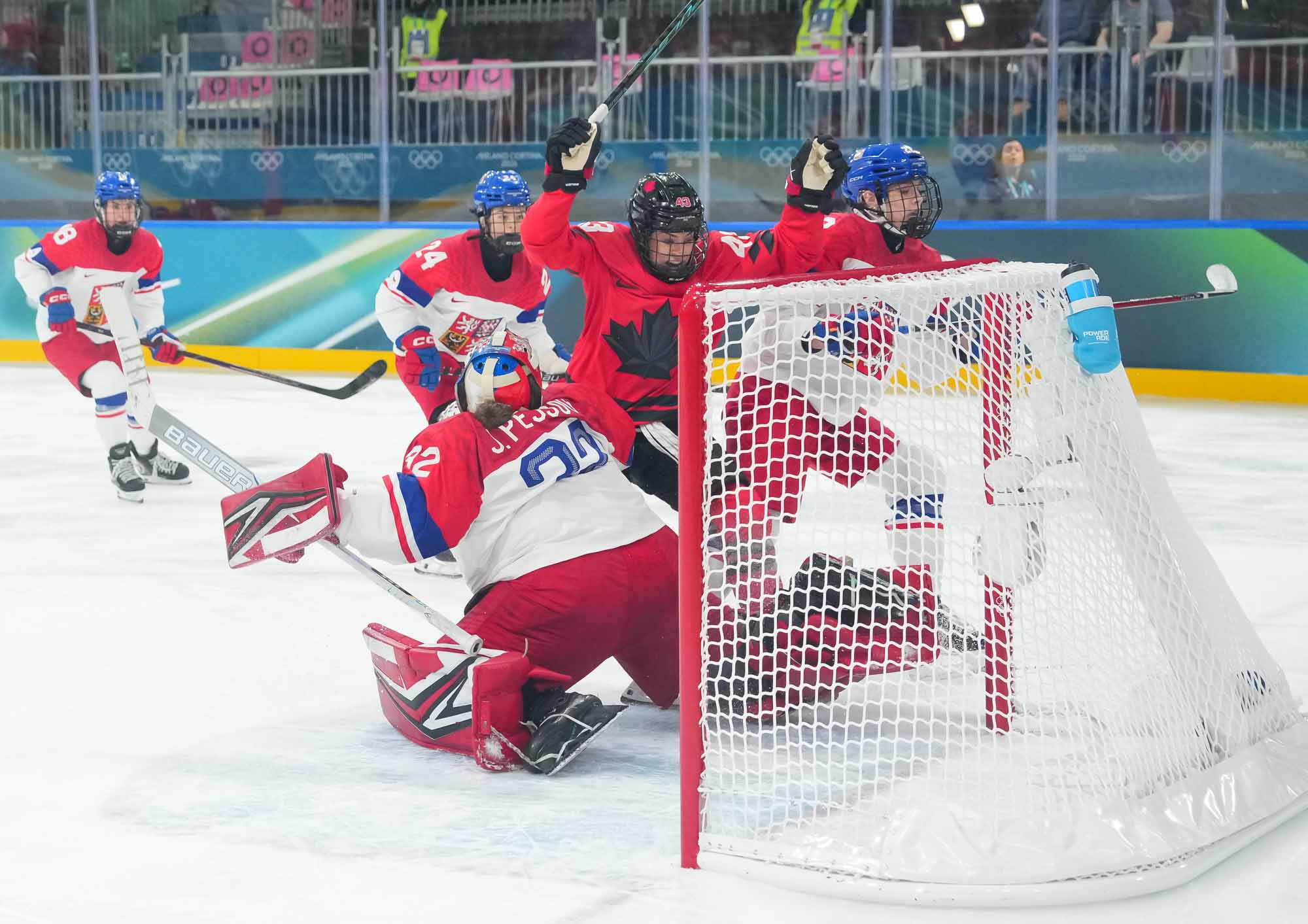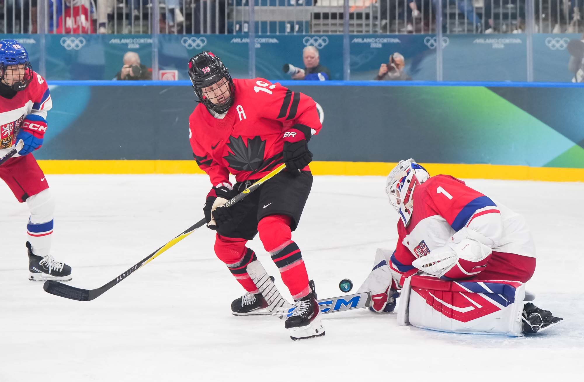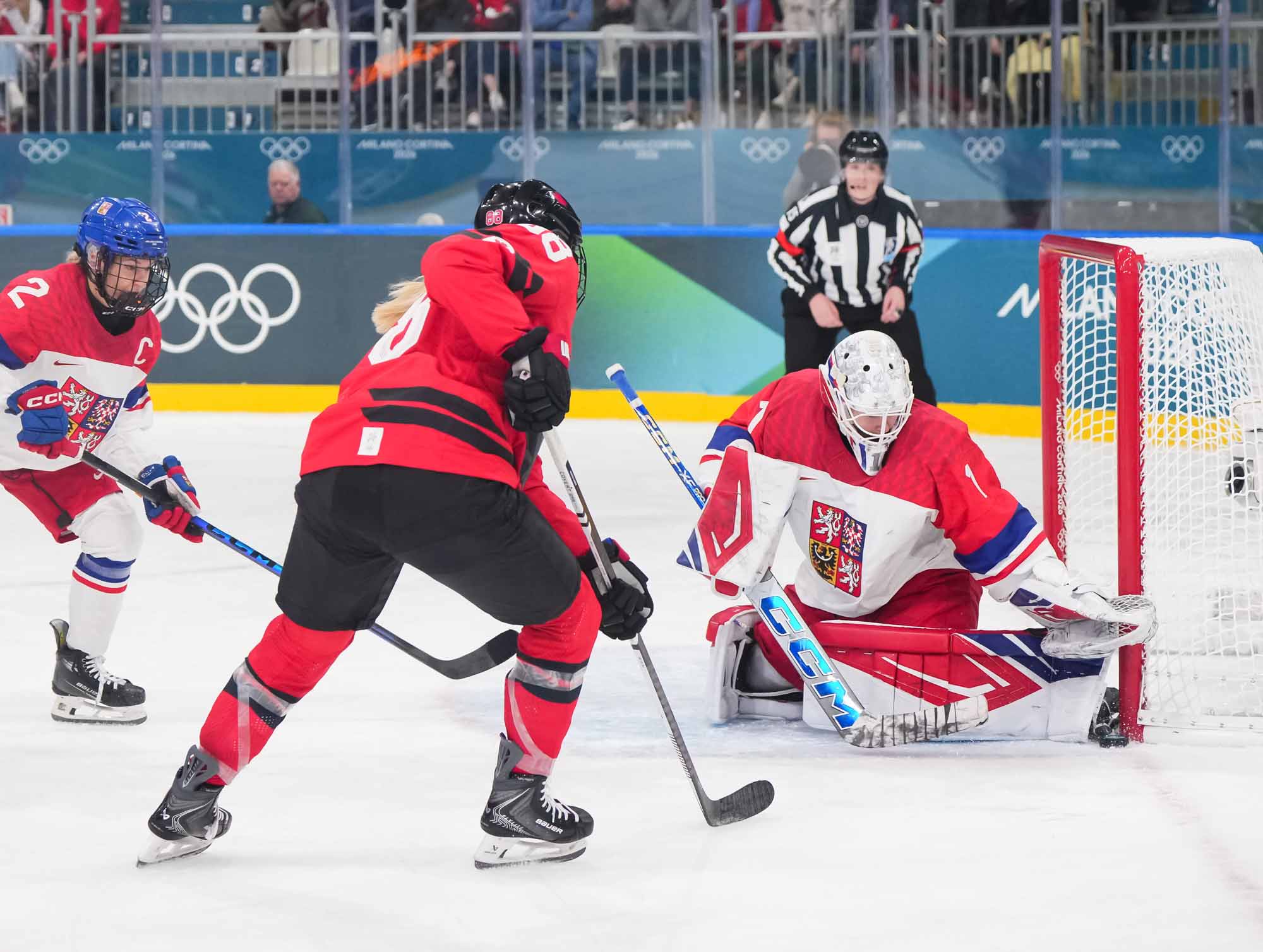 Early in the game, the Czechs went from having a great chance to trailing 1-0. They had a five-on-three for 64 seconds, but they couldn’t convert on the golden opportunity. Instead, when Renata Fast came out of the box to finish the second penalty, she got the puck and drove to the net on a partial break. Julie Pejsova made the save, but Kristin O’Neill batted in the rebound at 5:44 to give Canada the early lead.