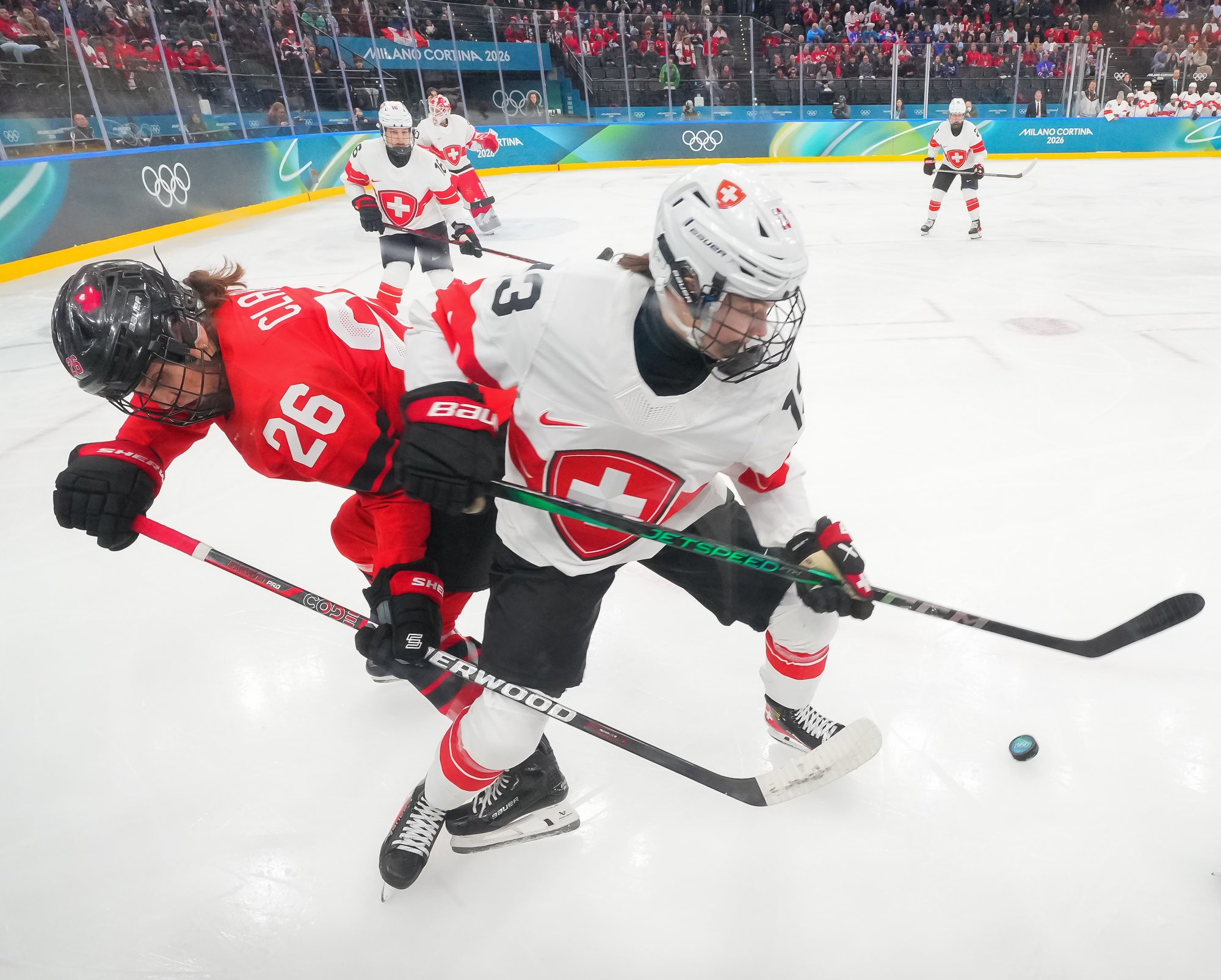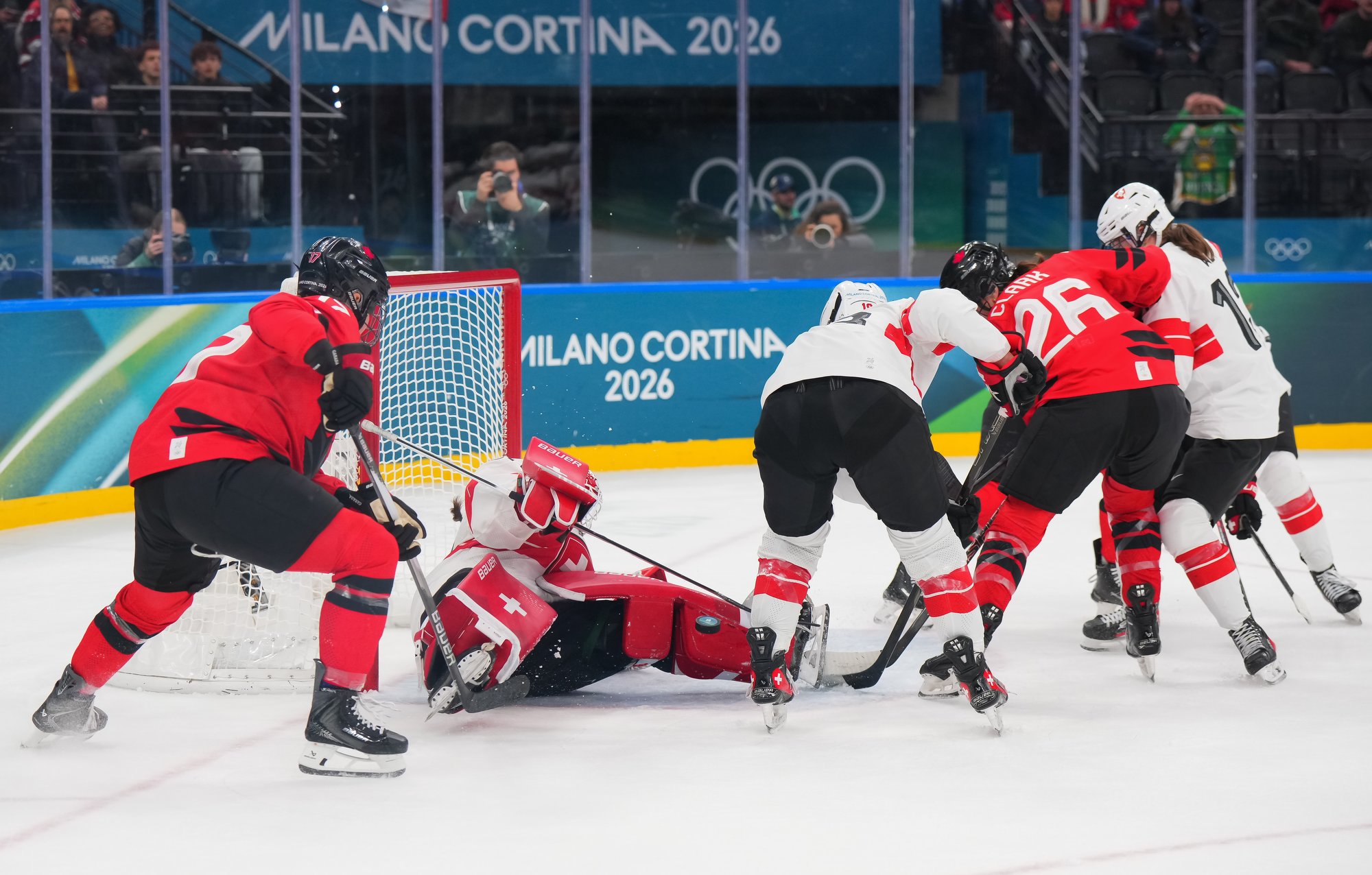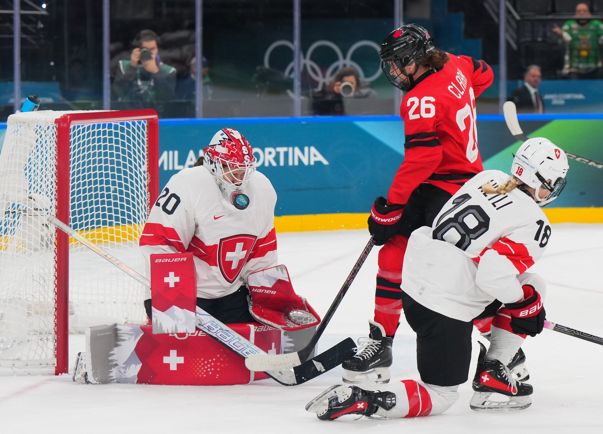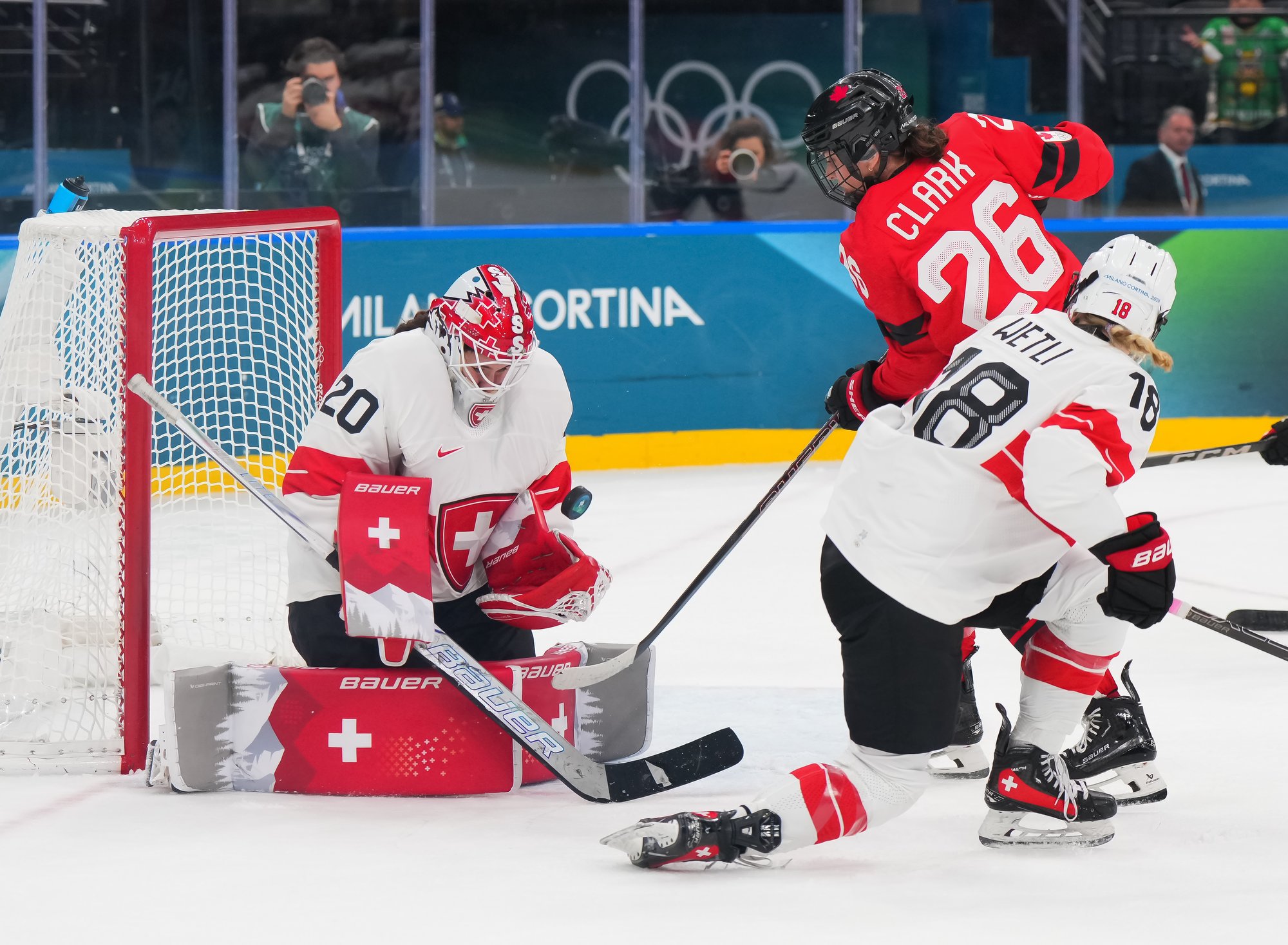 Although Canada dominated the opening period, they misfired on several excellent chances and failed to put a puck past Andrea Braendli. Laura Stacey made an early rush, cutting in on goal, but Braendli stood her ground. Daryl Watts nearly banked one in off the goalie, but that also didn’t quite work. Emily Clark made a tip off a pass from the crease, but that re-direct hit the post and stayed out.