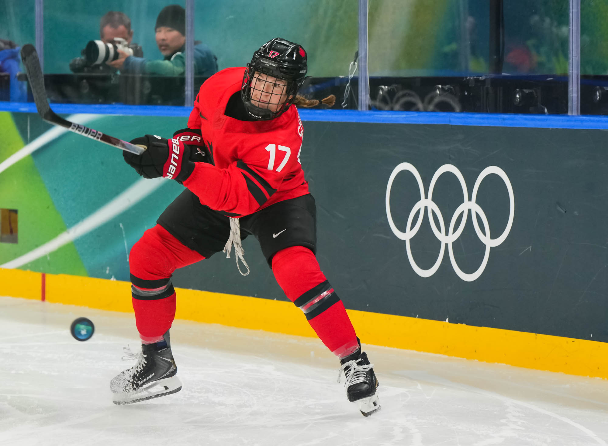 She took a quick shot from the point, but the puck hit Herzig on the way and bounced past Braendli at 1:49. This was Poulin’s 19th career Olympics goal, giving her sole possession of first place on this distinguished list.