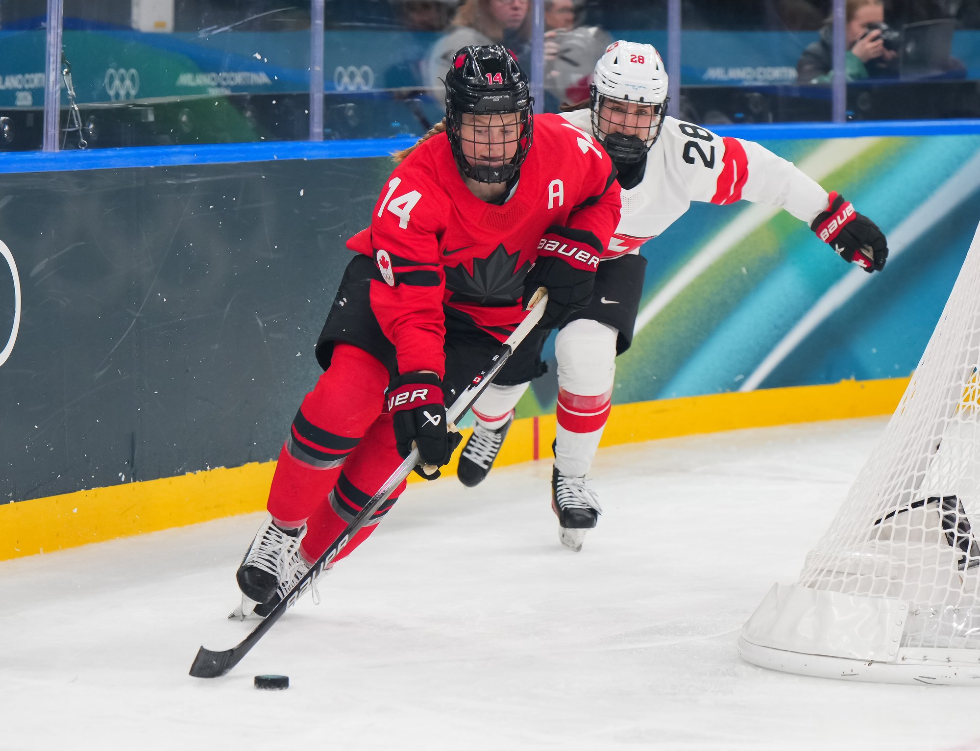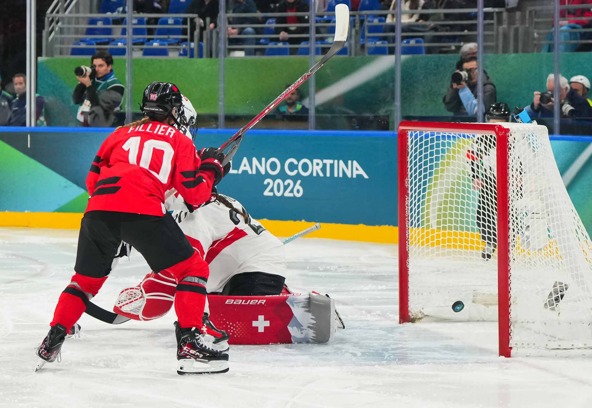 Early in the second it looked certain Poulin would open the scoring. She took a nice pass from Sarah Fillier in front of the goal, but her quick shot was gloved beautifully by Braendli. But hockey is a funny game. Poulin didn’t score on this great chance, but moments later she did score, on a flukey play.