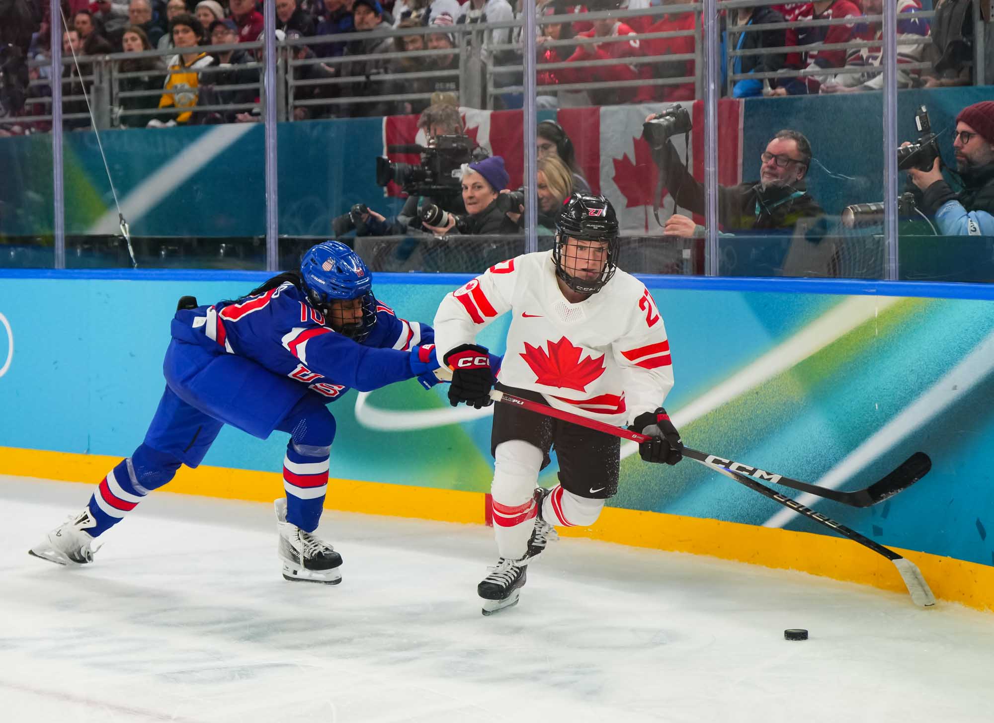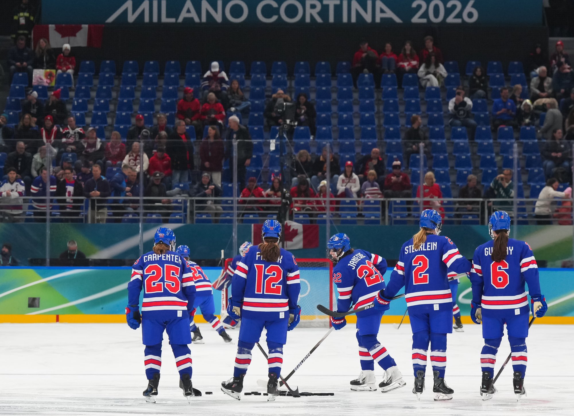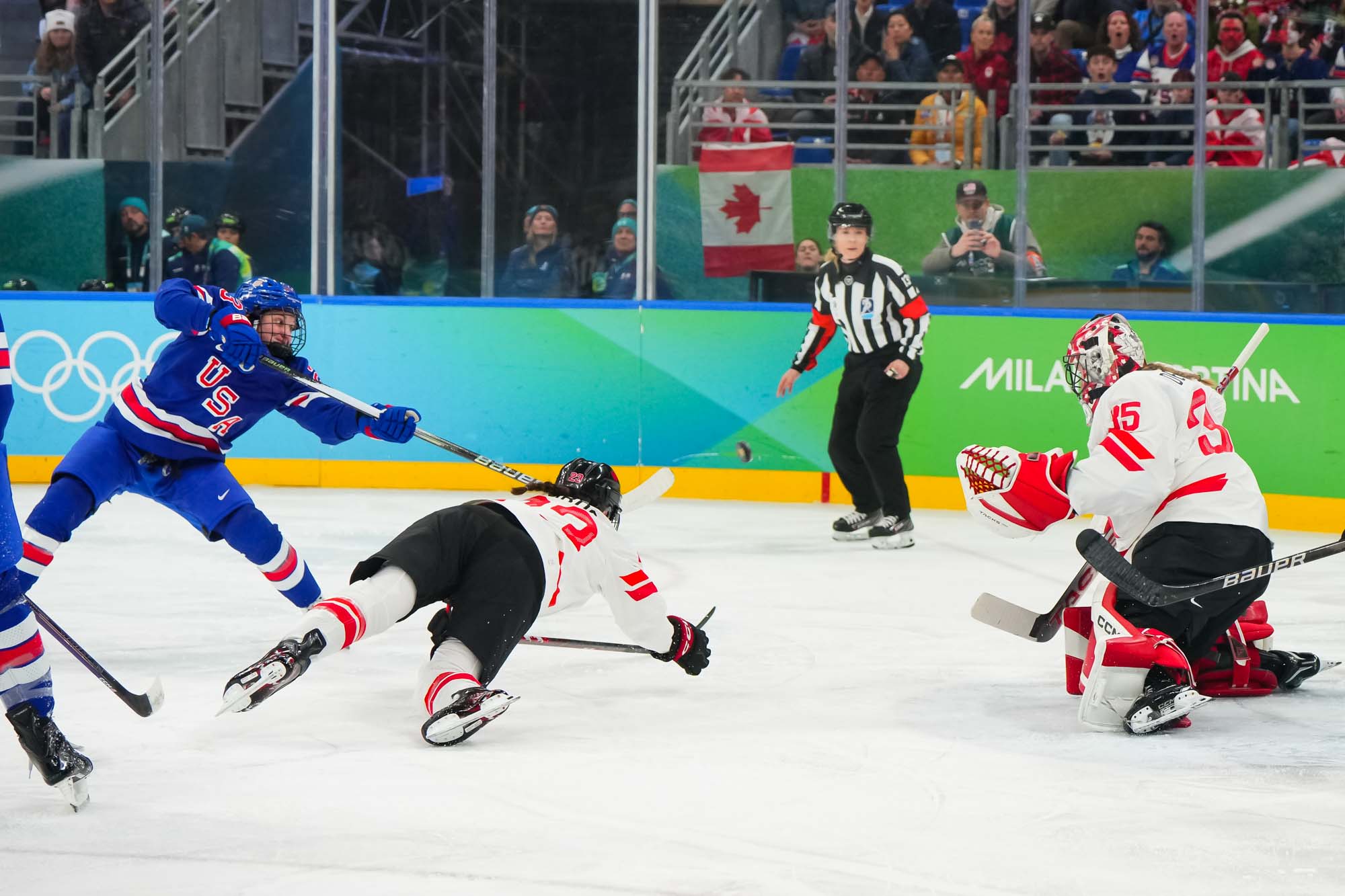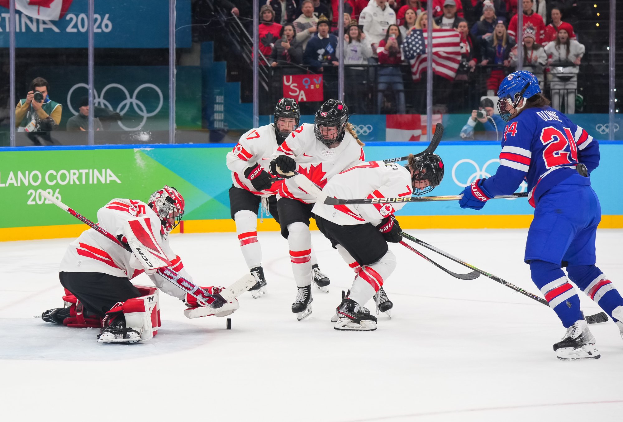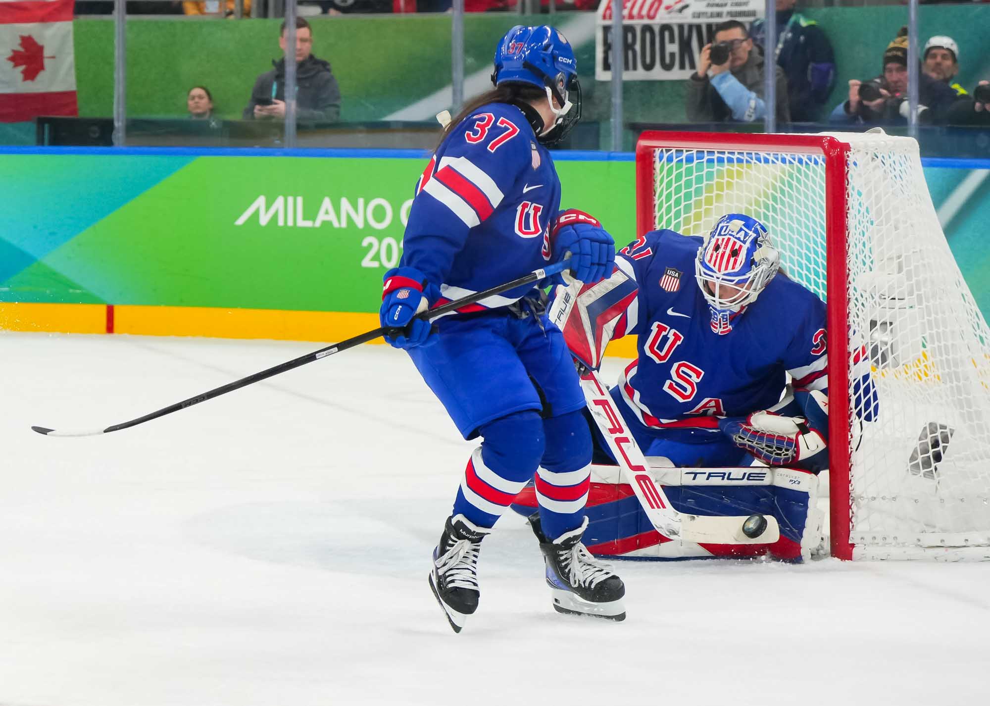Santagiulia was packed with screaming fans, split more or less evenly between the two nations, and they had plenty to cheer for right from the get-go. Canada’s biggest challenge was to negate the U.S.’s flow and speed. To that end, they dumped the puck in and made the American defence chase the puck. In trouble in their own end, they cleared the puck to open ice, again forcing the Americans to chase down every loose puck. One-on-one battles along the boards? Not so much. Canada wasn’t interested.