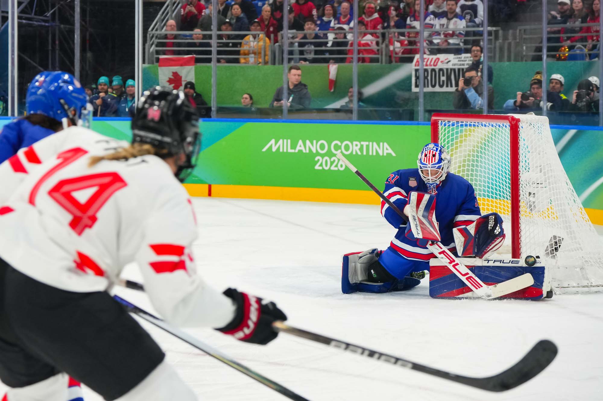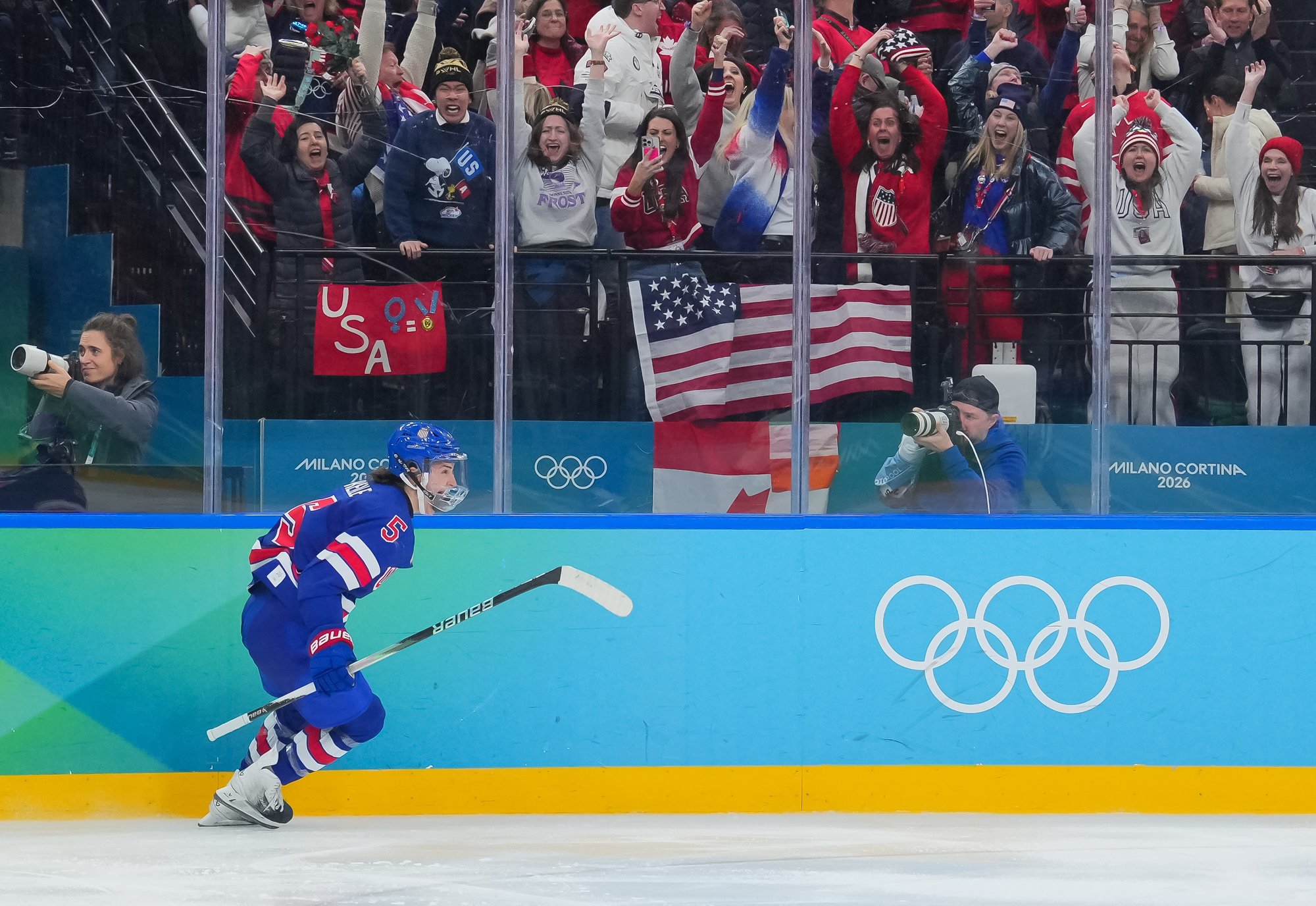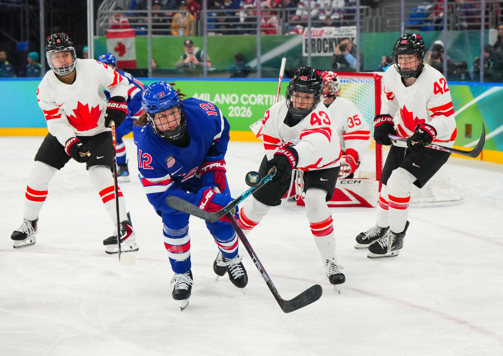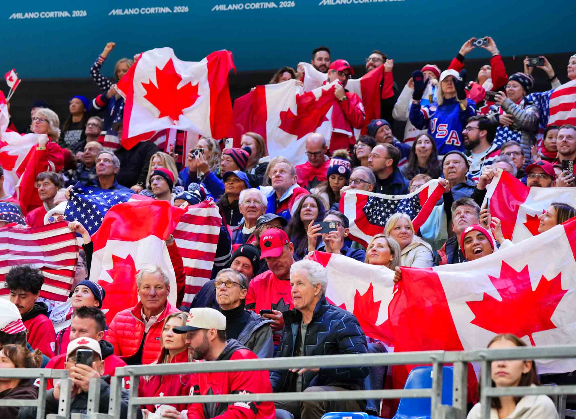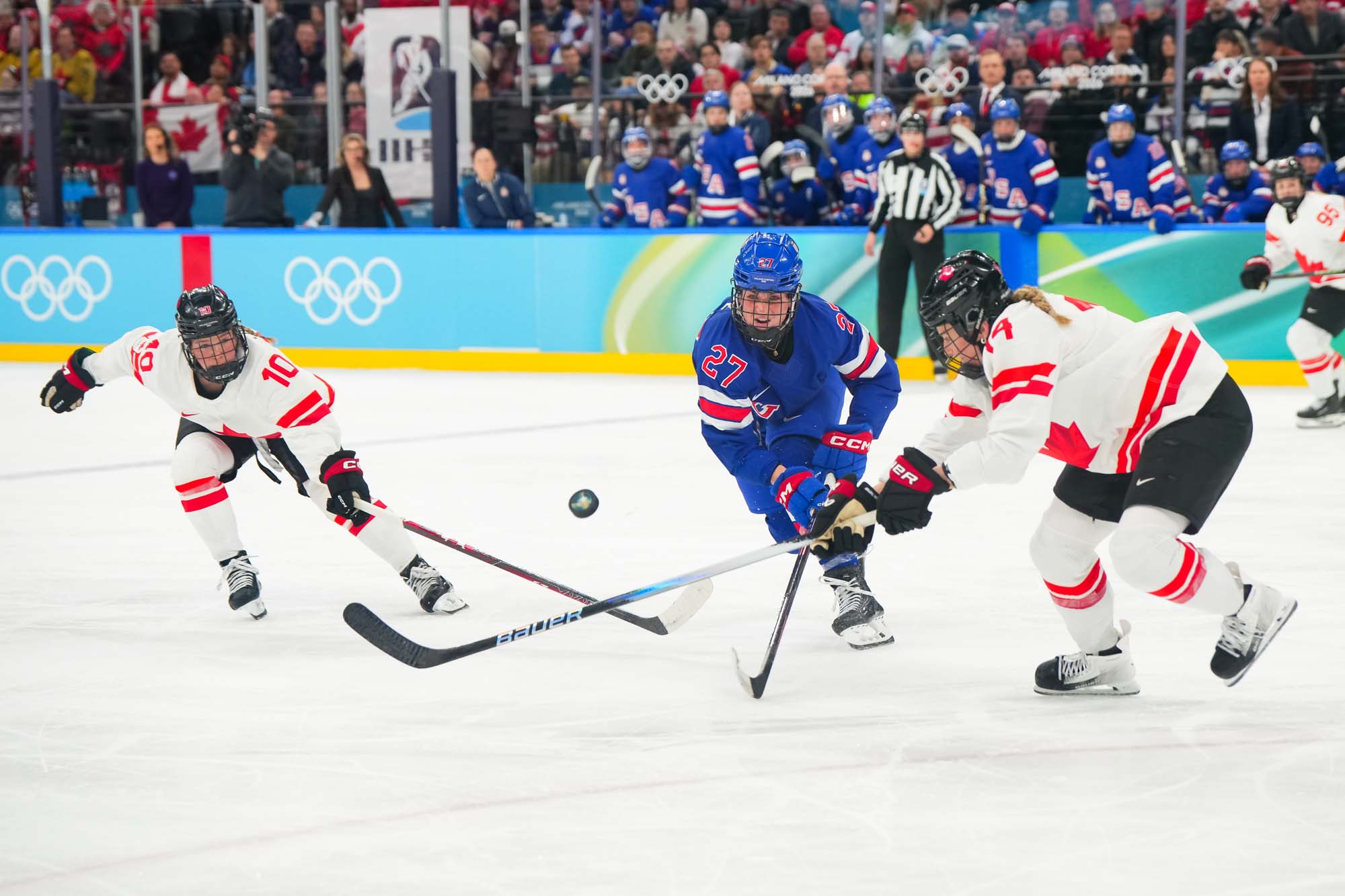 Santagiulia was packed with screaming fans, split more or less evenly between the two nations, and they had plenty to cheer for right from the get-go. Canada’s biggest challenge was to negate the U.S.’s flow and speed. To that end, they dumped the puck in and made the American defence chase the puck. In trouble in their own end, they cleared the puck to open ice, again forcing the Americans to chase down every loose puck. One-on-one battles along the boards? Not so much. Canada wasn’t interested.