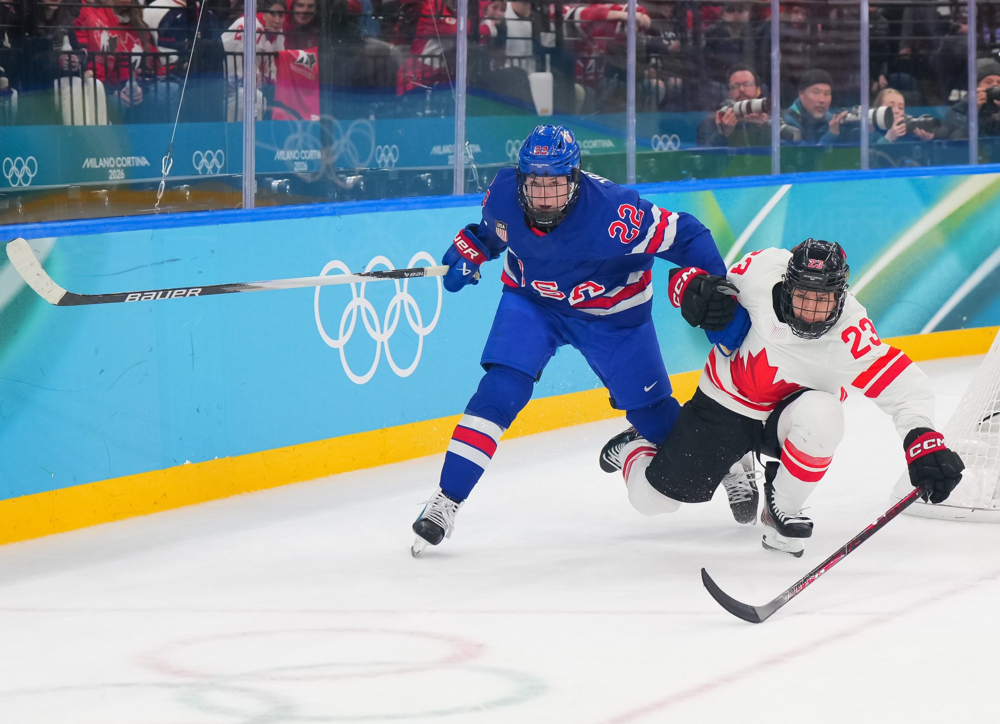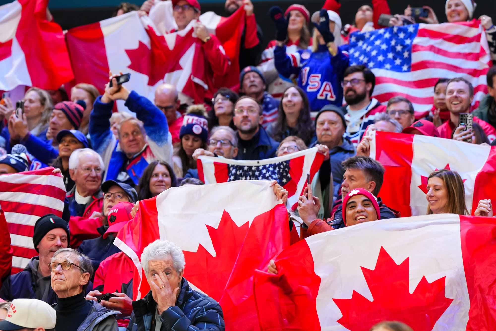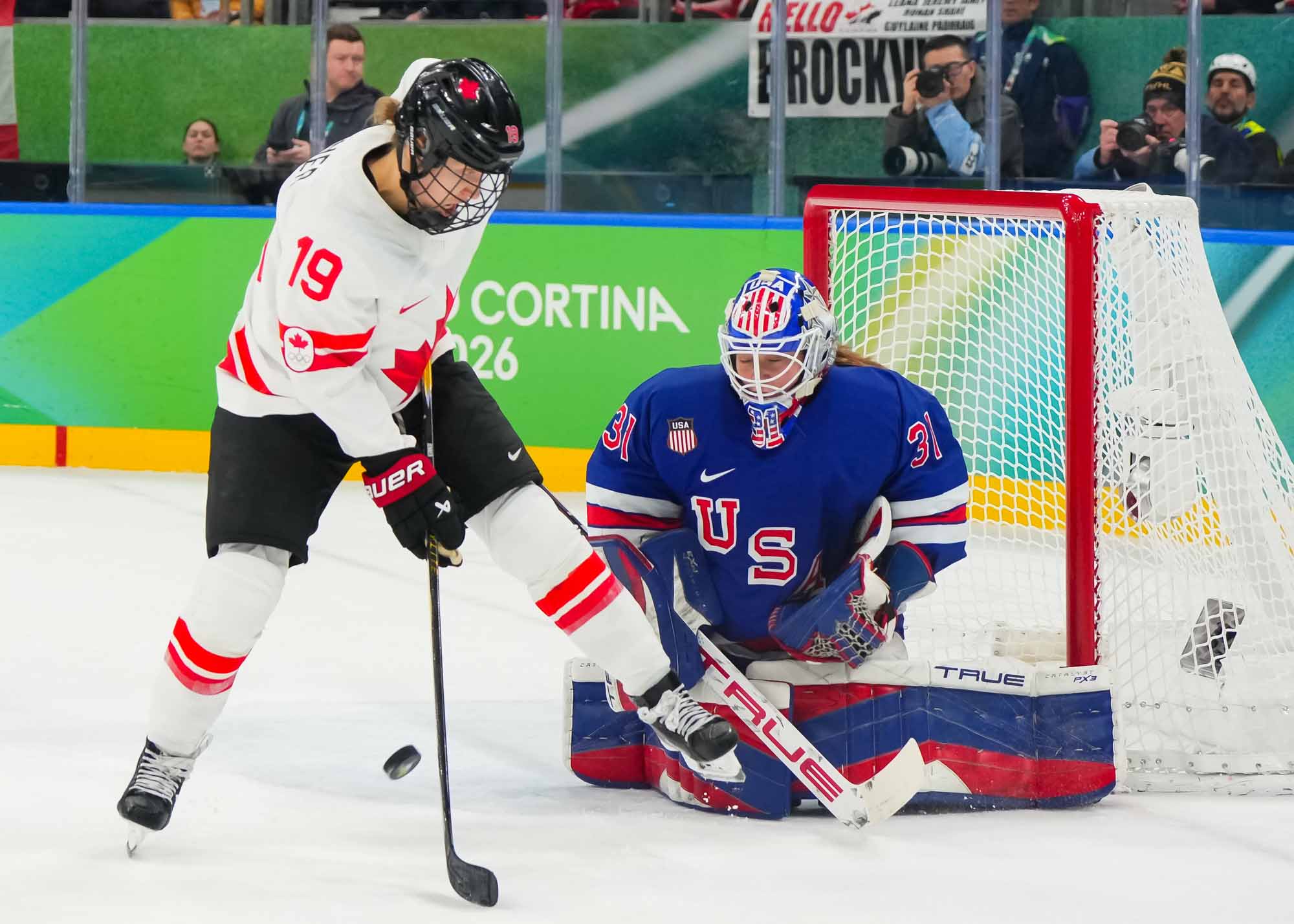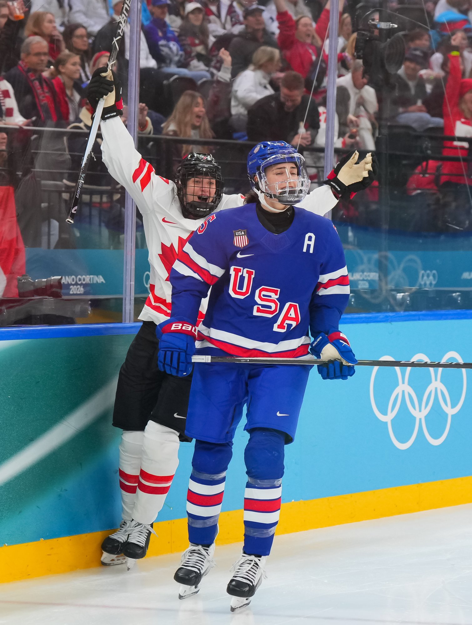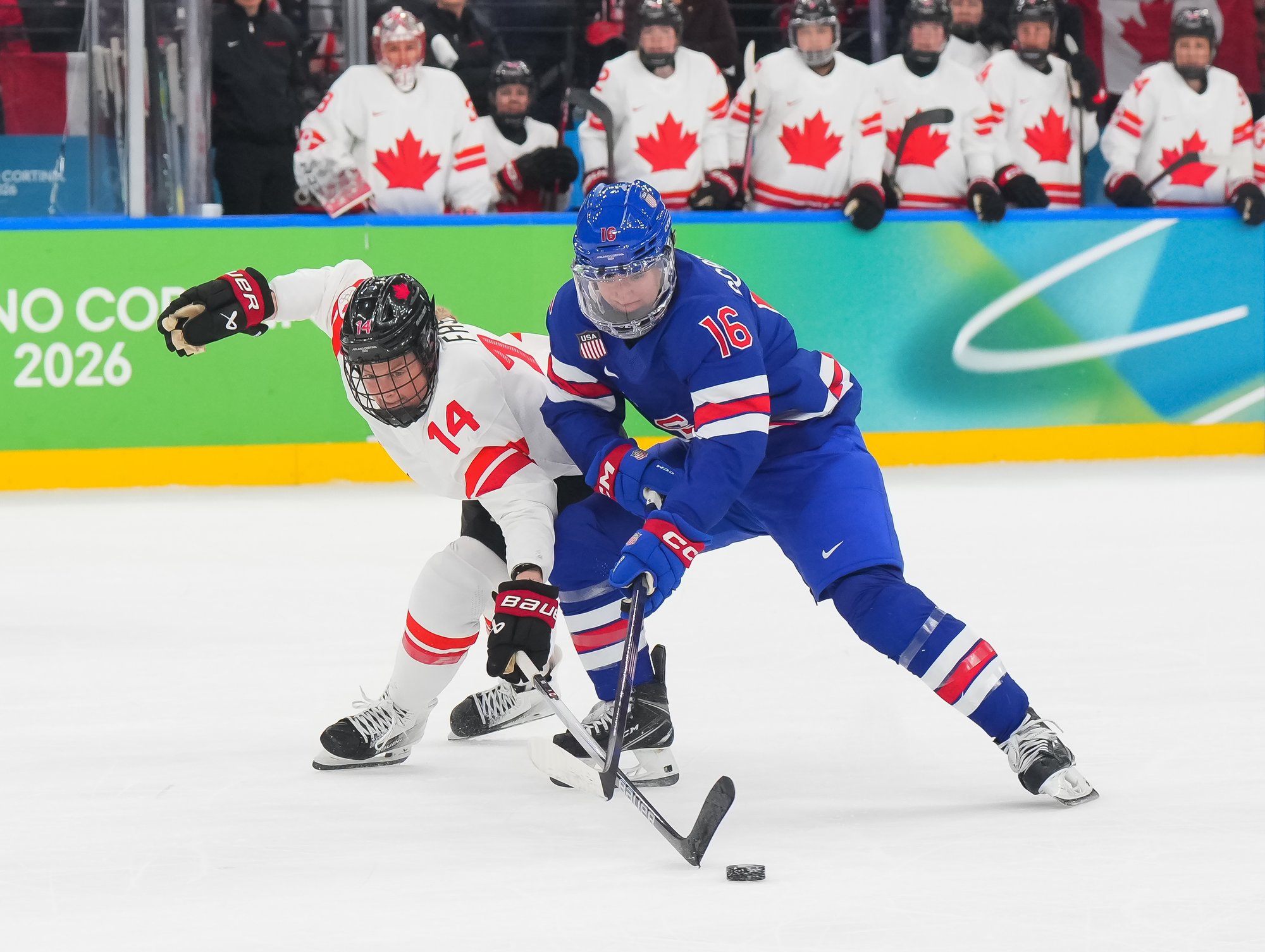 Santagiulia was packed with screaming fans, split more or less evenly between the two nations, and they had plenty to cheer for right from the get-go. Canada’s biggest challenge was to negate the U.S.’s flow and speed. To that end, they dumped the puck in and made the American defence chase the puck. In trouble in their own end, they cleared the puck to open ice, again forcing the Americans to chase down every loose puck. One-on-one battles along the boards? Not so much. Canada wasn’t interested.