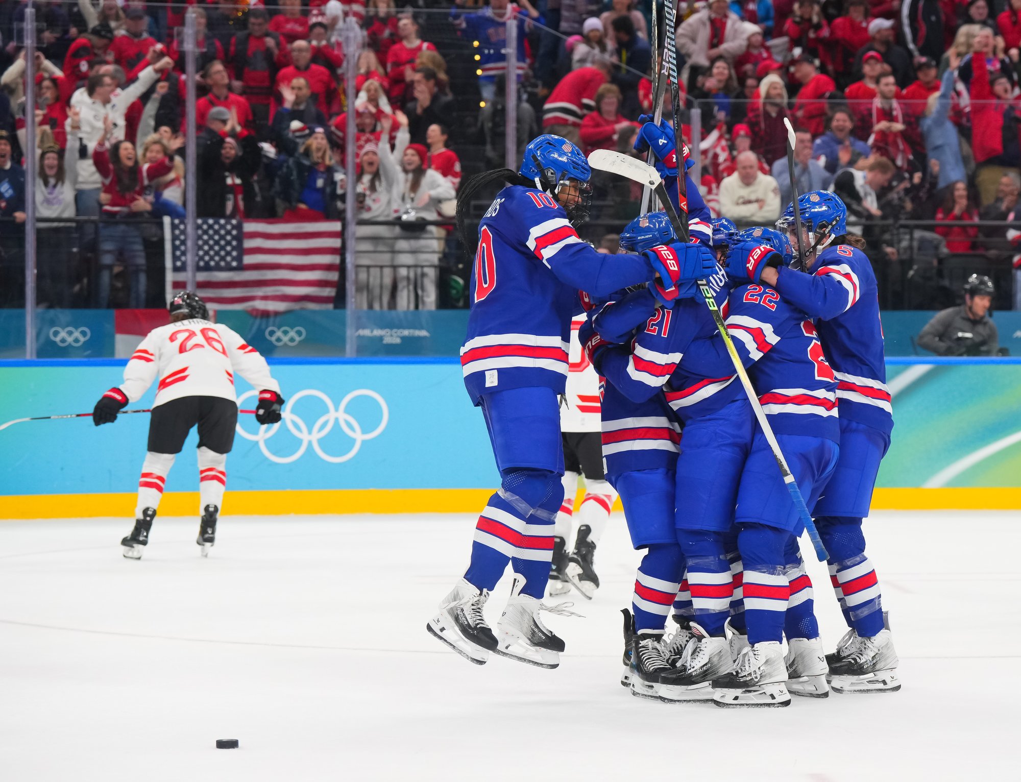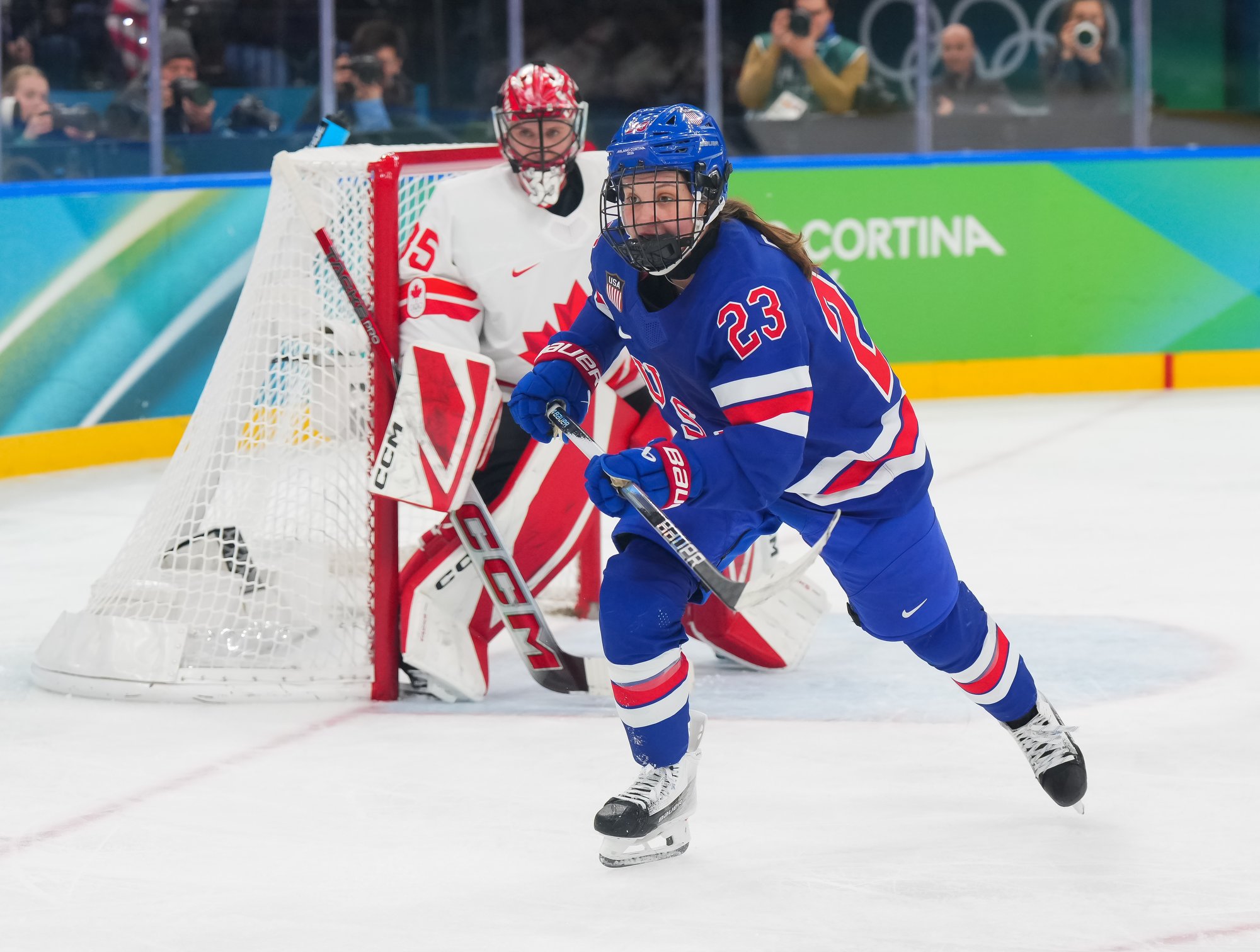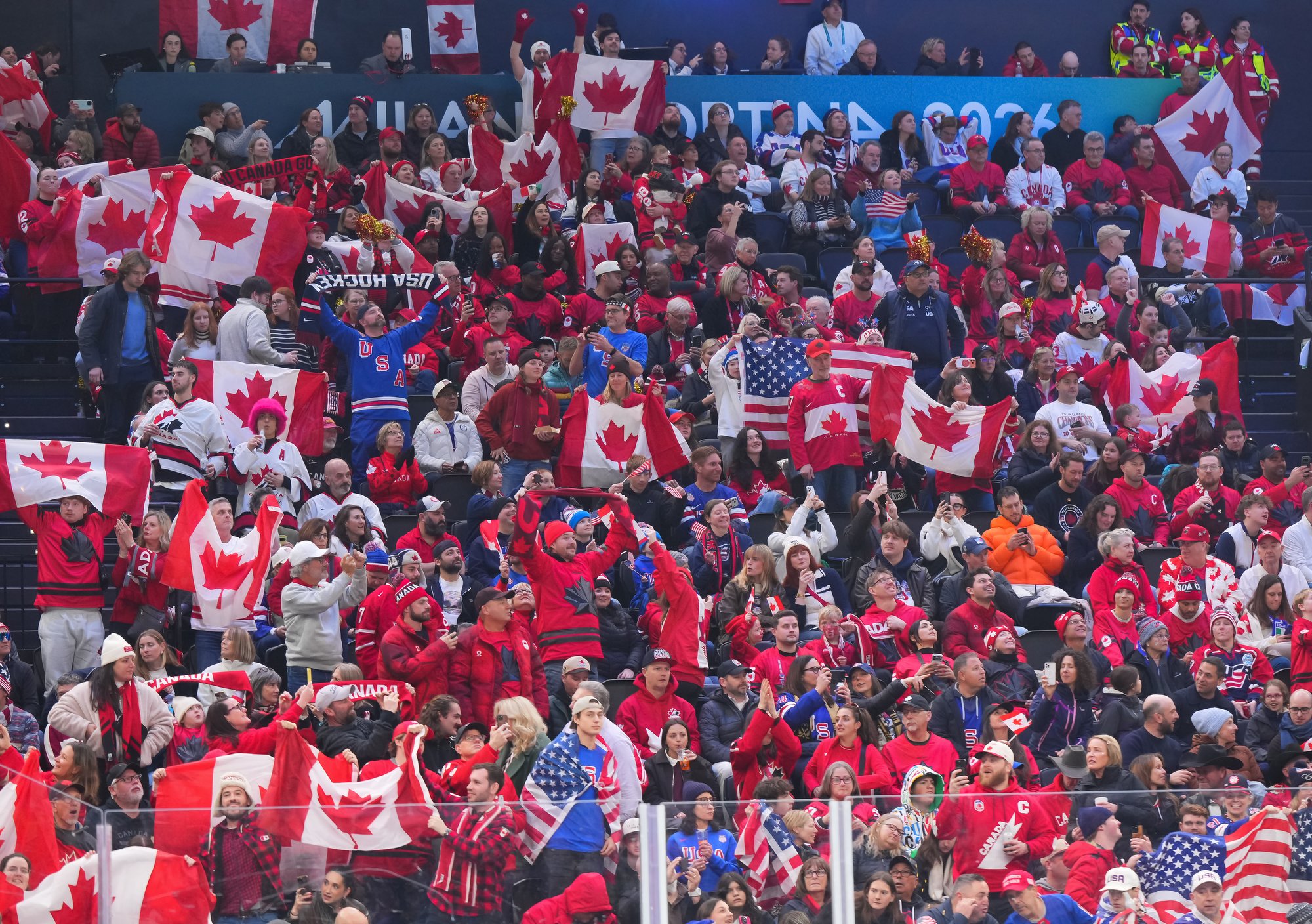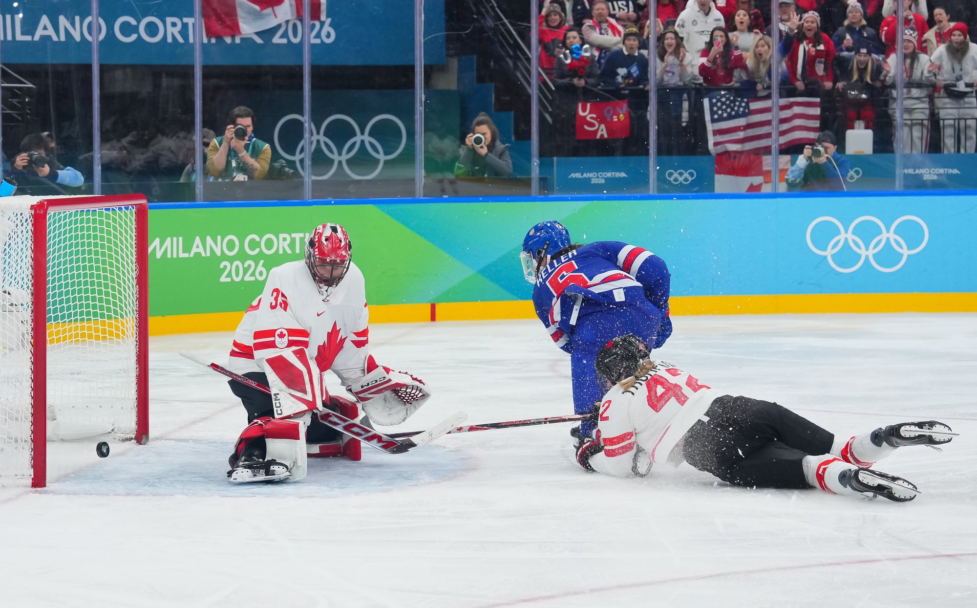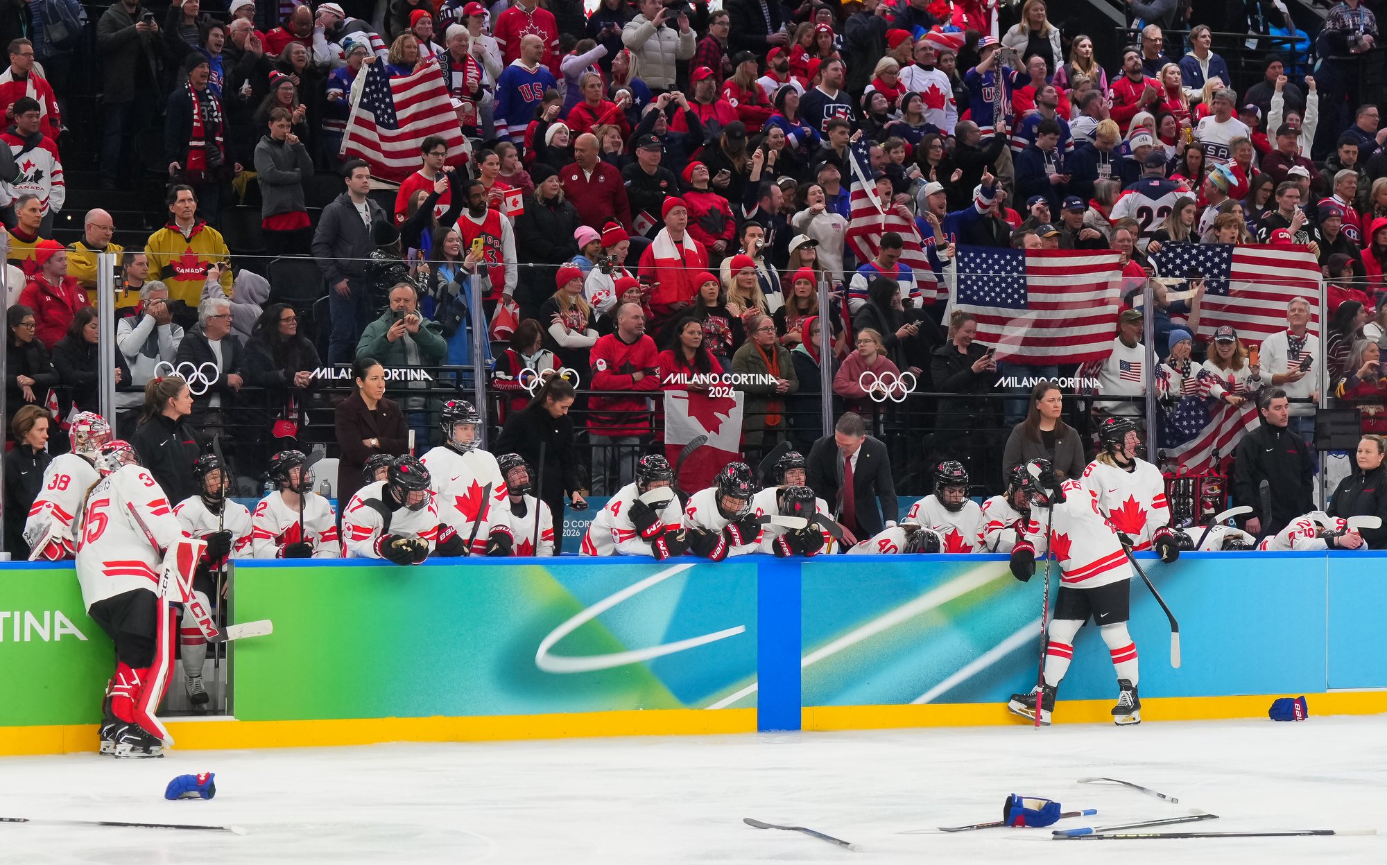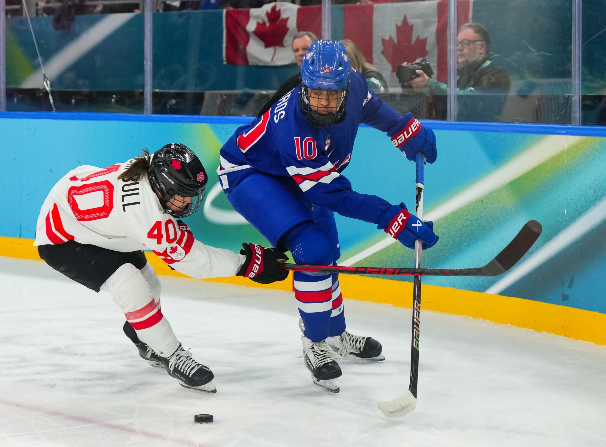 Santagiulia was packed with screaming fans, split more or less evenly between the two nations, and they had plenty to cheer for right from the get-go. Canada’s biggest challenge was to negate the U.S.’s flow and speed. To that end, they dumped the puck in and made the American defence chase the puck. In trouble in their own end, they cleared the puck to open ice, again forcing the Americans to chase down every loose puck. One-on-one battles along the boards? Not so much. Canada wasn’t interested.