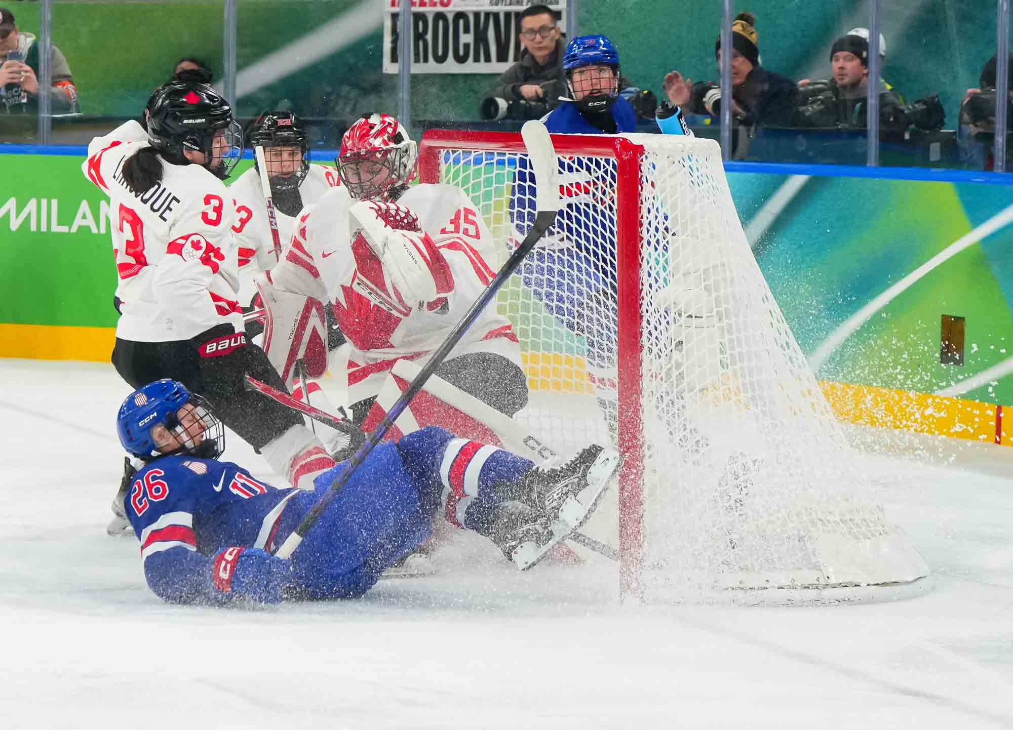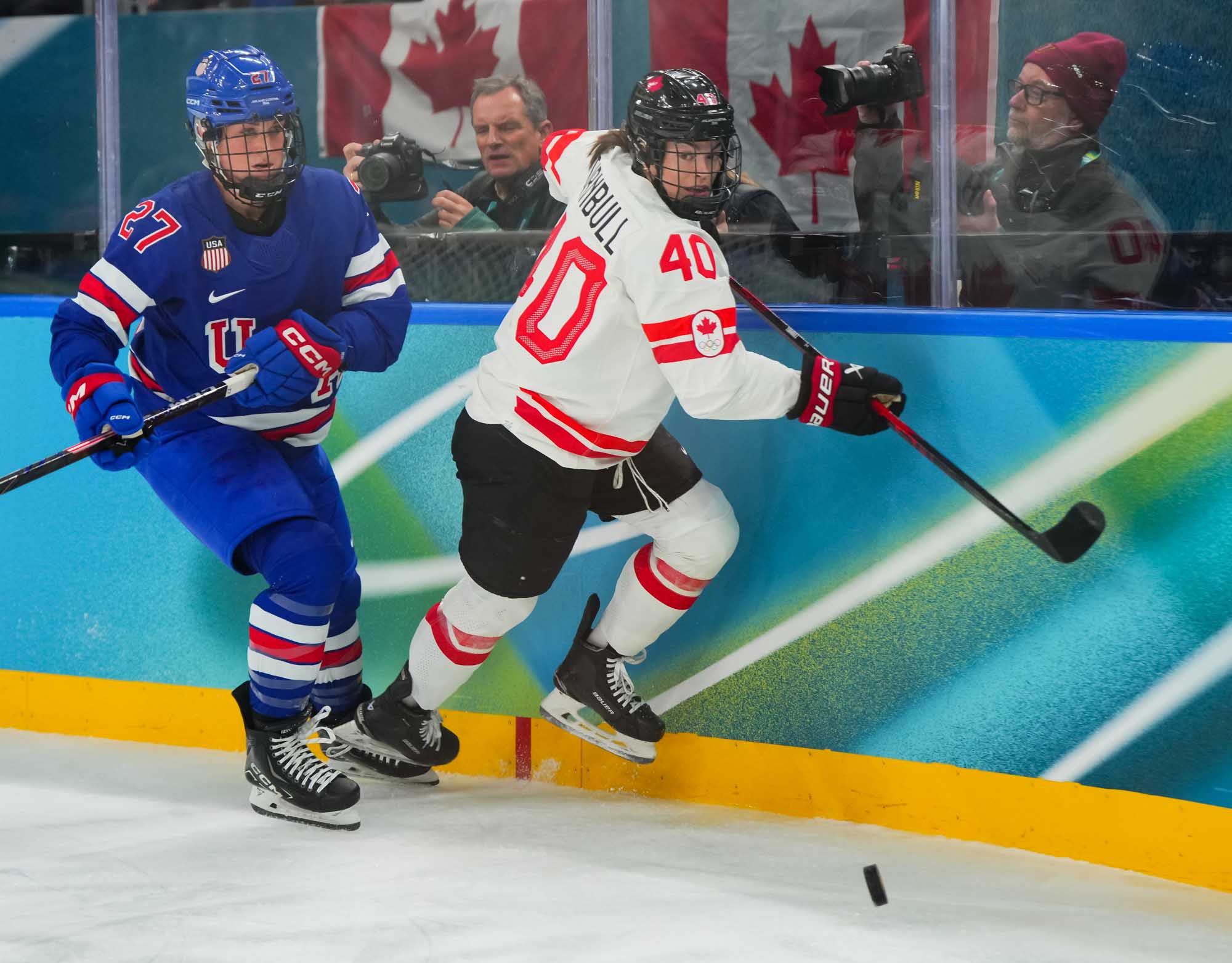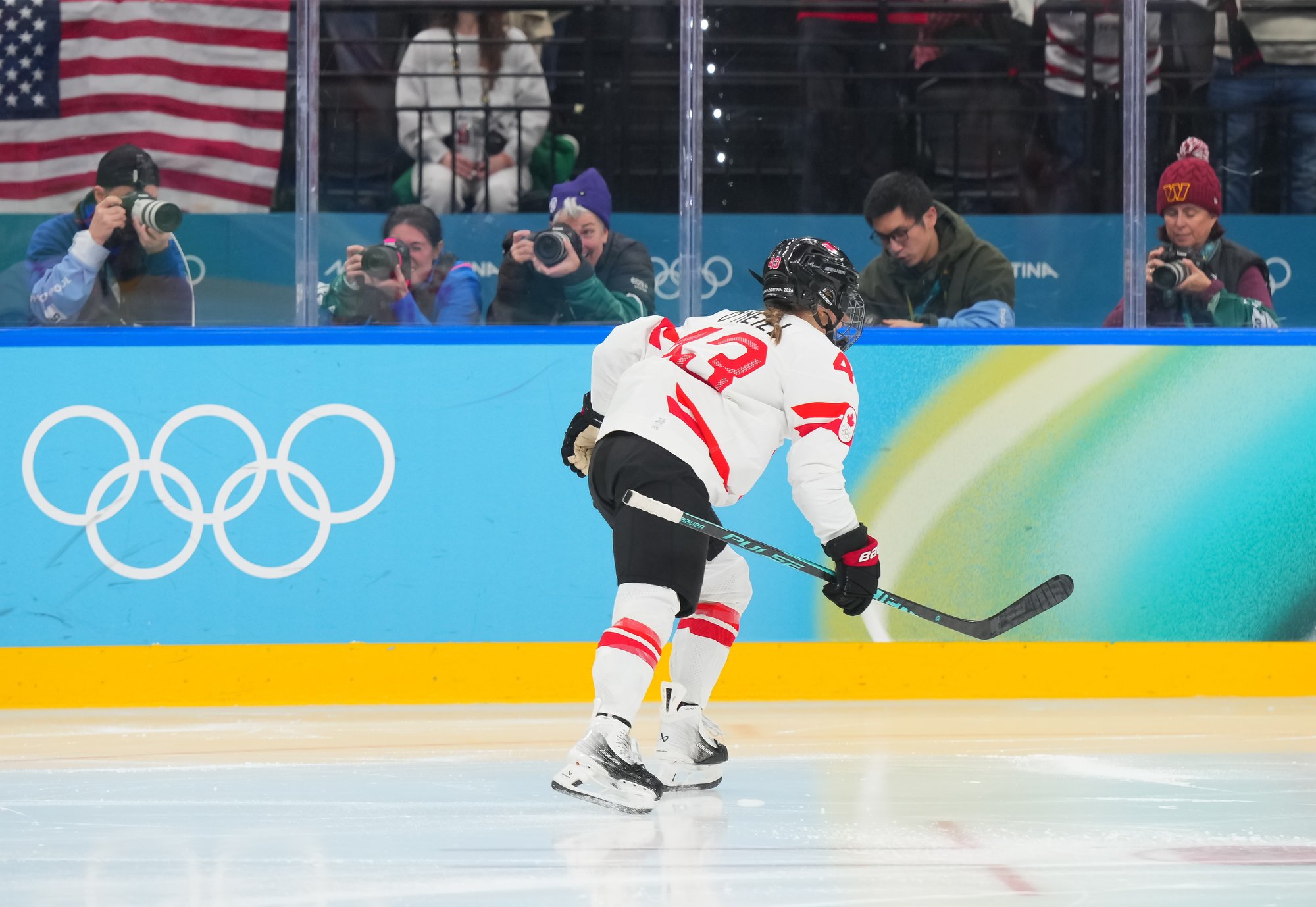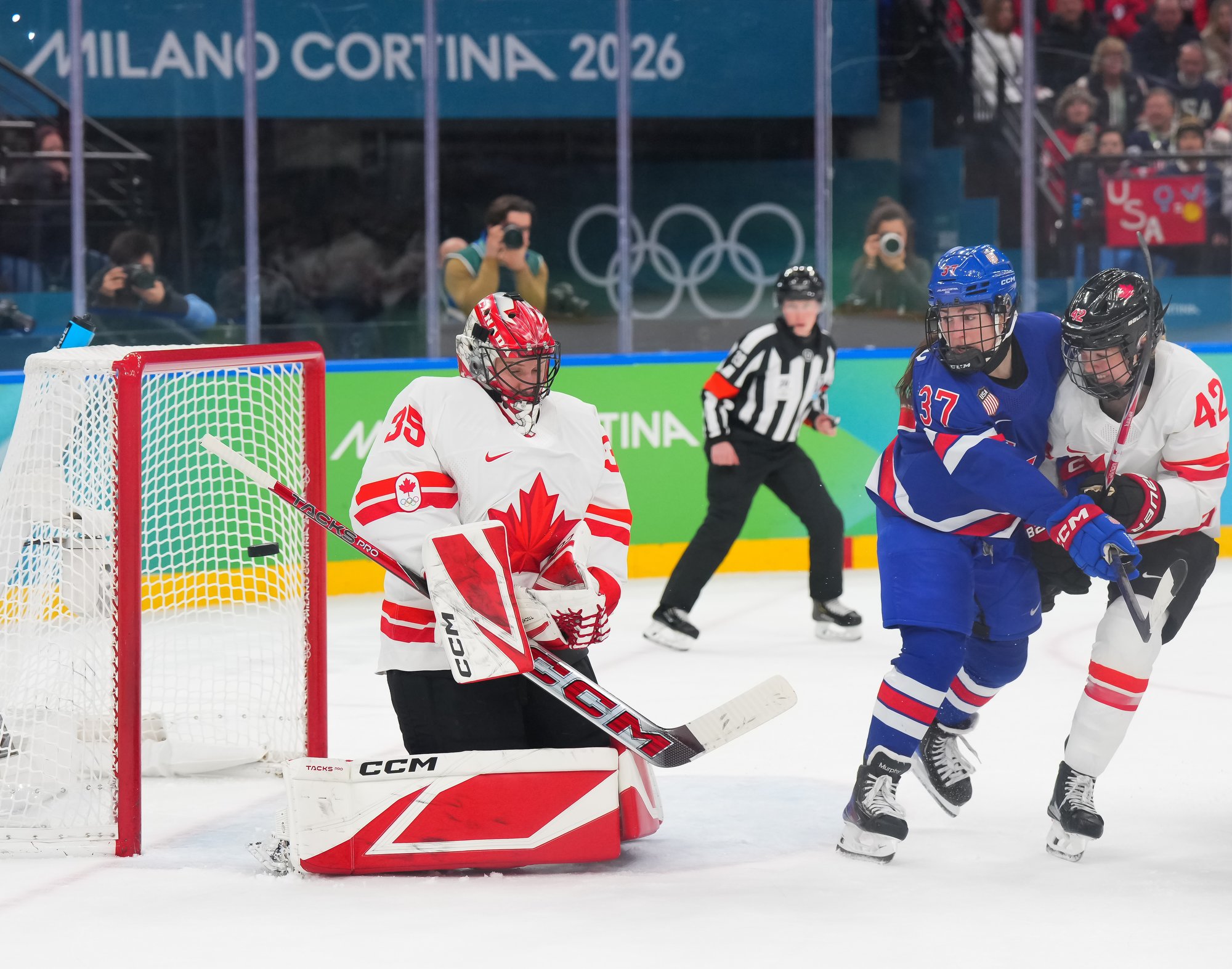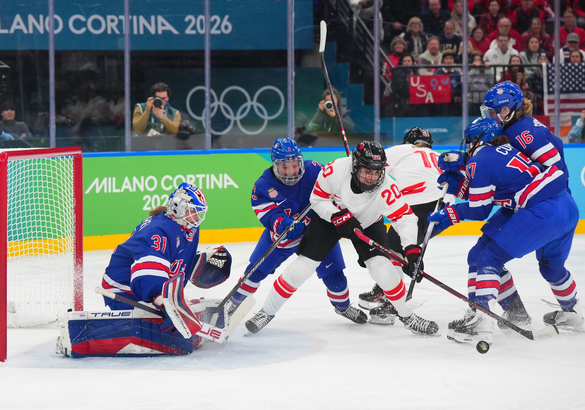 Santagiulia was packed with screaming fans, split more or less evenly between the two nations, and they had plenty to cheer for right from the get-go. Canada’s biggest challenge was to negate the U.S.’s flow and speed. To that end, they dumped the puck in and made the American defence chase the puck. In trouble in their own end, they cleared the puck to open ice, again forcing the Americans to chase down every loose puck. One-on-one battles along the boards? Not so much. Canada wasn’t interested.