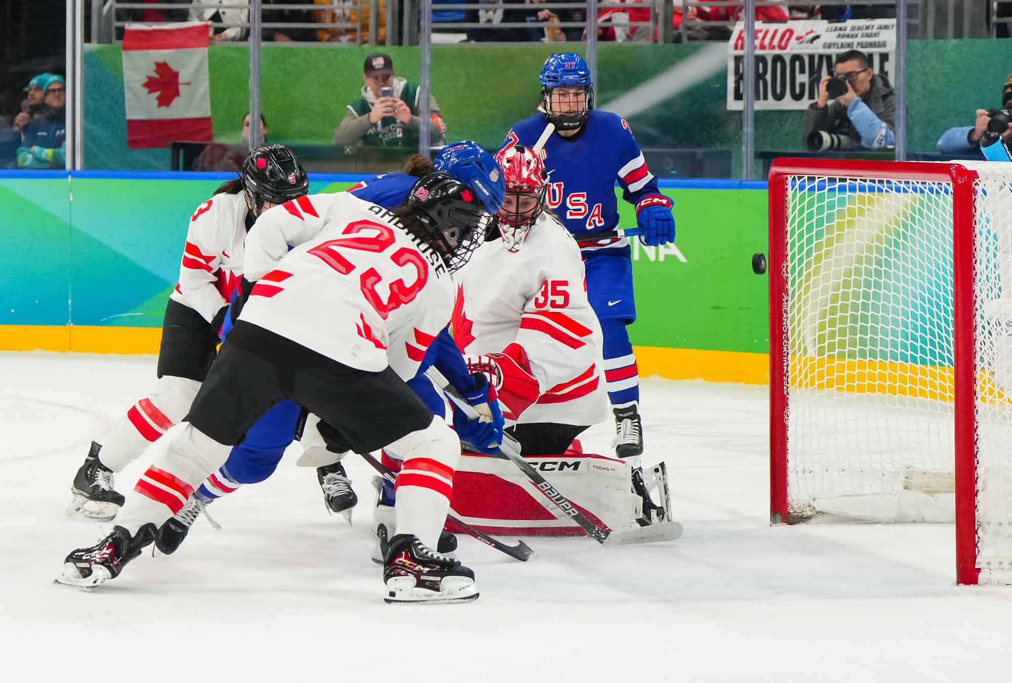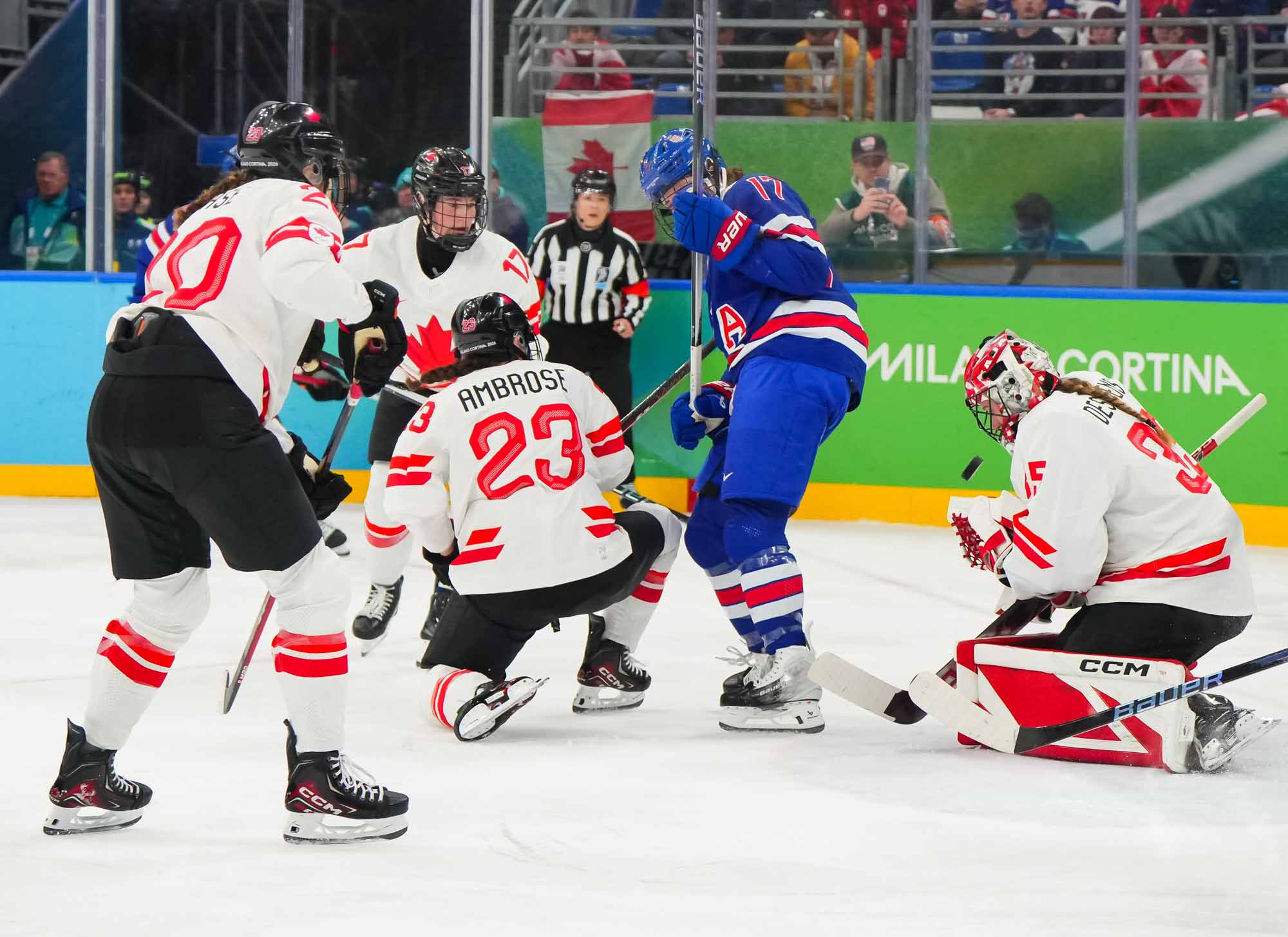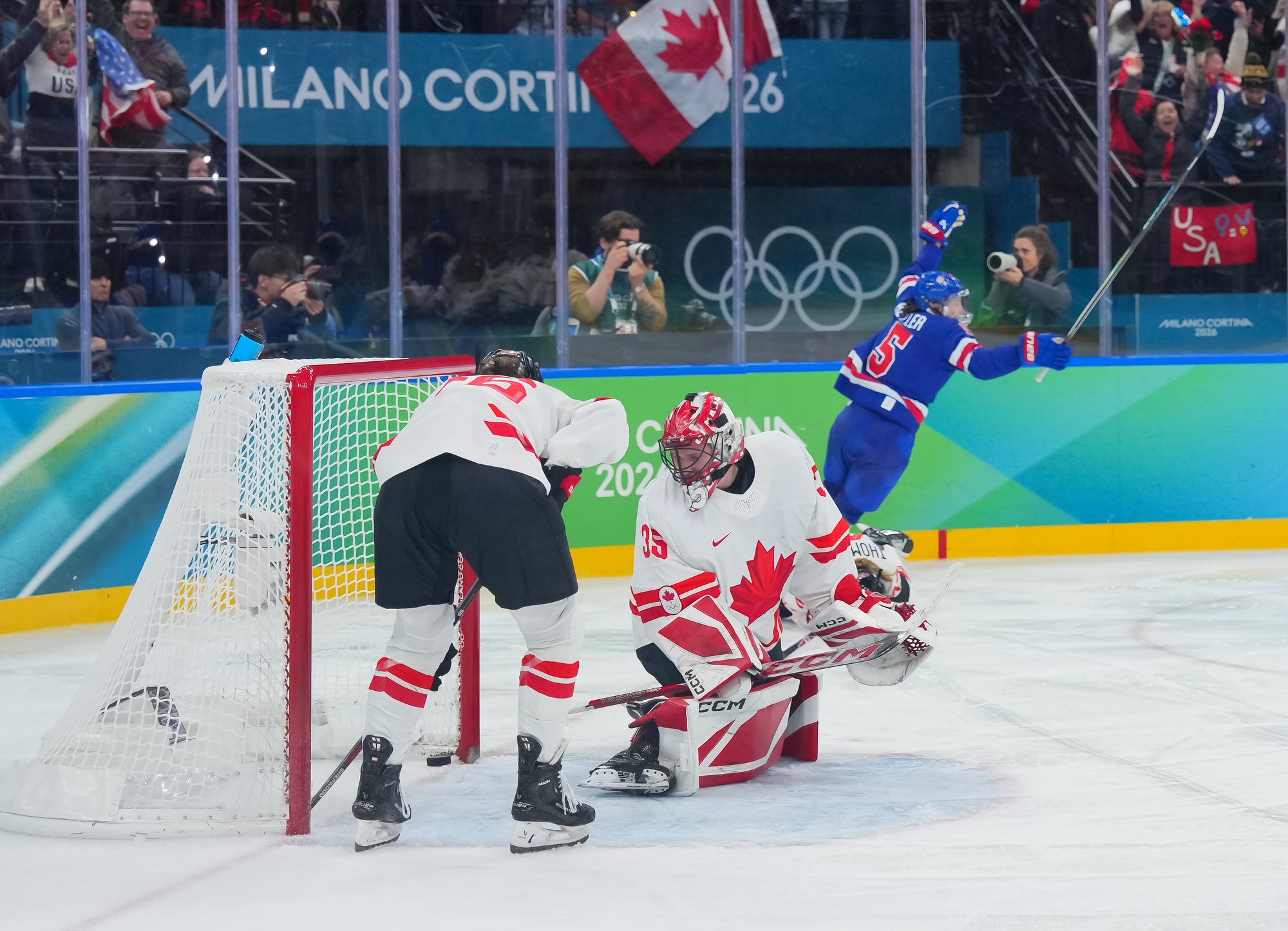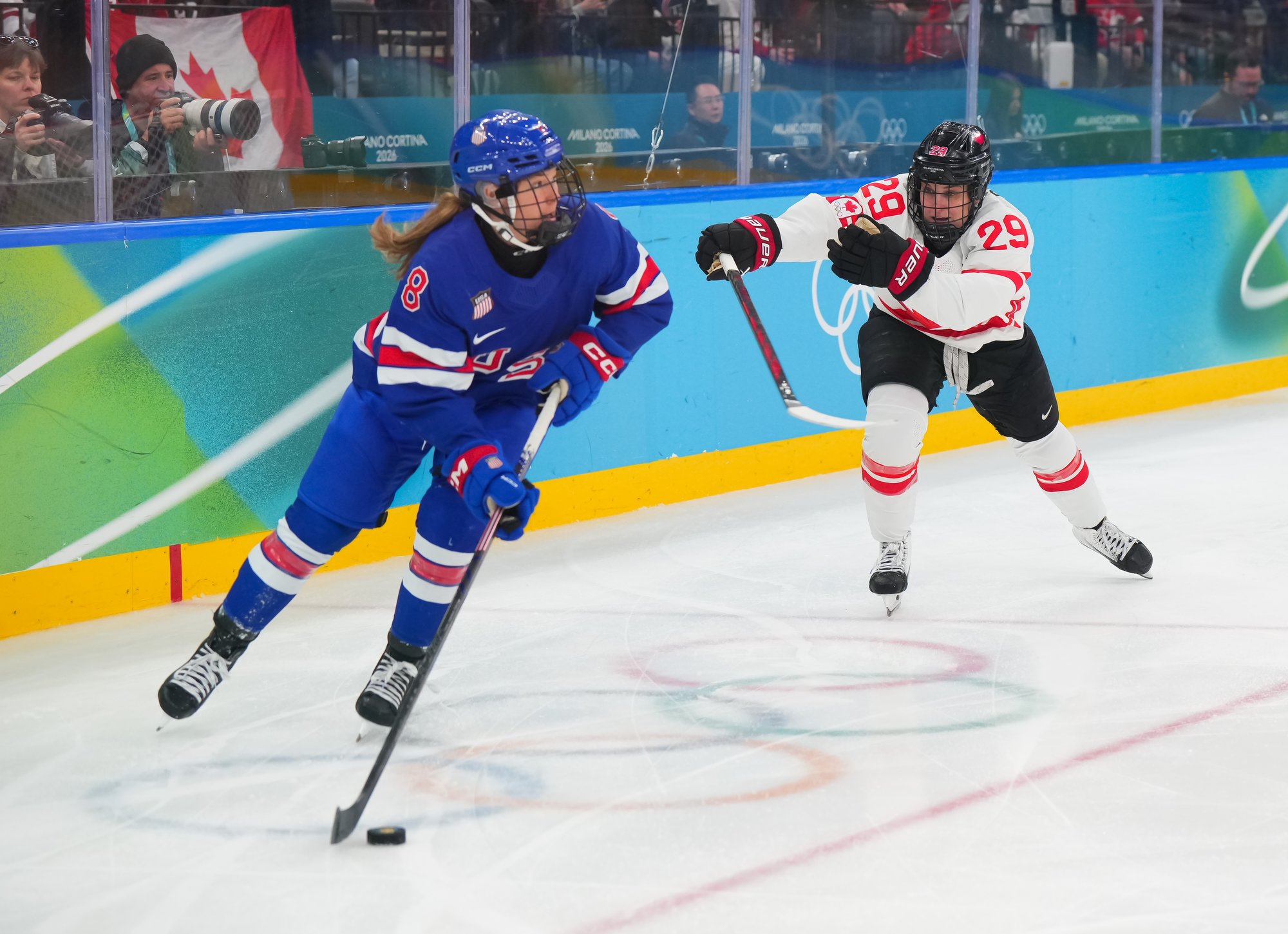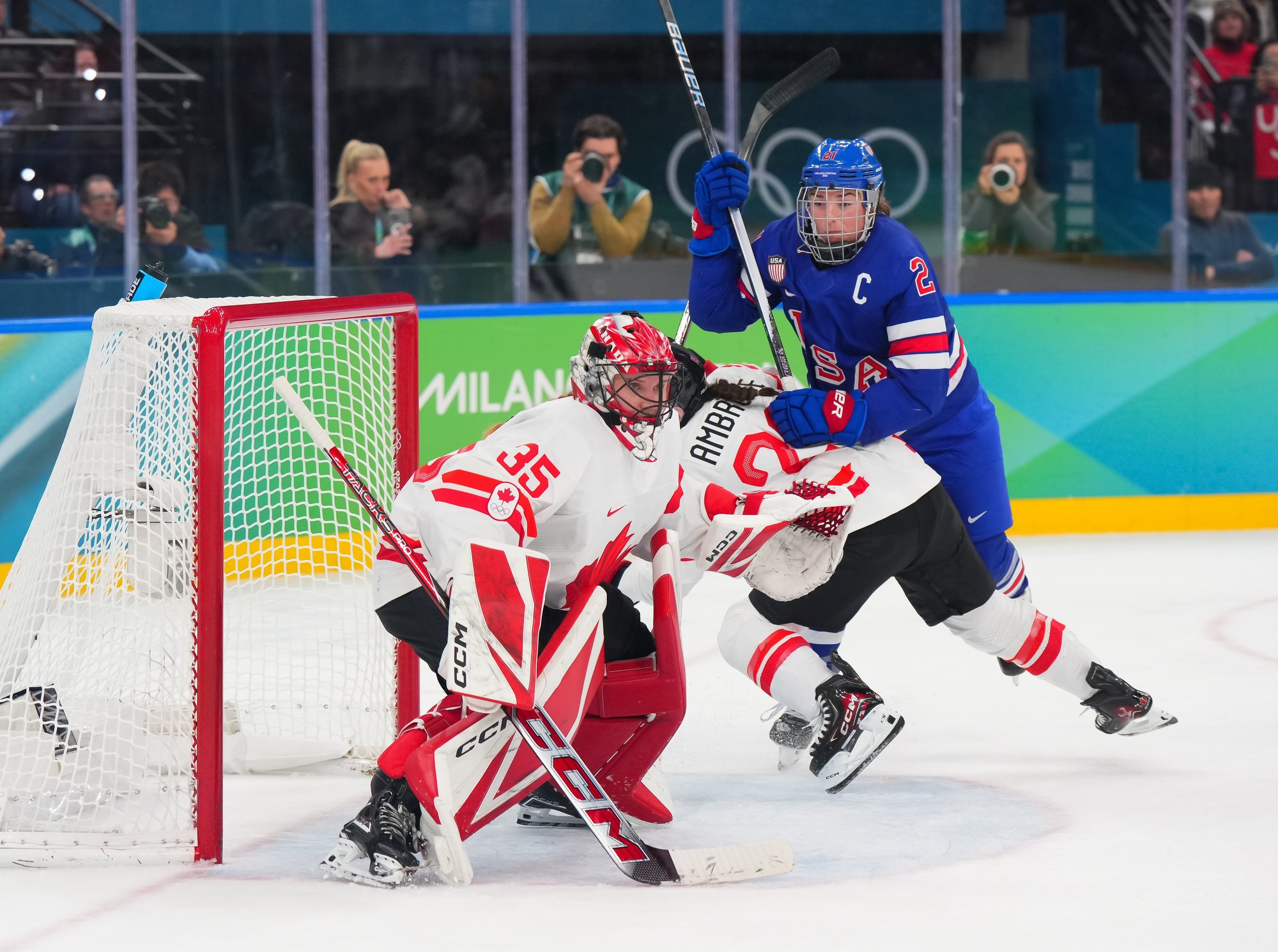 Santagiulia was packed with screaming fans, split more or less evenly between the two nations, and they had plenty to cheer for right from the get-go. Canada’s biggest challenge was to negate the U.S.’s flow and speed. To that end, they dumped the puck in and made the American defence chase the puck. In trouble in their own end, they cleared the puck to open ice, again forcing the Americans to chase down every loose puck. One-on-one battles along the boards? Not so much. Canada wasn’t interested.