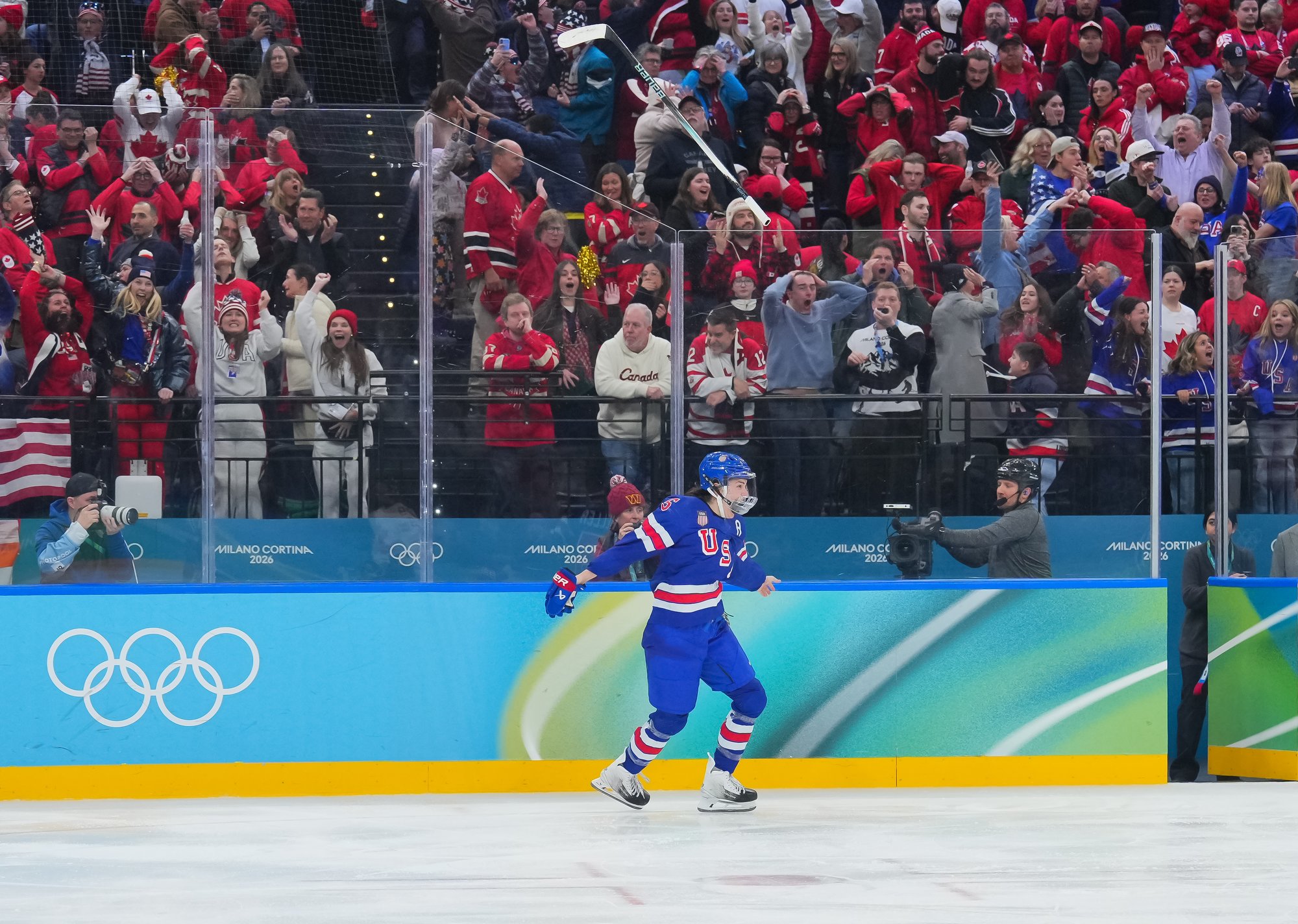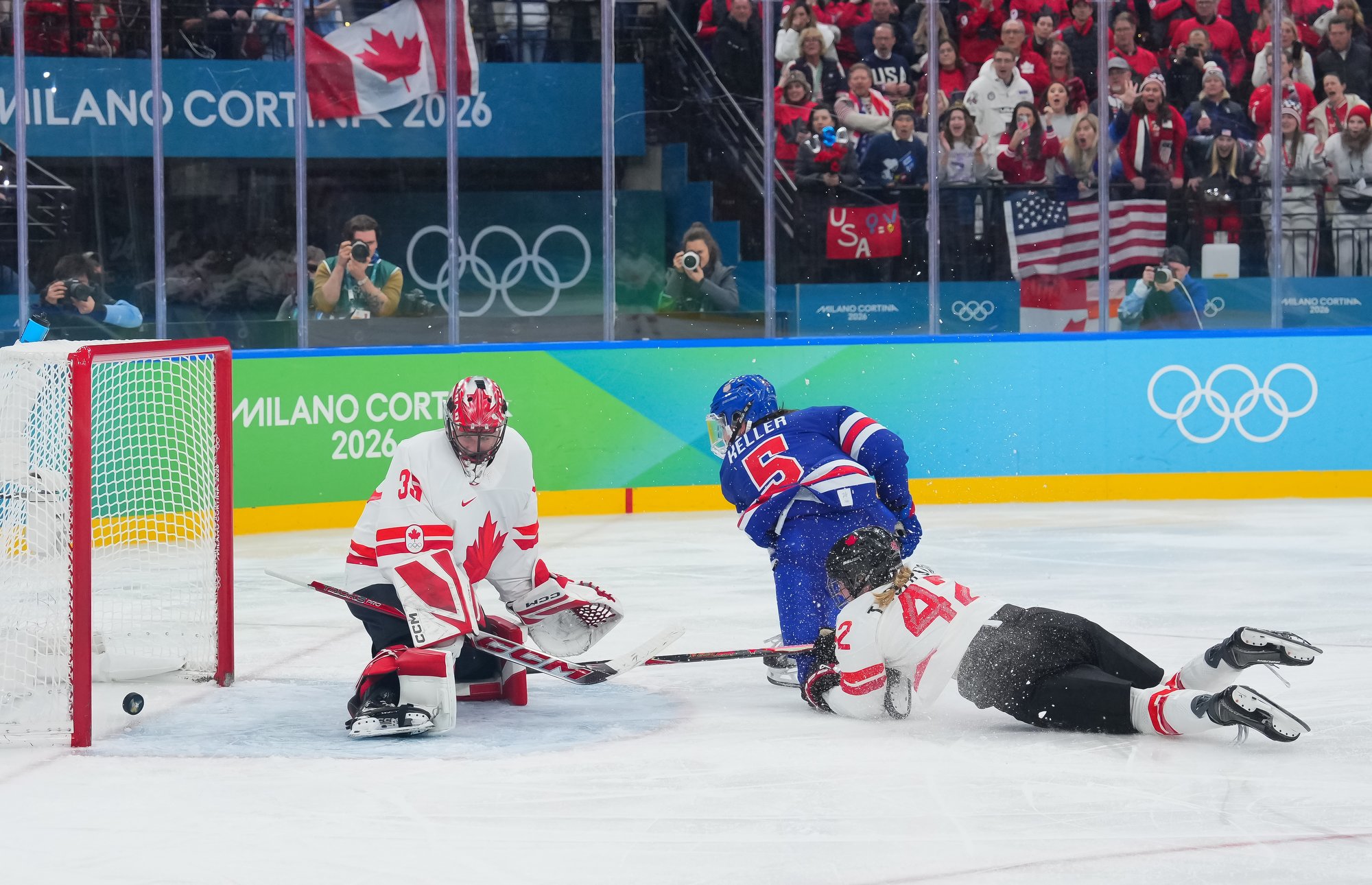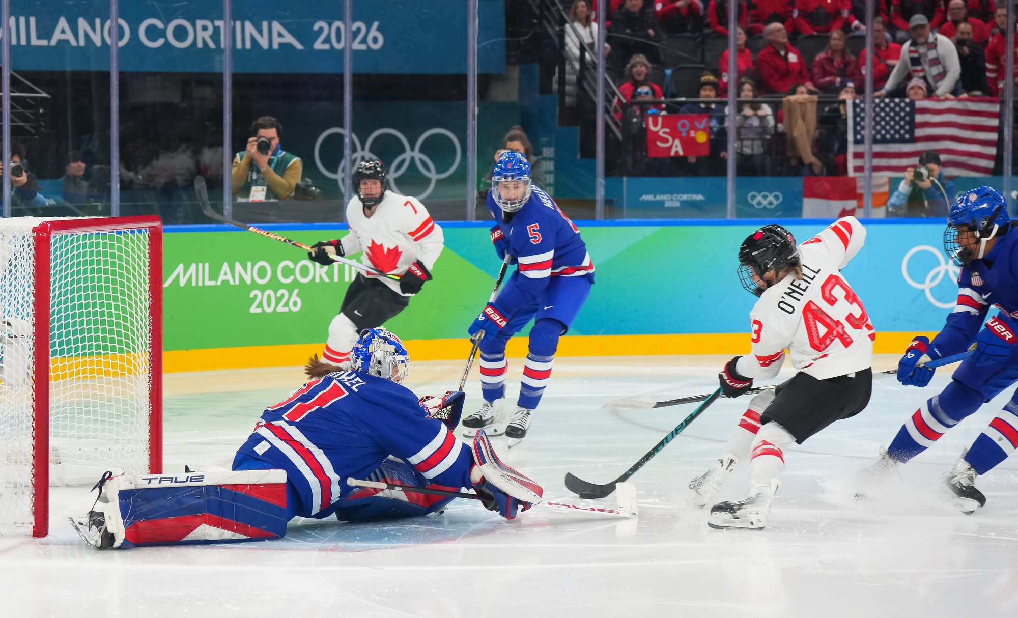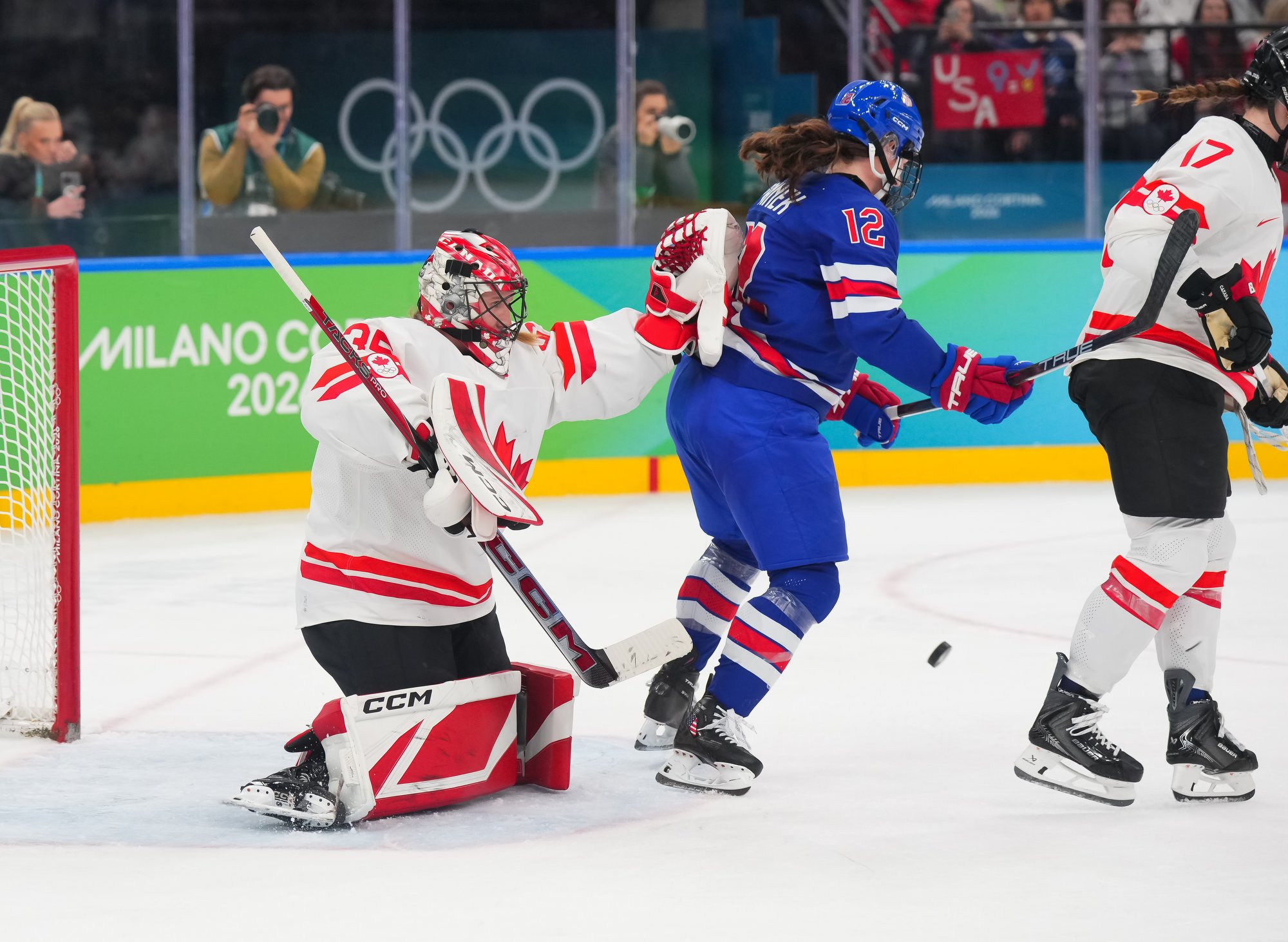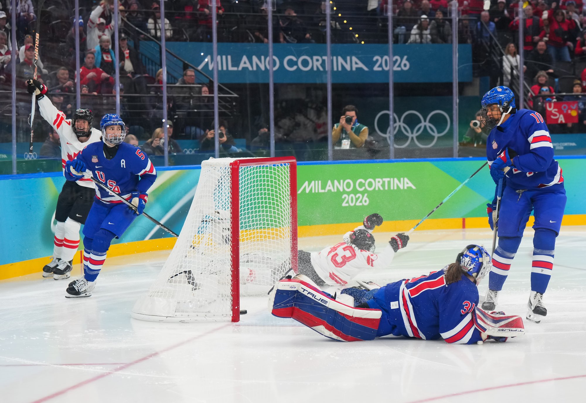Santagiulia was packed with screaming fans, split more or less evenly between the two nations, and they had plenty to cheer for right from the get-go. Canada’s biggest challenge was to negate the U.S.’s flow and speed. To that end, they dumped the puck in and made the American defence chase the puck. In trouble in their own end, they cleared the puck to open ice, again forcing the Americans to chase down every loose puck. One-on-one battles along the boards? Not so much. Canada wasn’t interested.