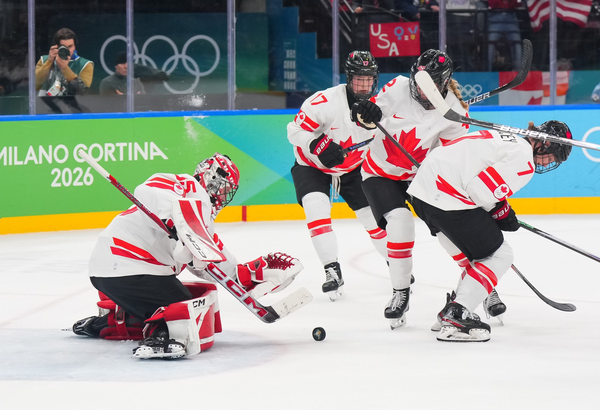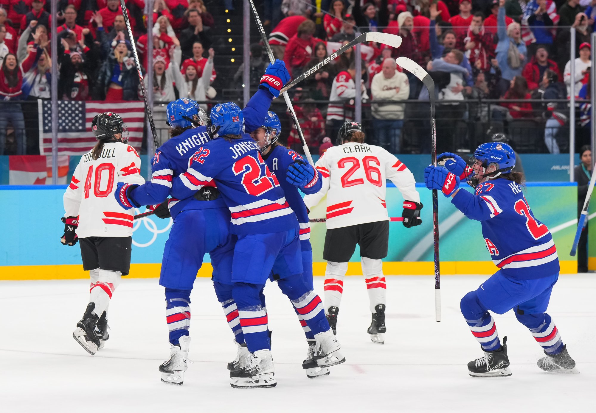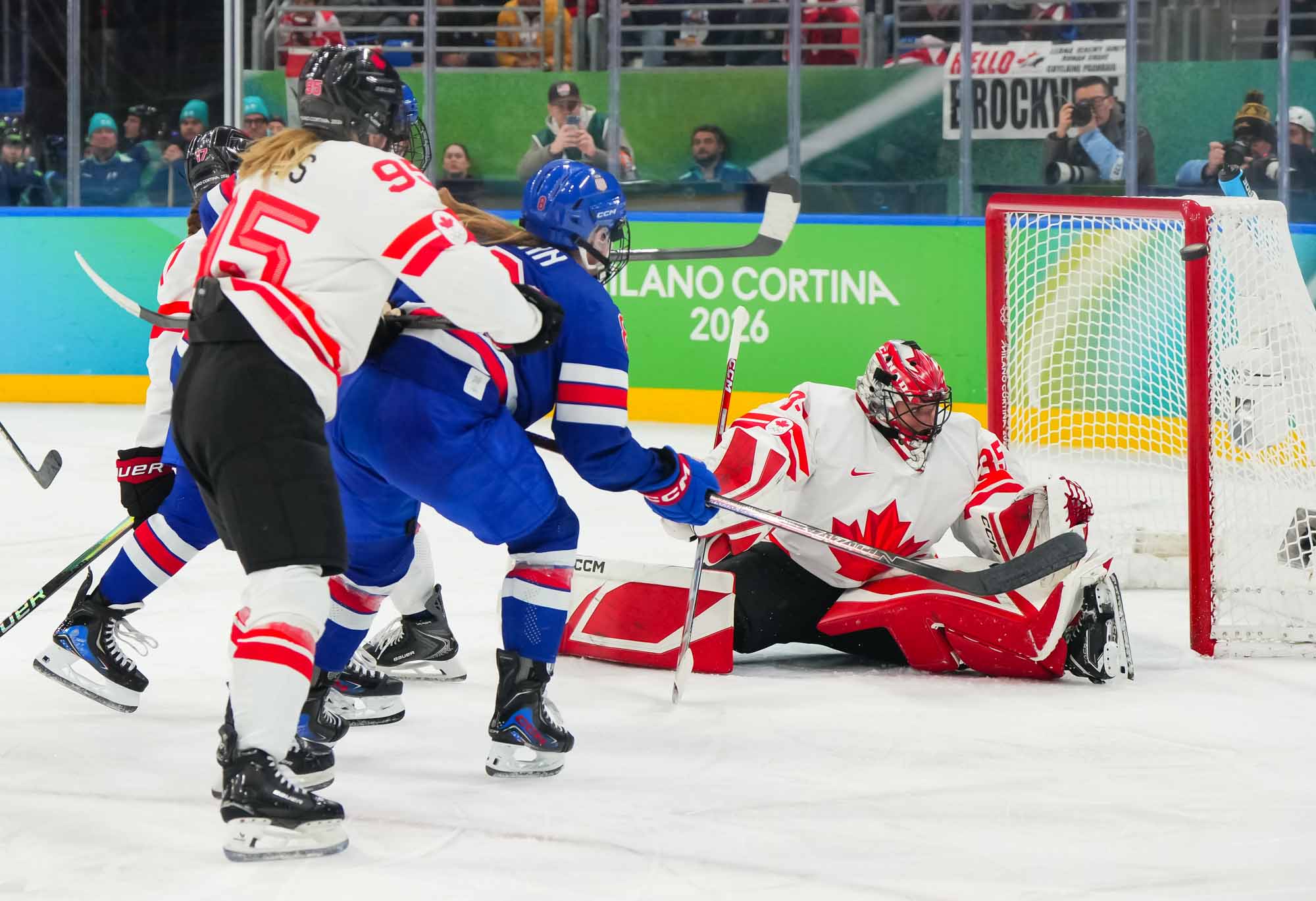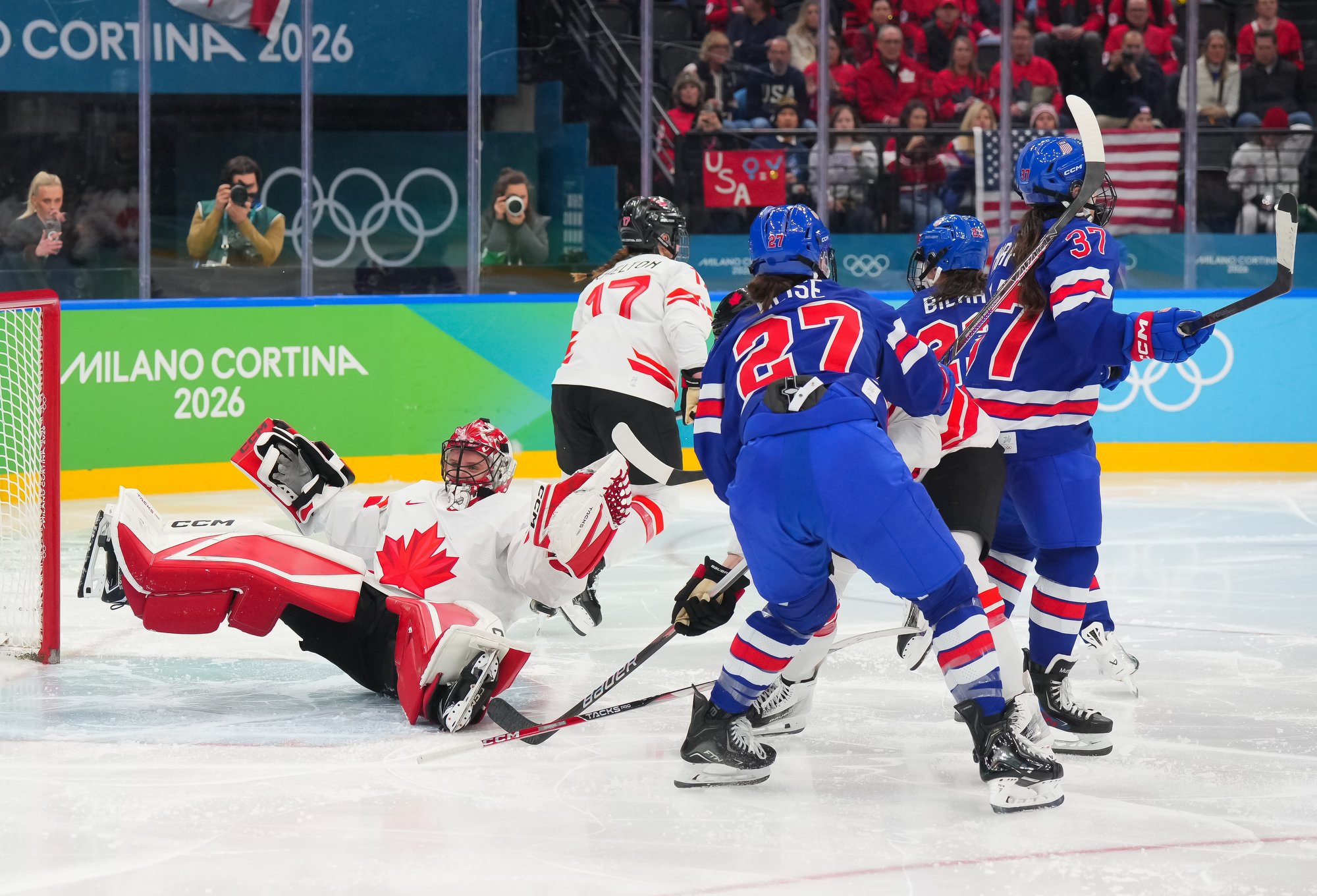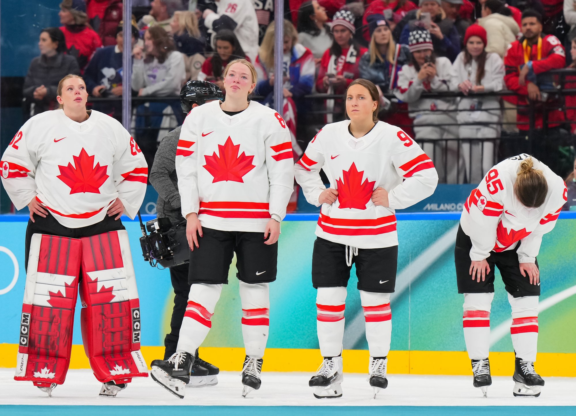Santagiulia was packed with screaming fans, split more or less evenly between the two nations, and they had plenty to cheer for right from the get-go. Canada’s biggest challenge was to negate the U.S.’s flow and speed. To that end, they dumped the puck in and made the American defence chase the puck. In trouble in their own end, they cleared the puck to open ice, again forcing the Americans to chase down every loose puck. One-on-one battles along the boards? Not so much. Canada wasn’t interested.