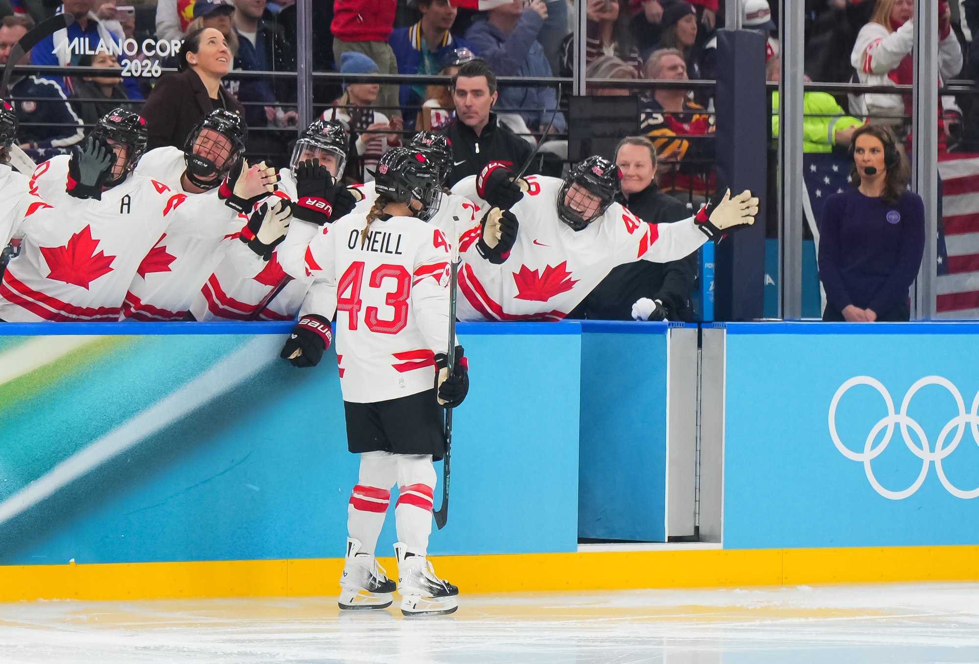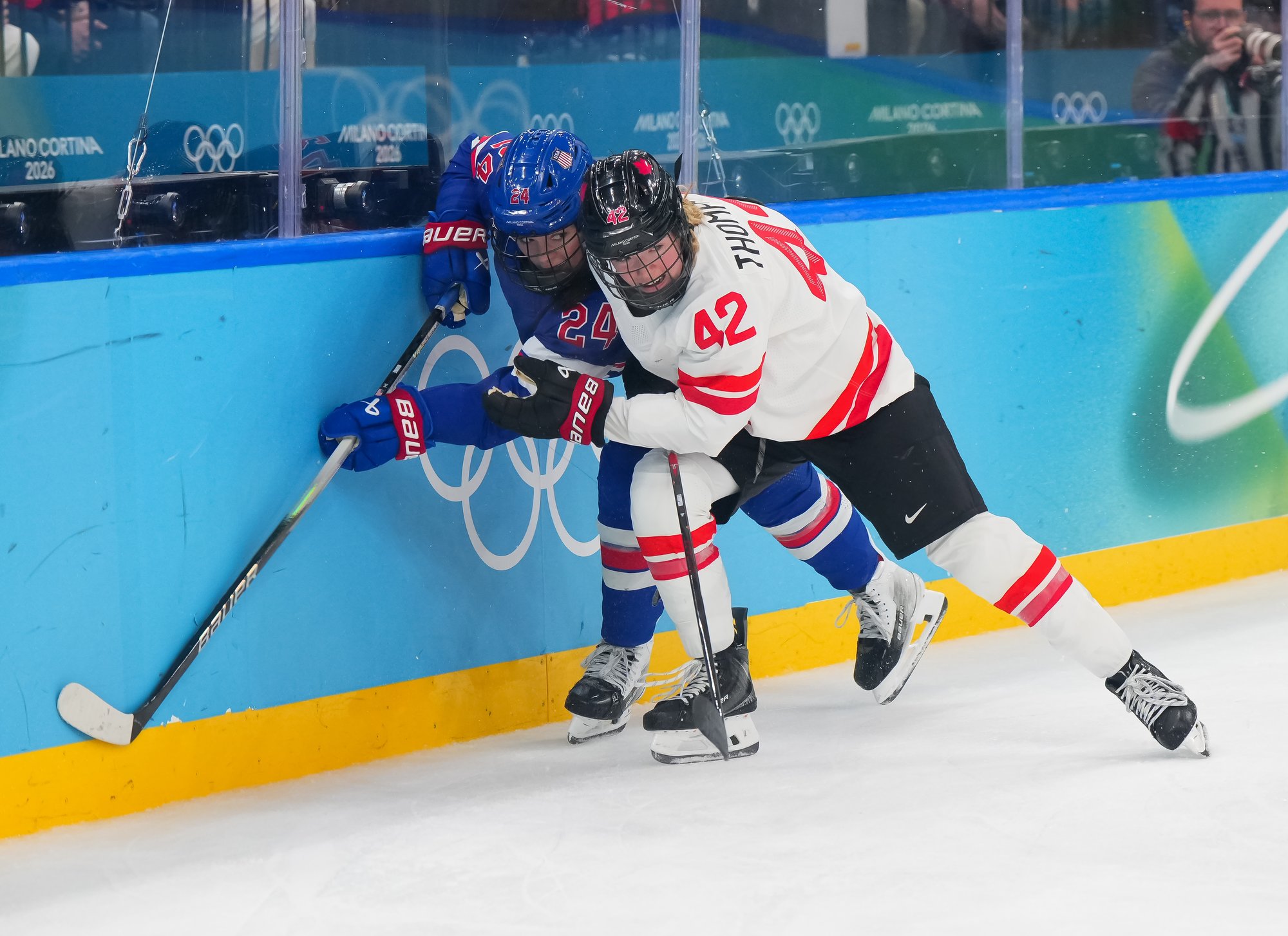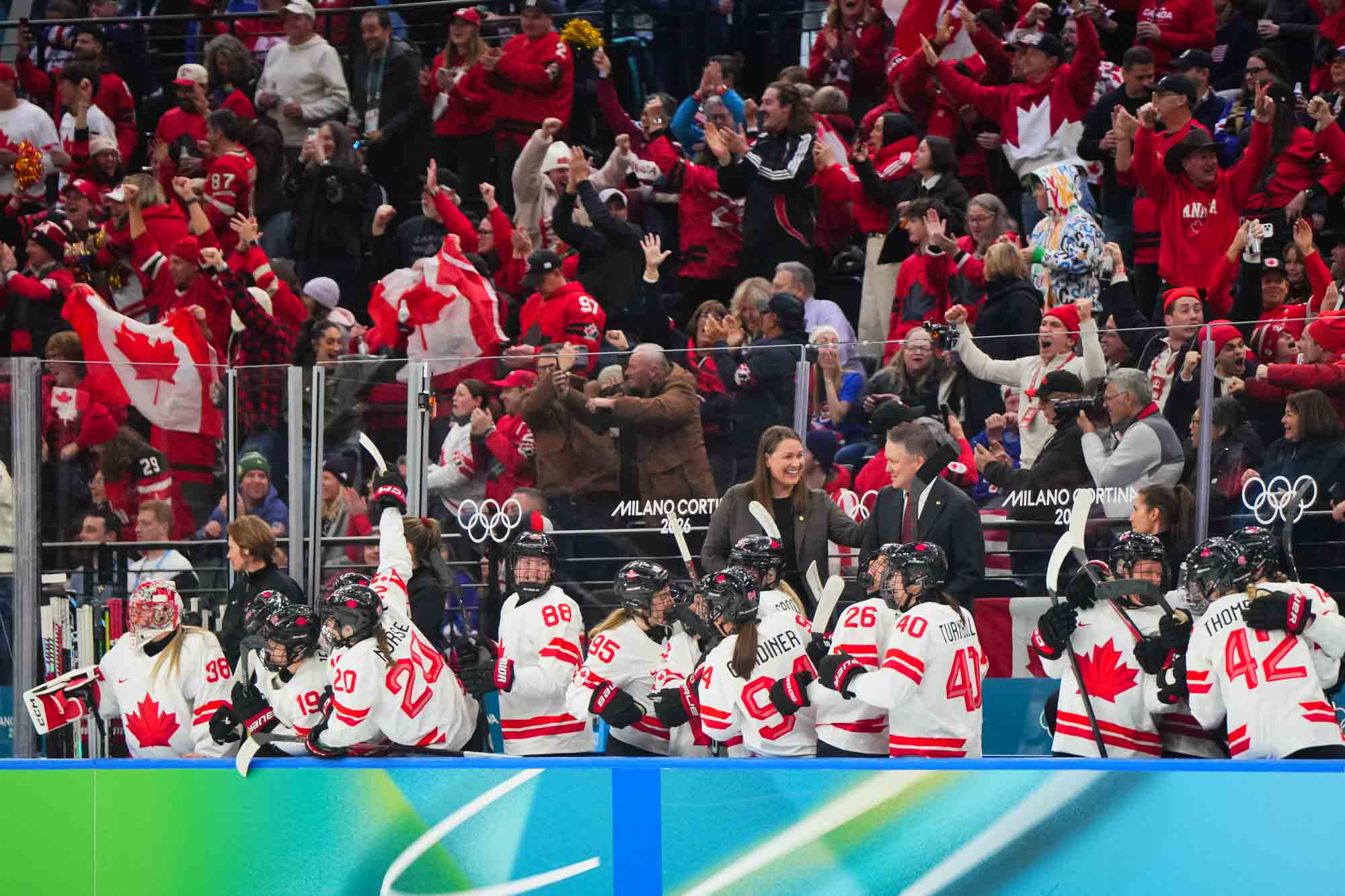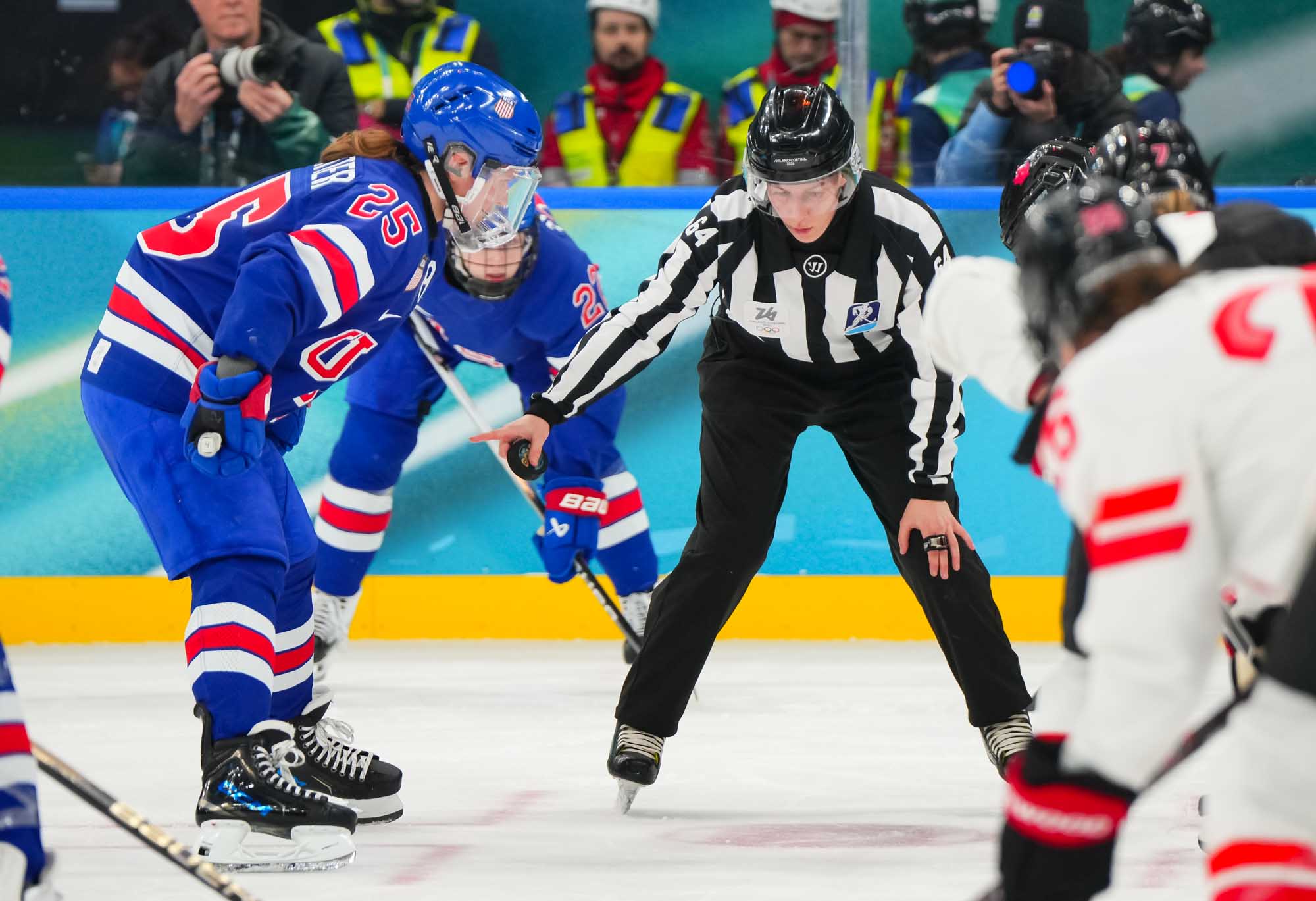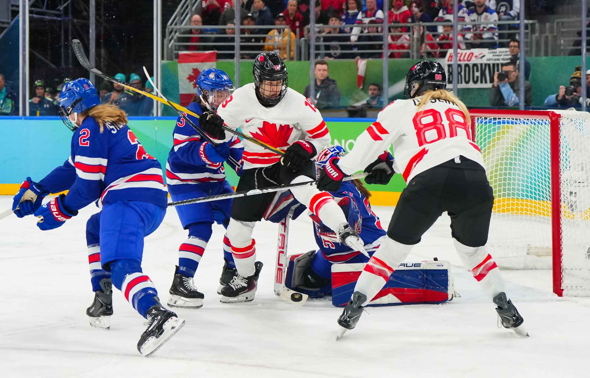 Santagiulia was packed with screaming fans, split more or less evenly between the two nations, and they had plenty to cheer for right from the get-go. Canada’s biggest challenge was to negate the U.S.’s flow and speed. To that end, they dumped the puck in and made the American defence chase the puck. In trouble in their own end, they cleared the puck to open ice, again forcing the Americans to chase down every loose puck. One-on-one battles along the boards? Not so much. Canada wasn’t interested.