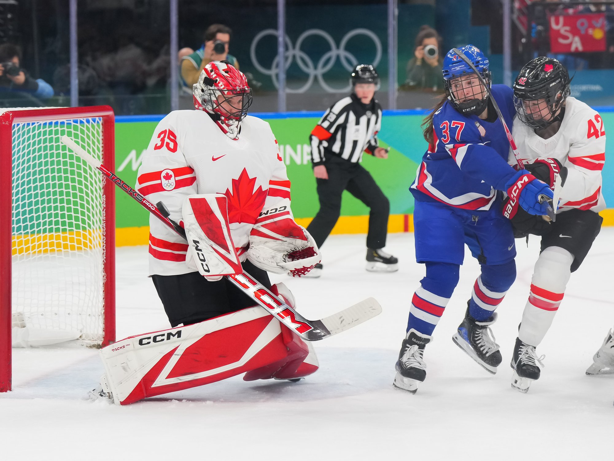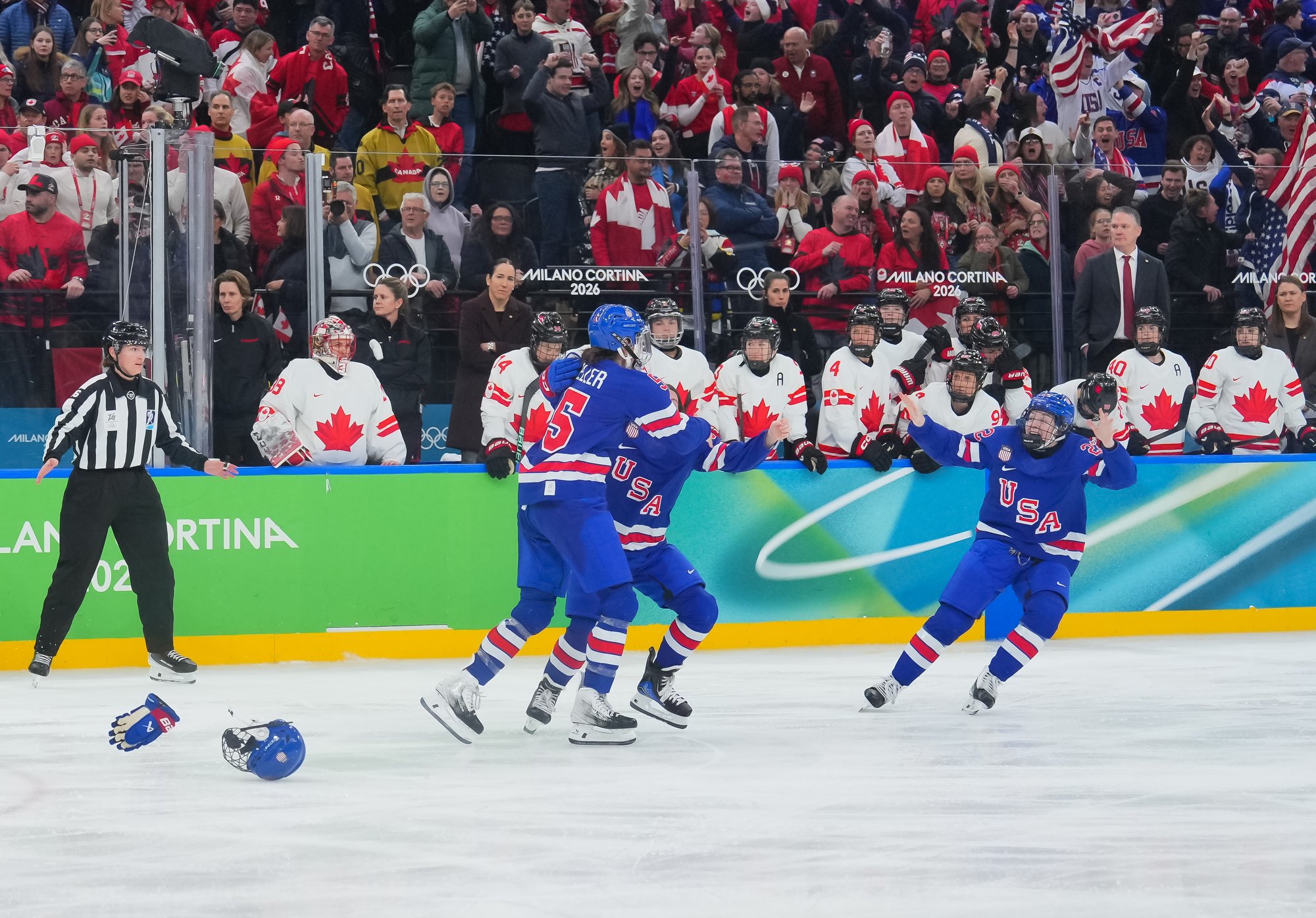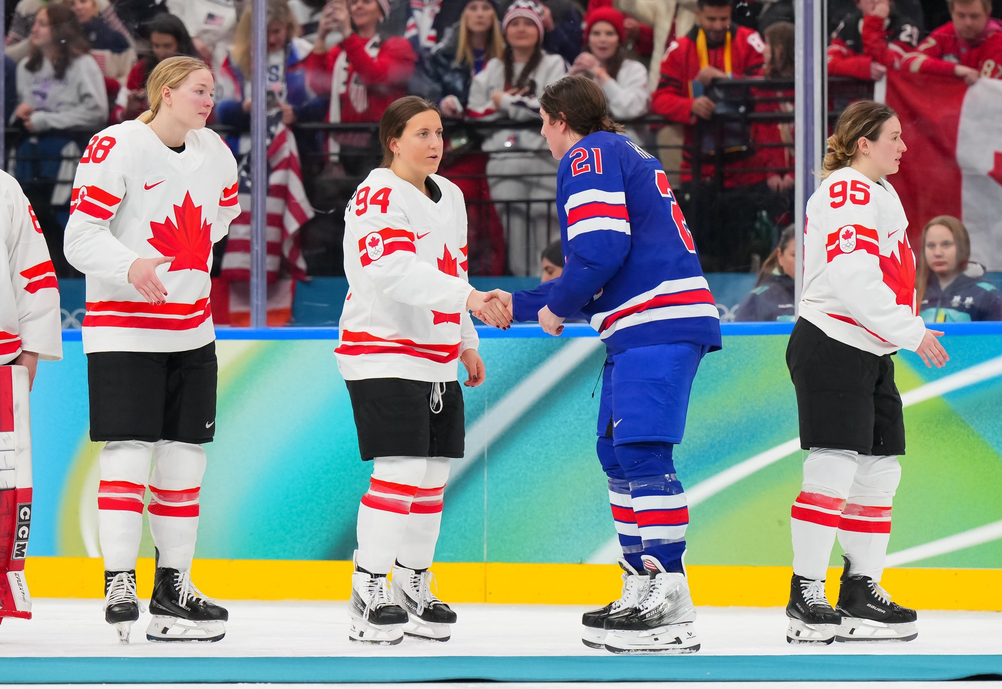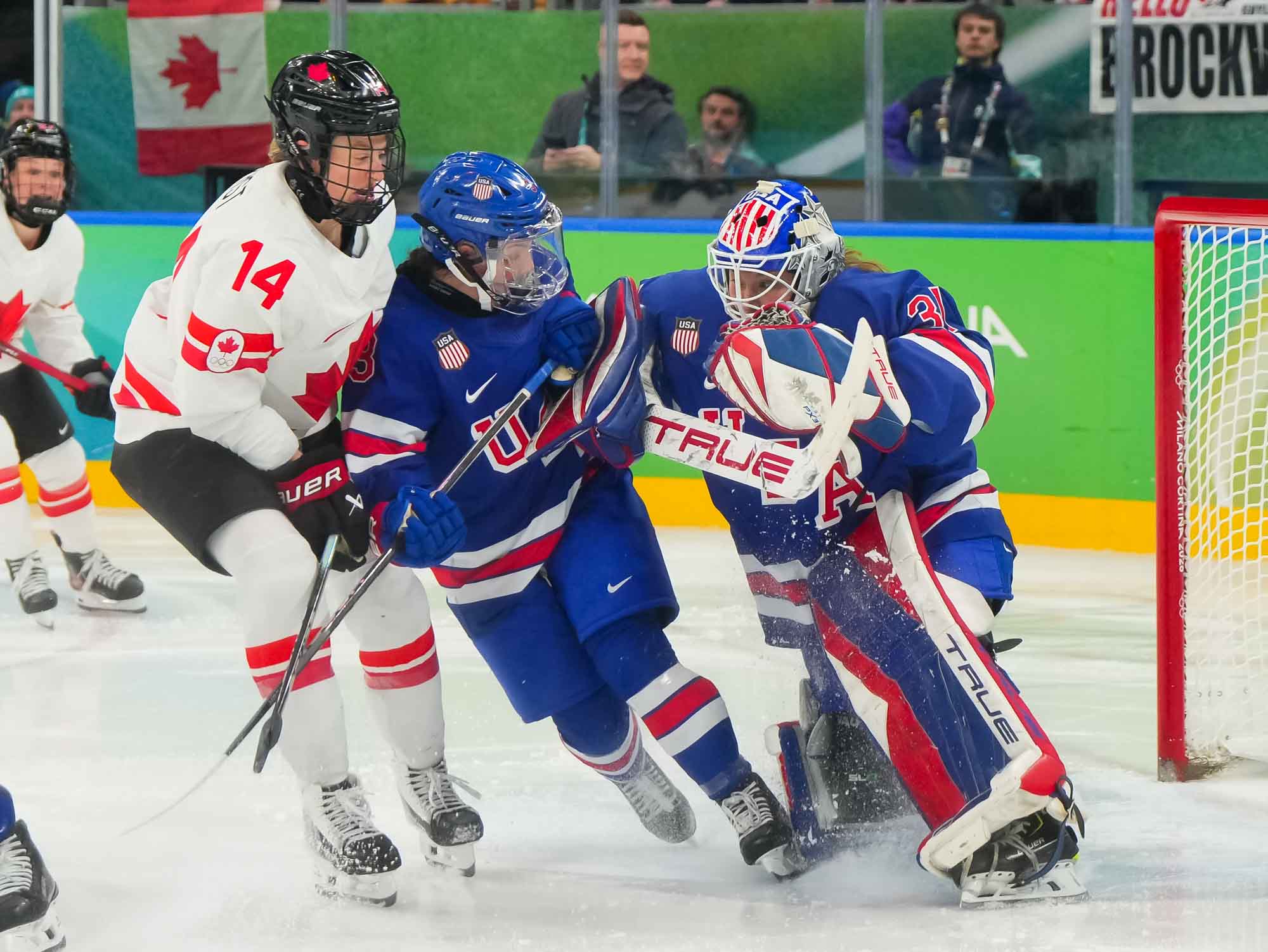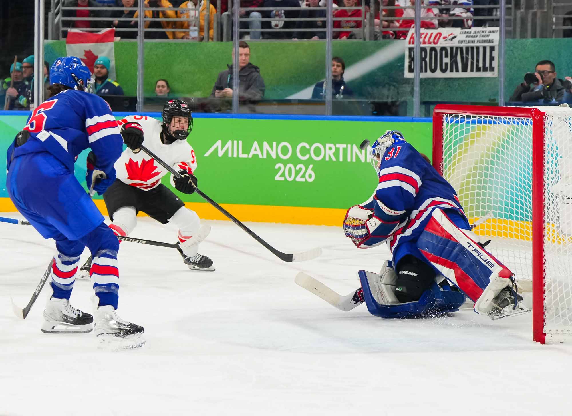 Santagiulia was packed with screaming fans, split more or less evenly between the two nations, and they had plenty to cheer for right from the get-go. Canada’s biggest challenge was to negate the U.S.’s flow and speed. To that end, they dumped the puck in and made the American defence chase the puck. In trouble in their own end, they cleared the puck to open ice, again forcing the Americans to chase down every loose puck. One-on-one battles along the boards? Not so much. Canada wasn’t interested.