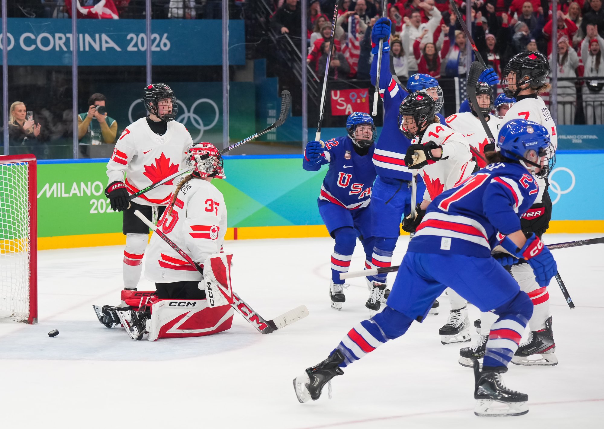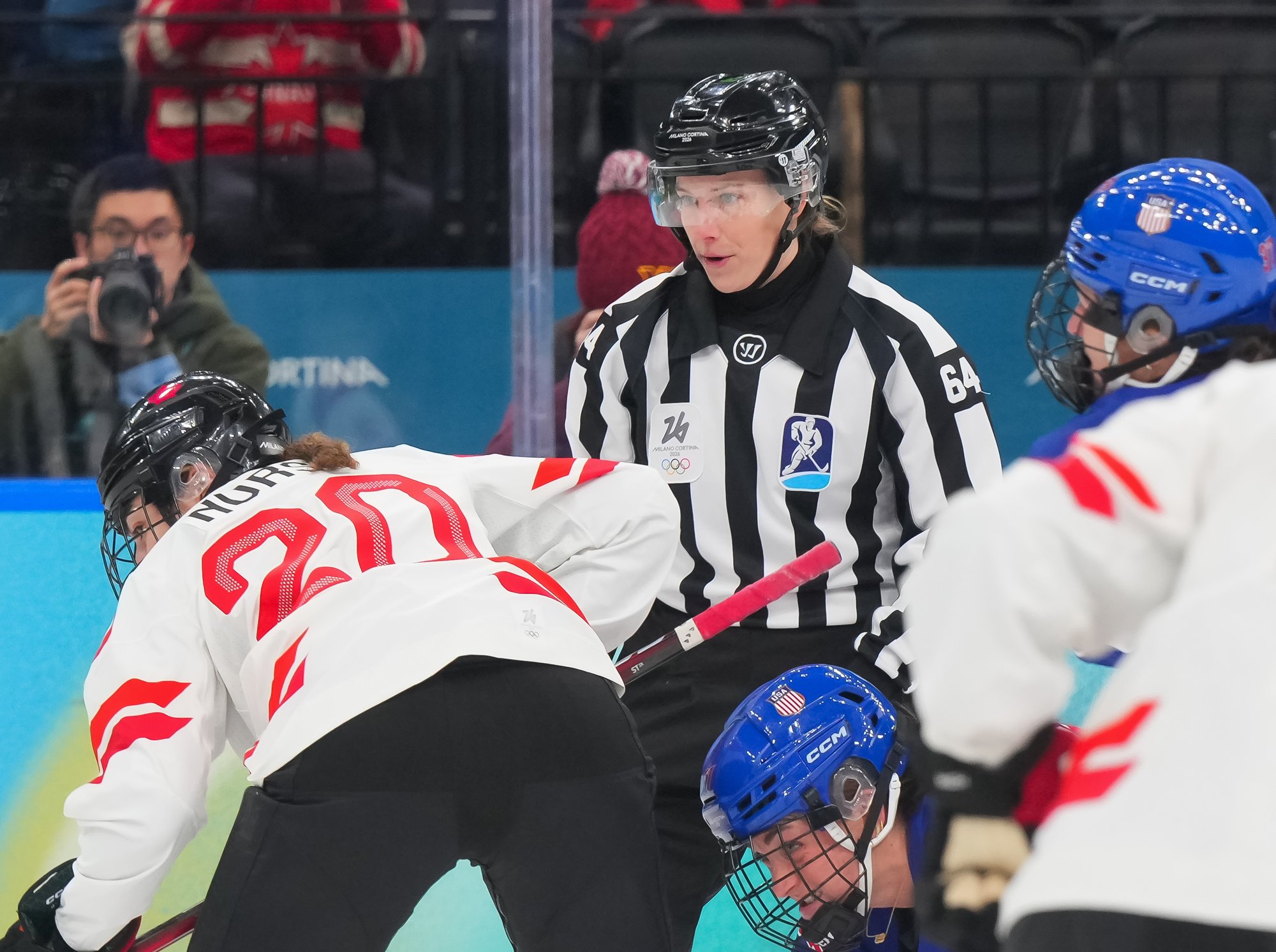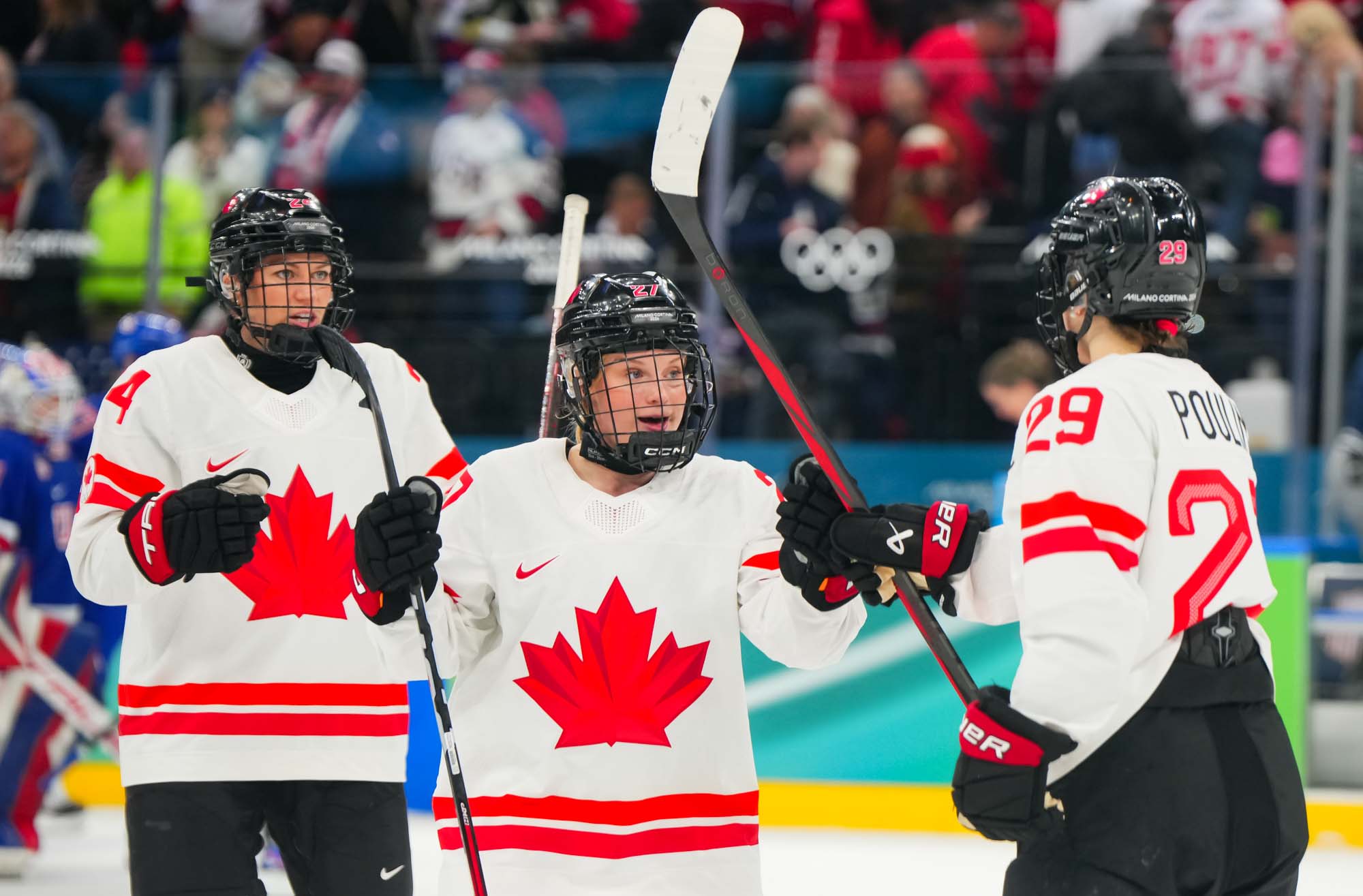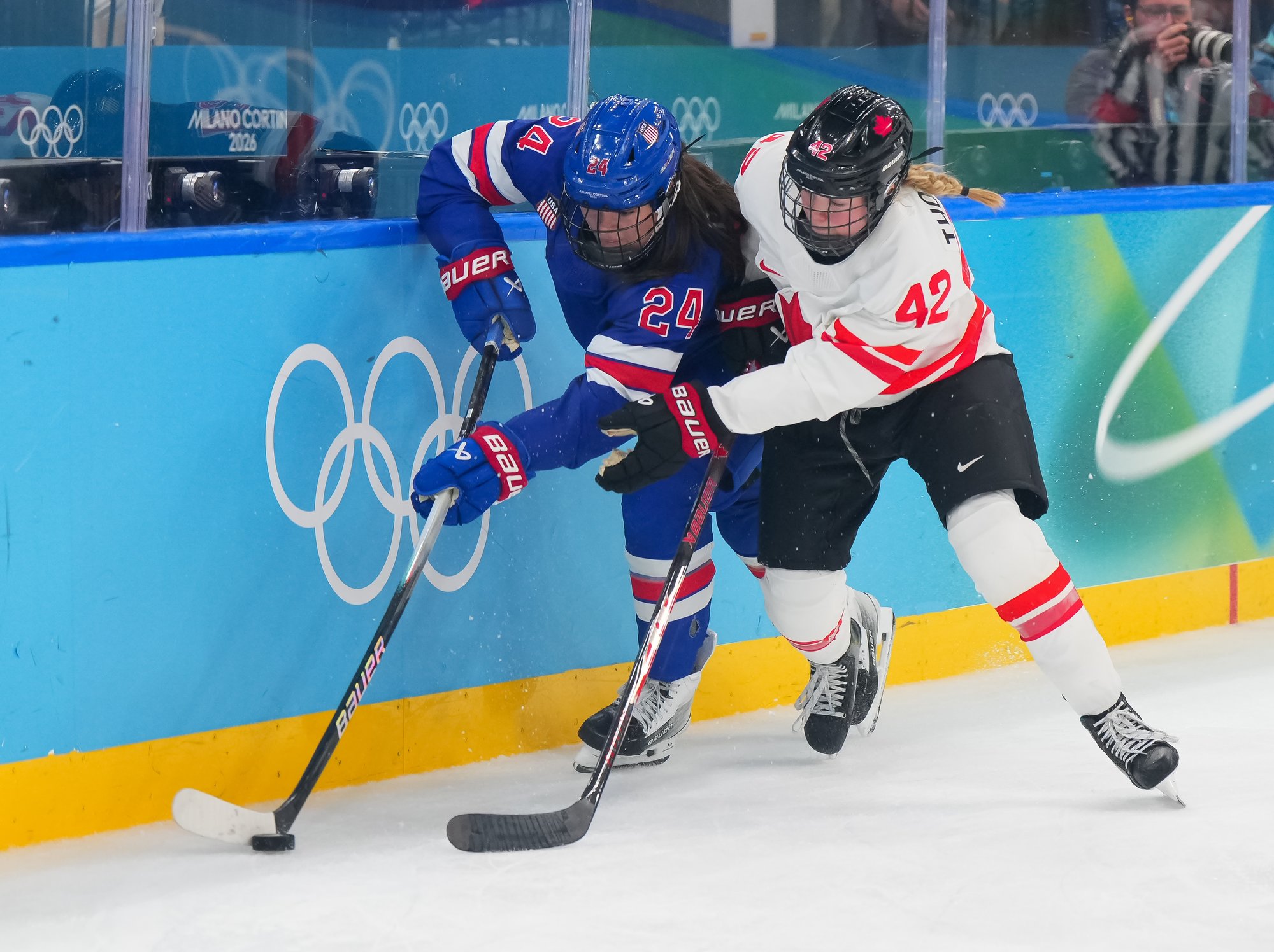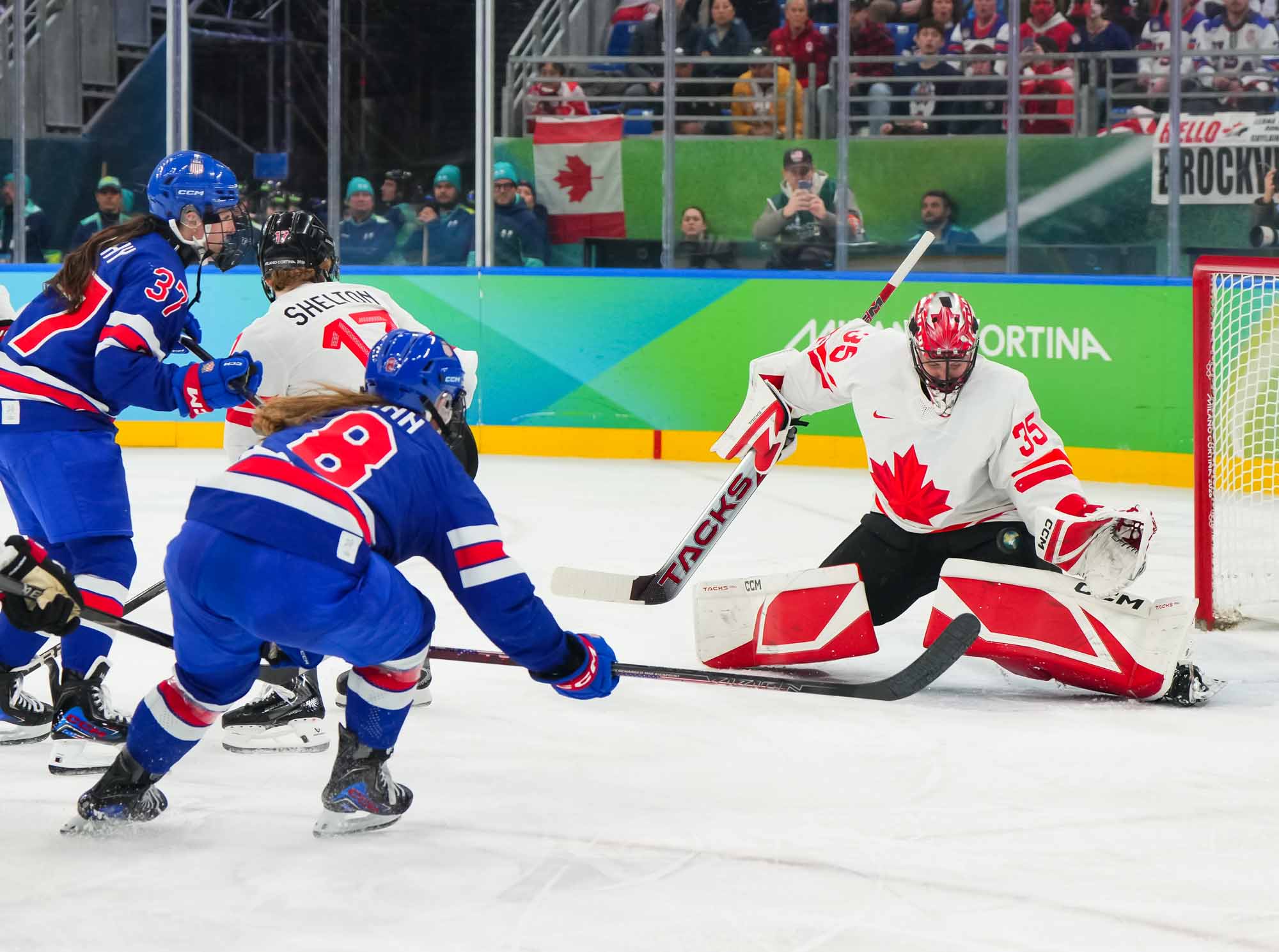 Santagiulia was packed with screaming fans, split more or less evenly between the two nations, and they had plenty to cheer for right from the get-go. Canada’s biggest challenge was to negate the U.S.’s flow and speed. To that end, they dumped the puck in and made the American defence chase the puck. In trouble in their own end, they cleared the puck to open ice, again forcing the Americans to chase down every loose puck. One-on-one battles along the boards? Not so much. Canada wasn’t interested.