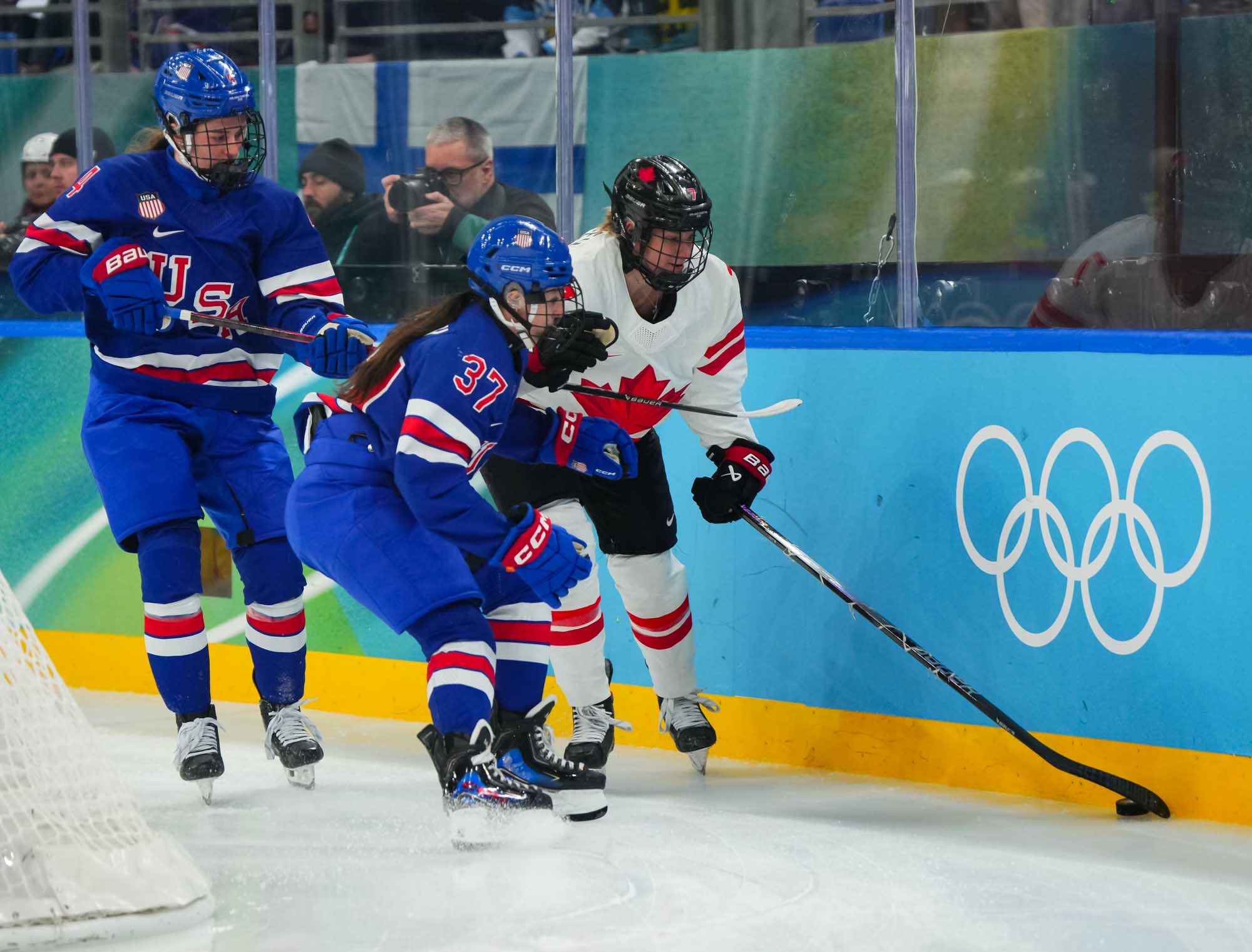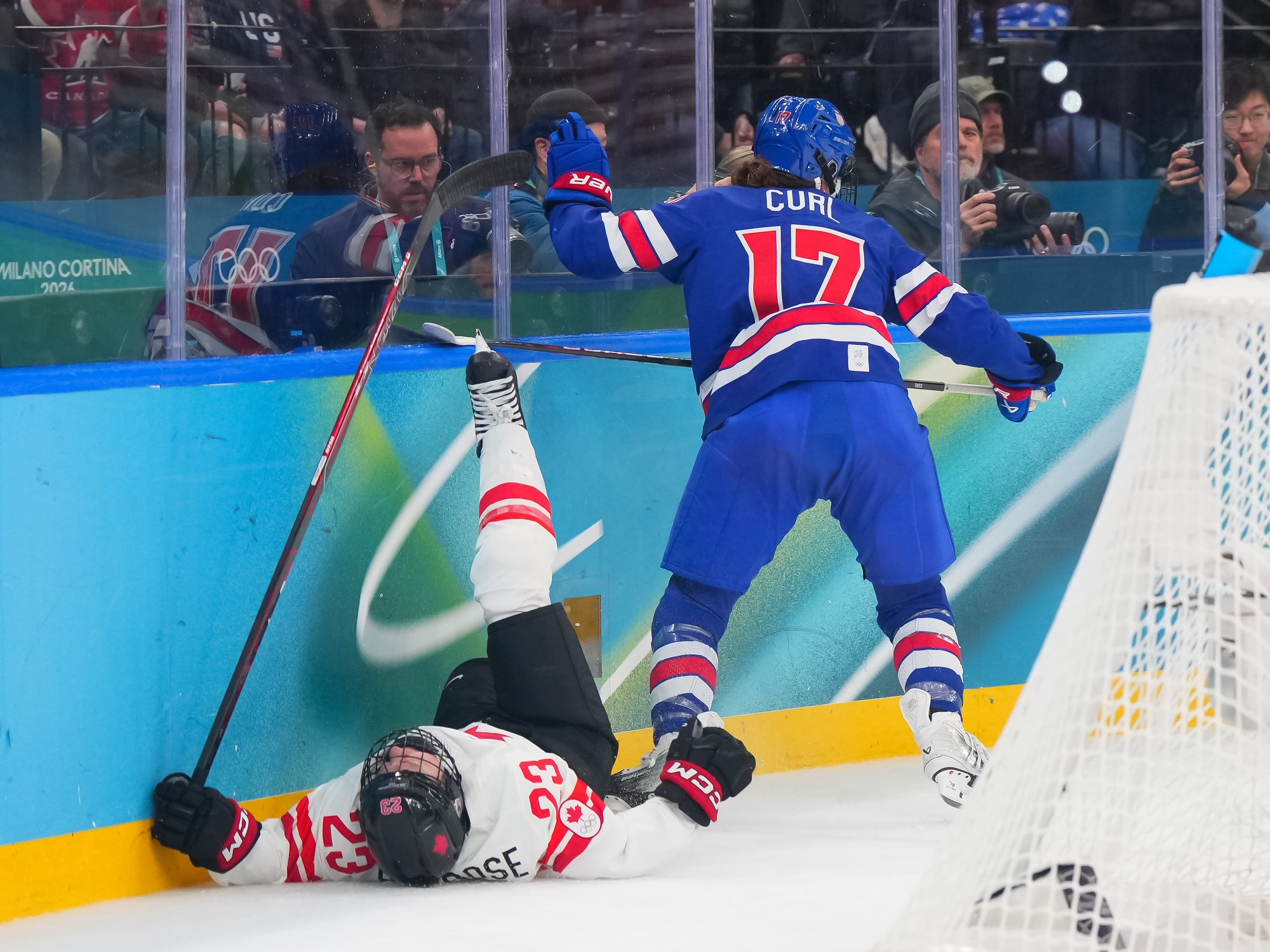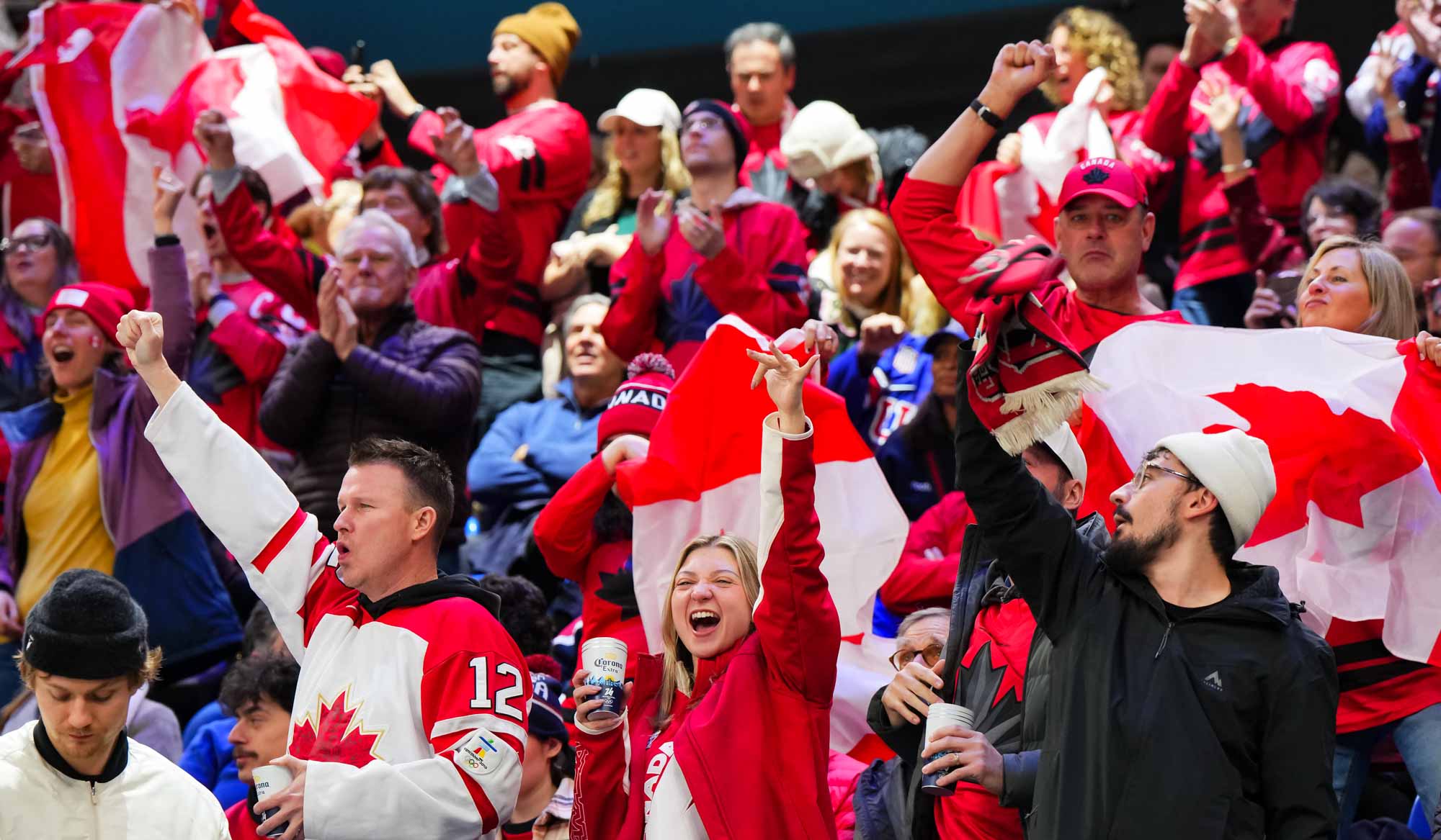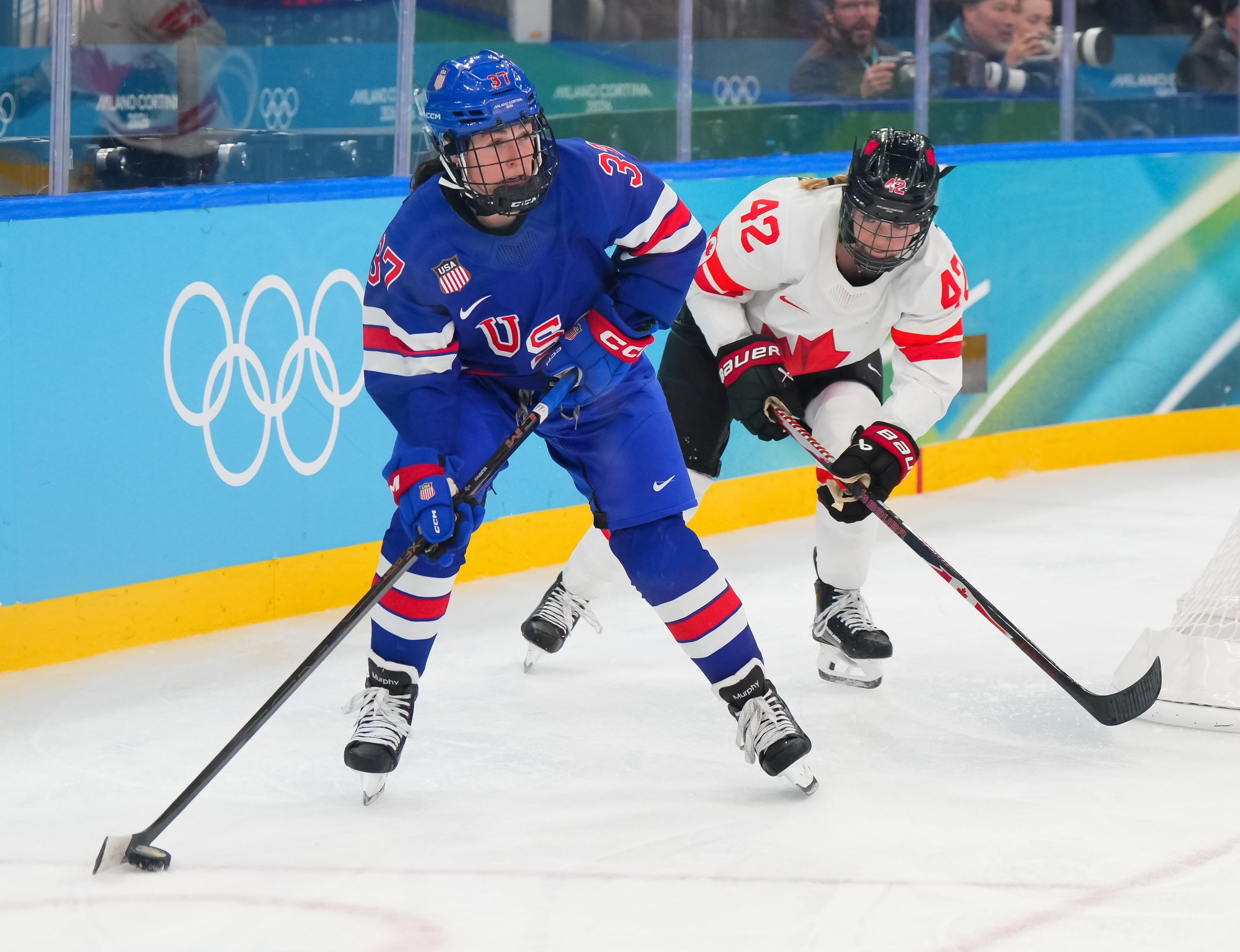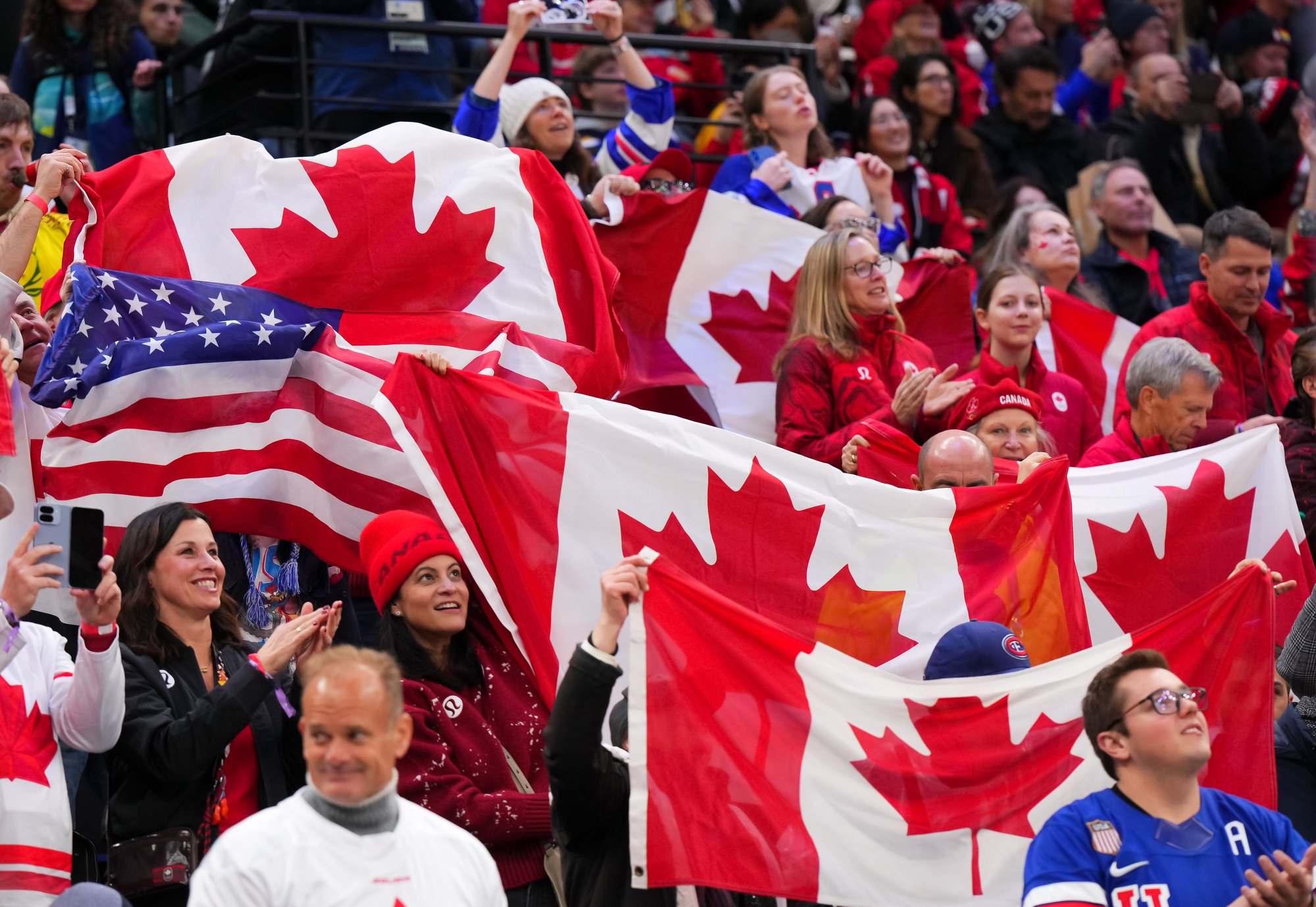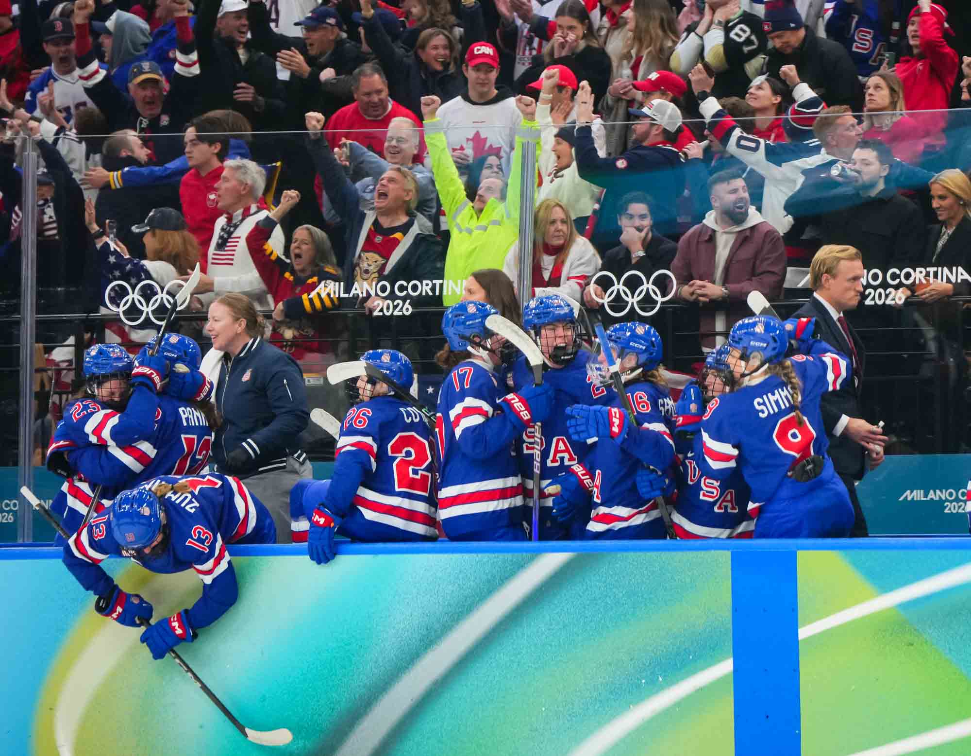Santagiulia was packed with screaming fans, split more or less evenly between the two nations, and they had plenty to cheer for right from the get-go. Canada’s biggest challenge was to negate the U.S.’s flow and speed. To that end, they dumped the puck in and made the American defence chase the puck. In trouble in their own end, they cleared the puck to open ice, again forcing the Americans to chase down every loose puck. One-on-one battles along the boards? Not so much. Canada wasn’t interested.