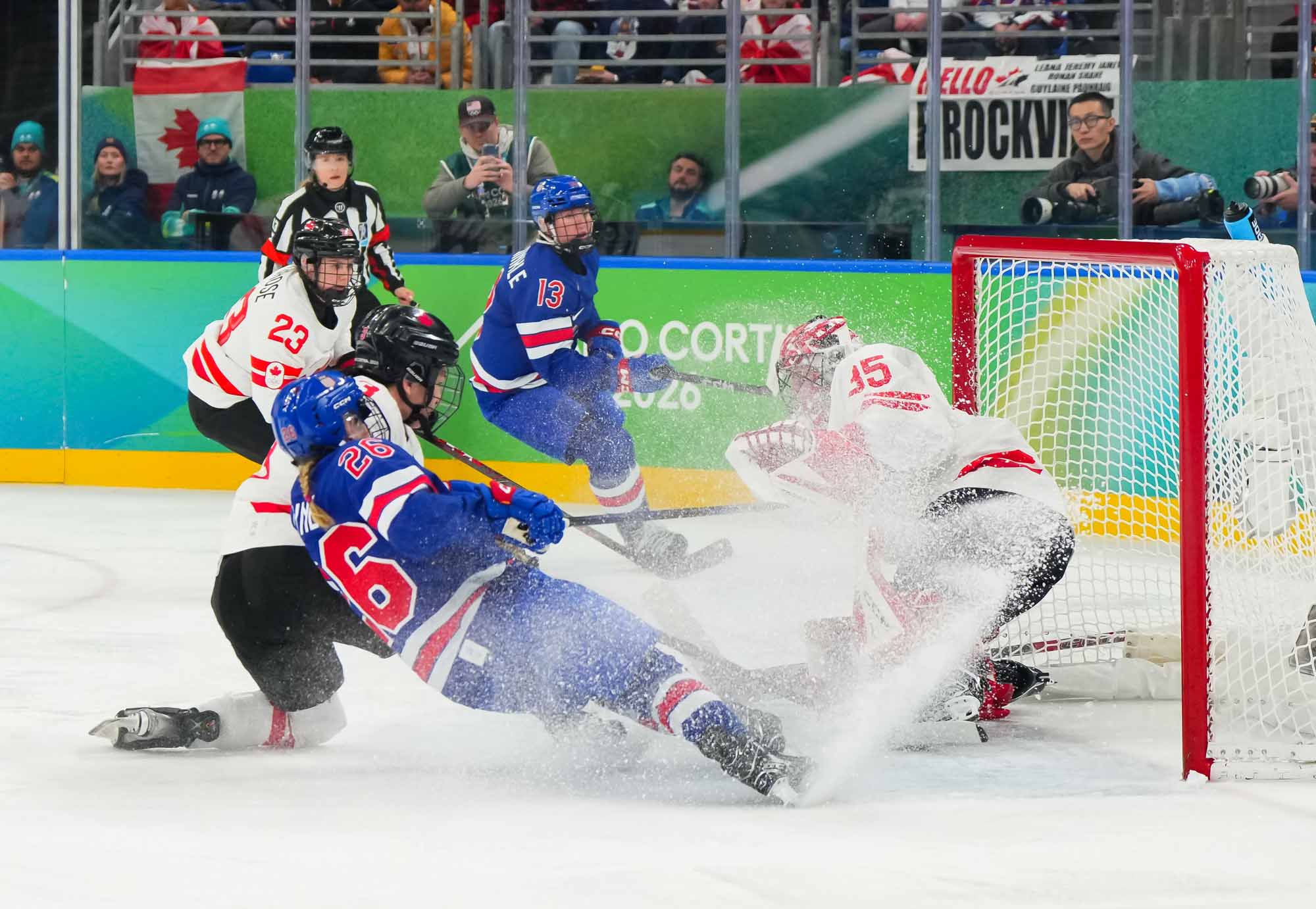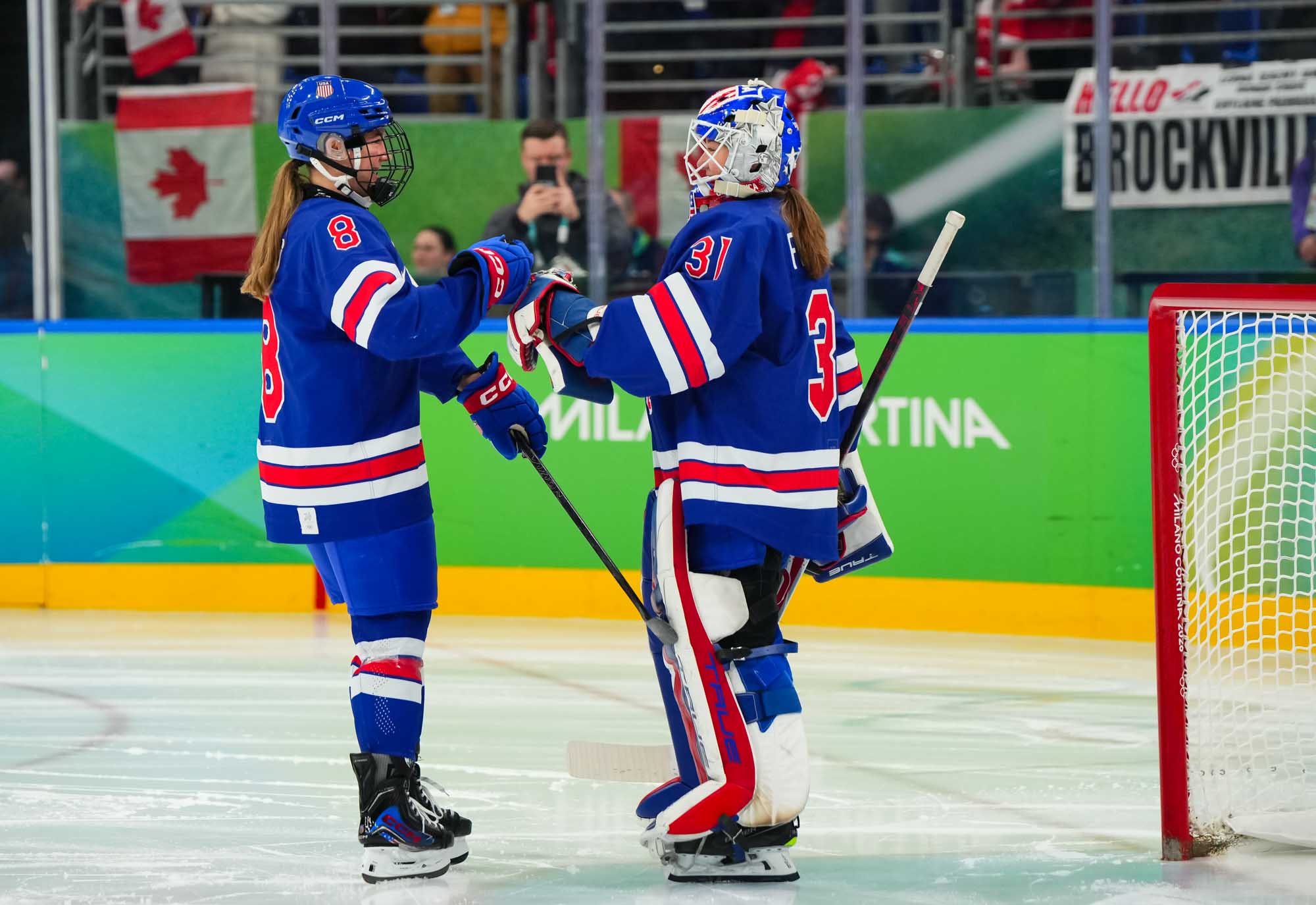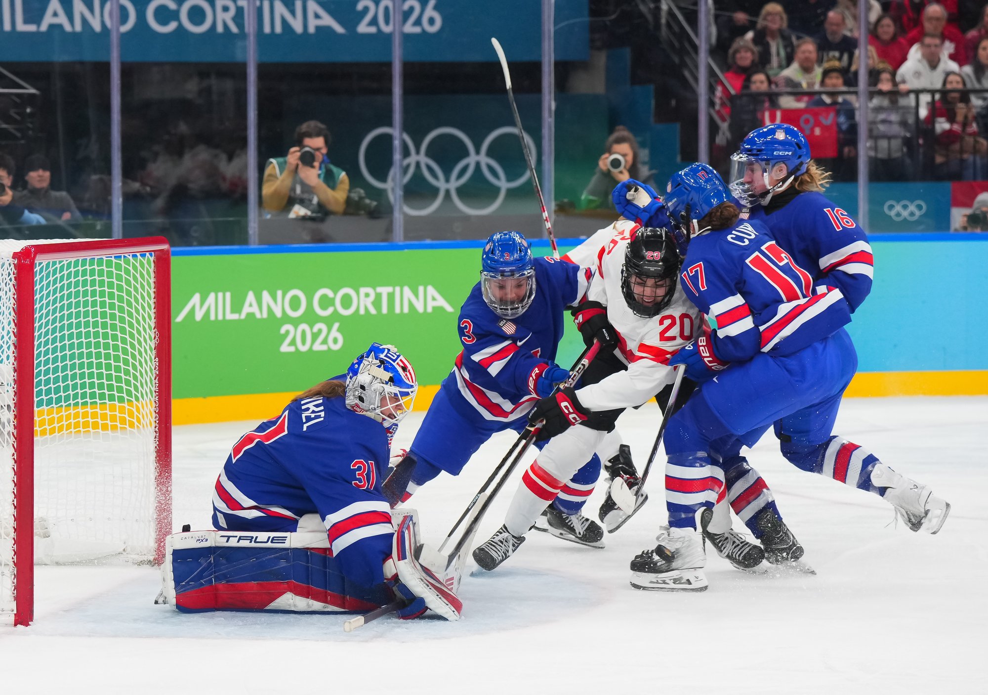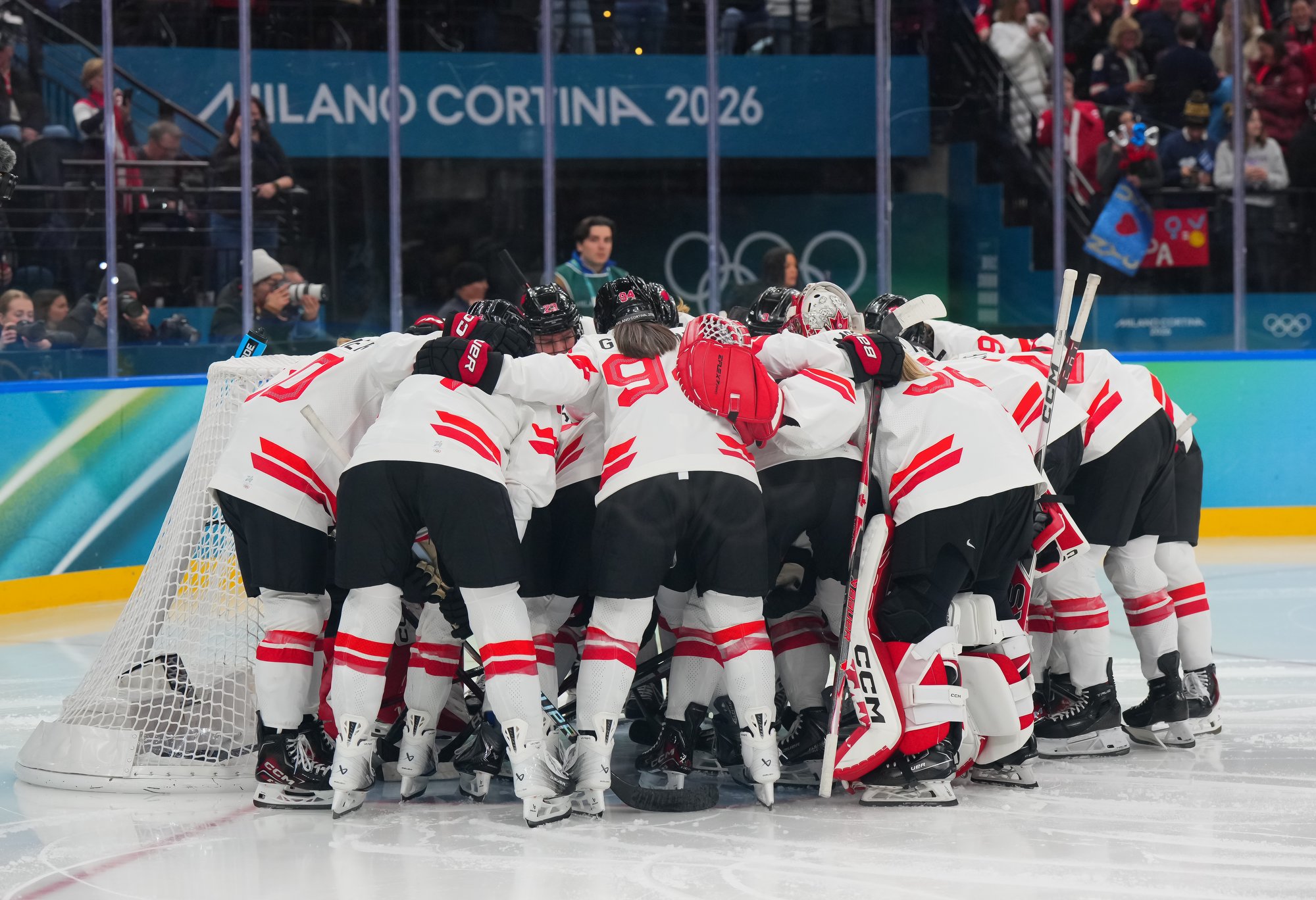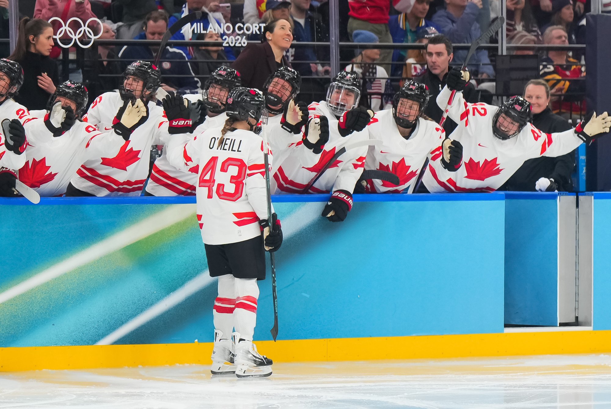 Santagiulia was packed with screaming fans, split more or less evenly between the two nations, and they had plenty to cheer for right from the get-go. Canada’s biggest challenge was to negate the U.S.’s flow and speed. To that end, they dumped the puck in and made the American defence chase the puck. In trouble in their own end, they cleared the puck to open ice, again forcing the Americans to chase down every loose puck. One-on-one battles along the boards? Not so much. Canada wasn’t interested.