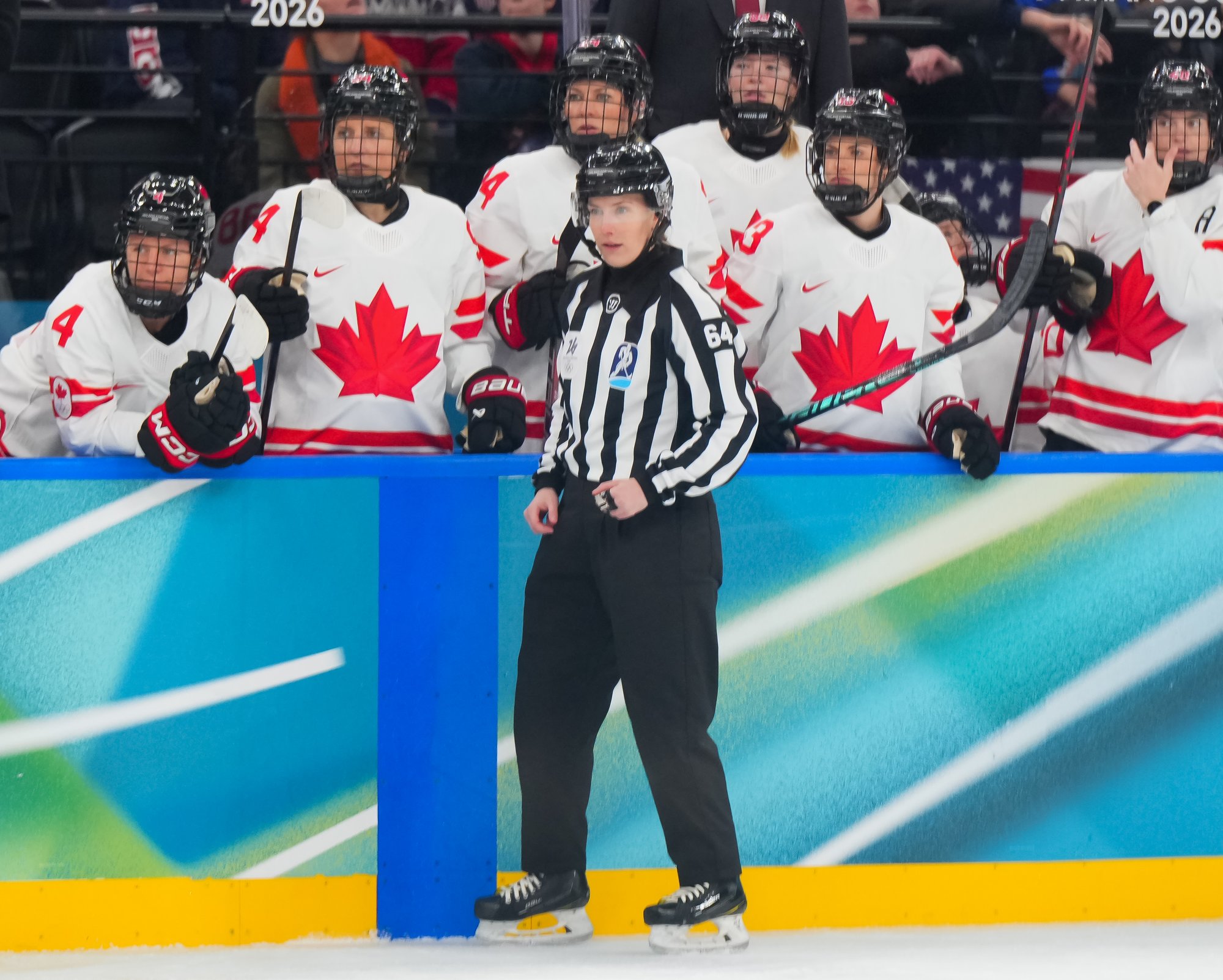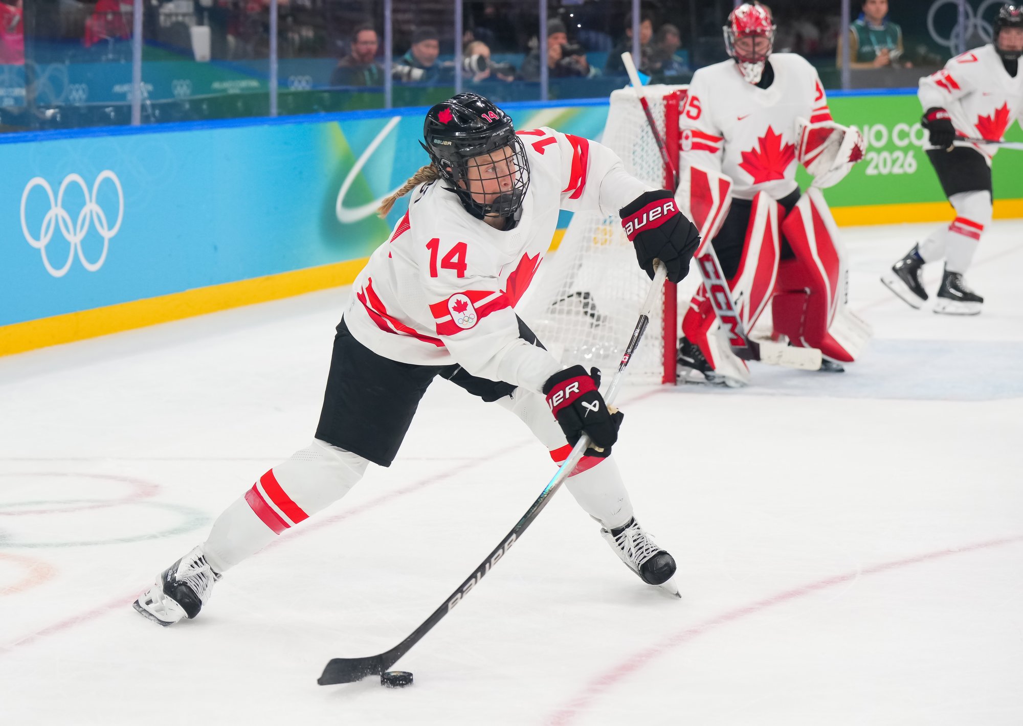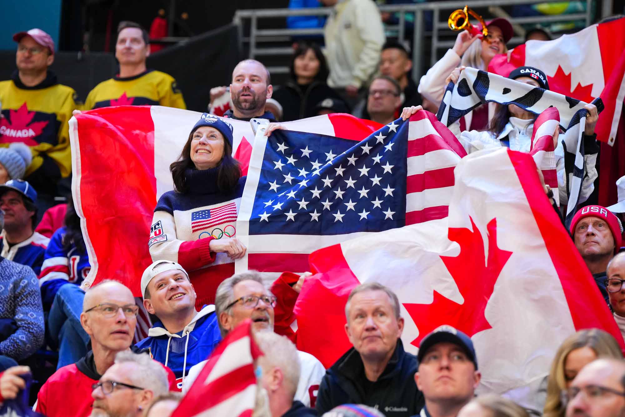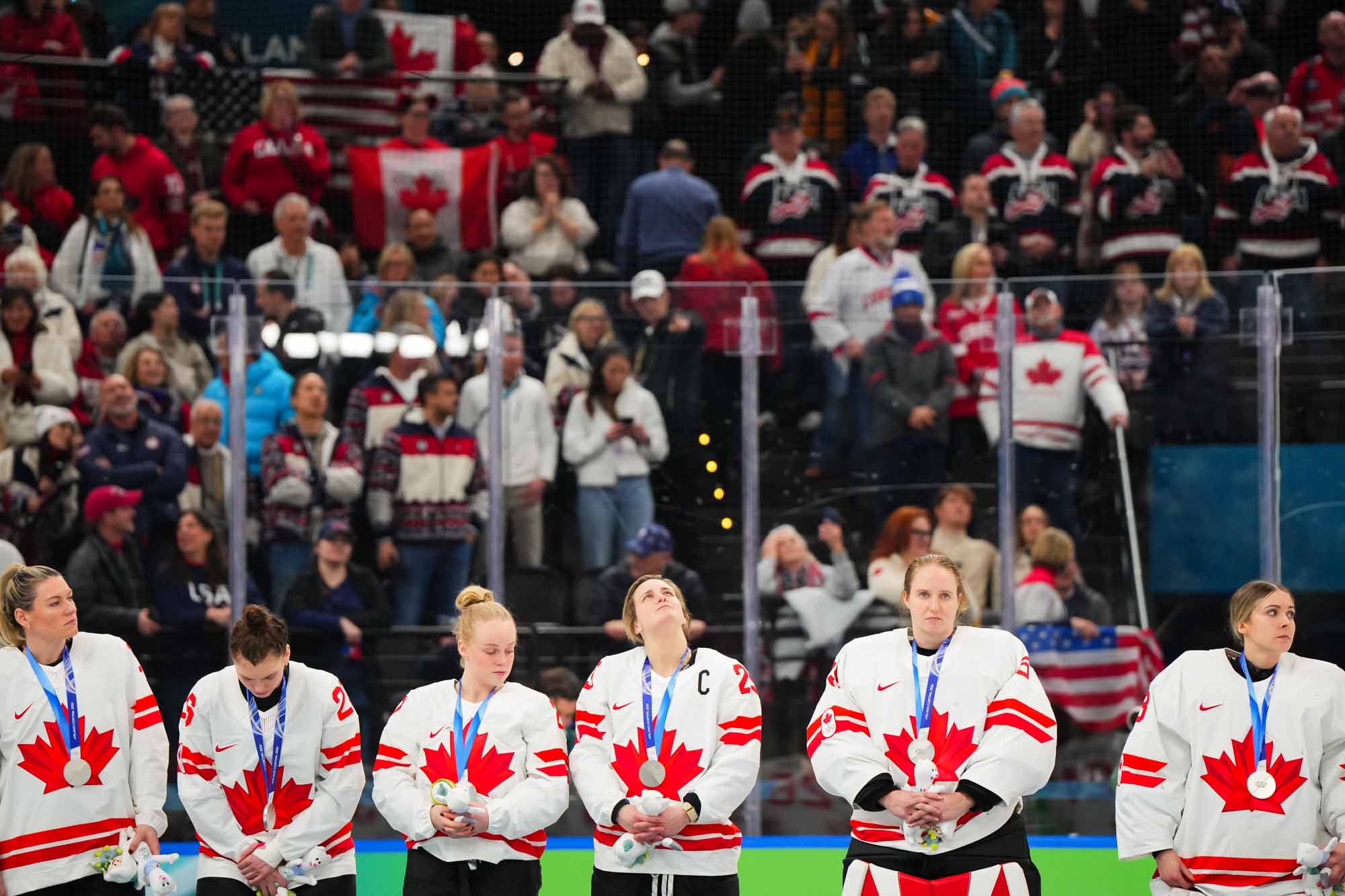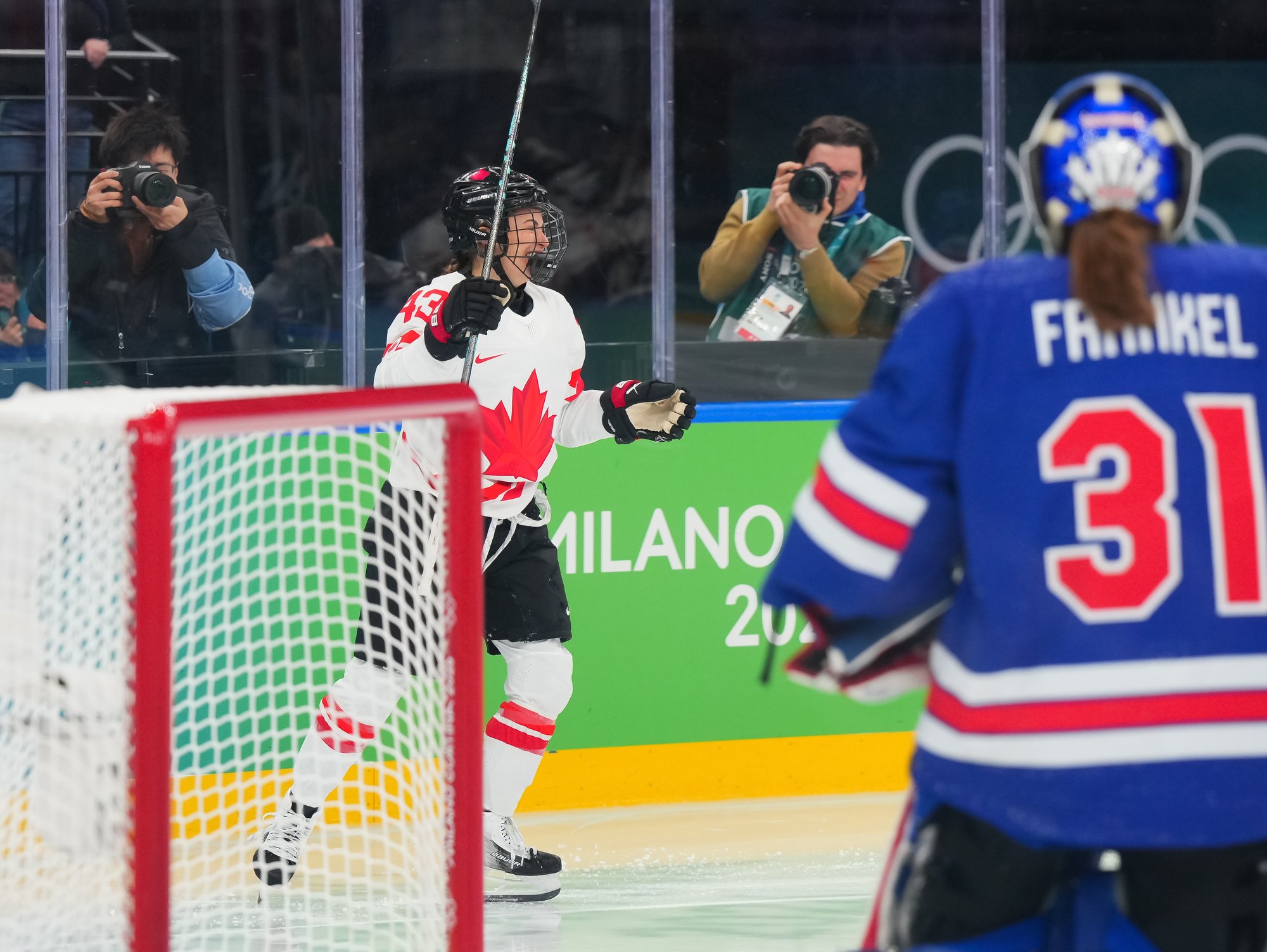 Santagiulia was packed with screaming fans, split more or less evenly between the two nations, and they had plenty to cheer for right from the get-go. Canada’s biggest challenge was to negate the U.S.’s flow and speed. To that end, they dumped the puck in and made the American defence chase the puck. In trouble in their own end, they cleared the puck to open ice, again forcing the Americans to chase down every loose puck. One-on-one battles along the boards? Not so much. Canada wasn’t interested.