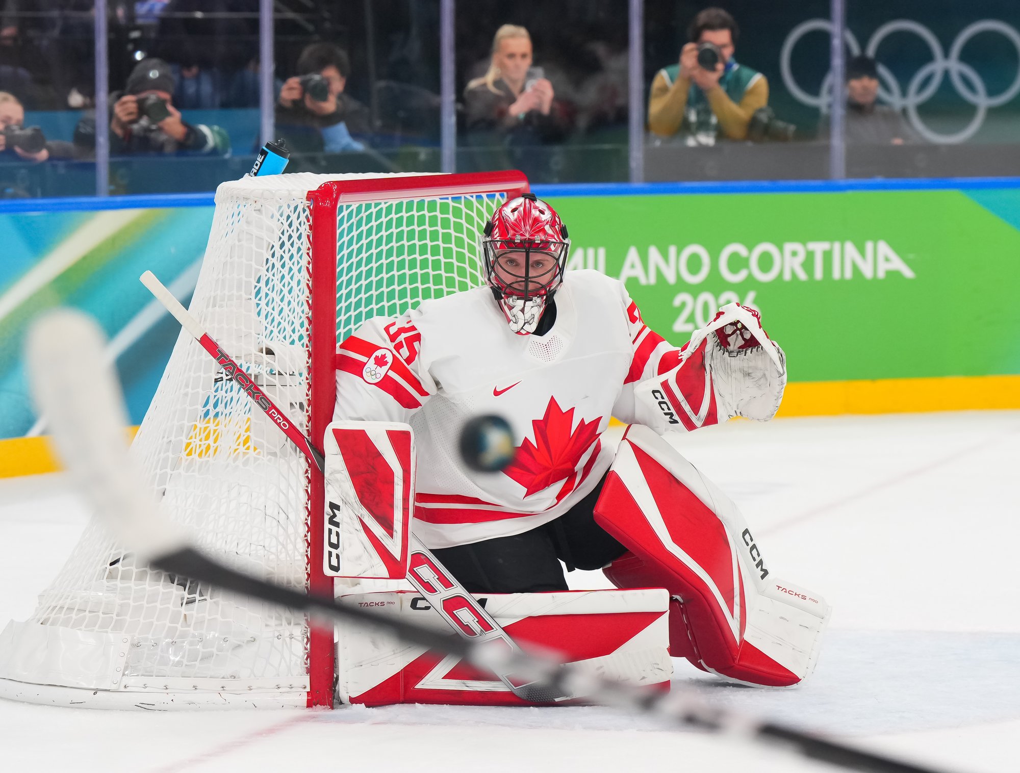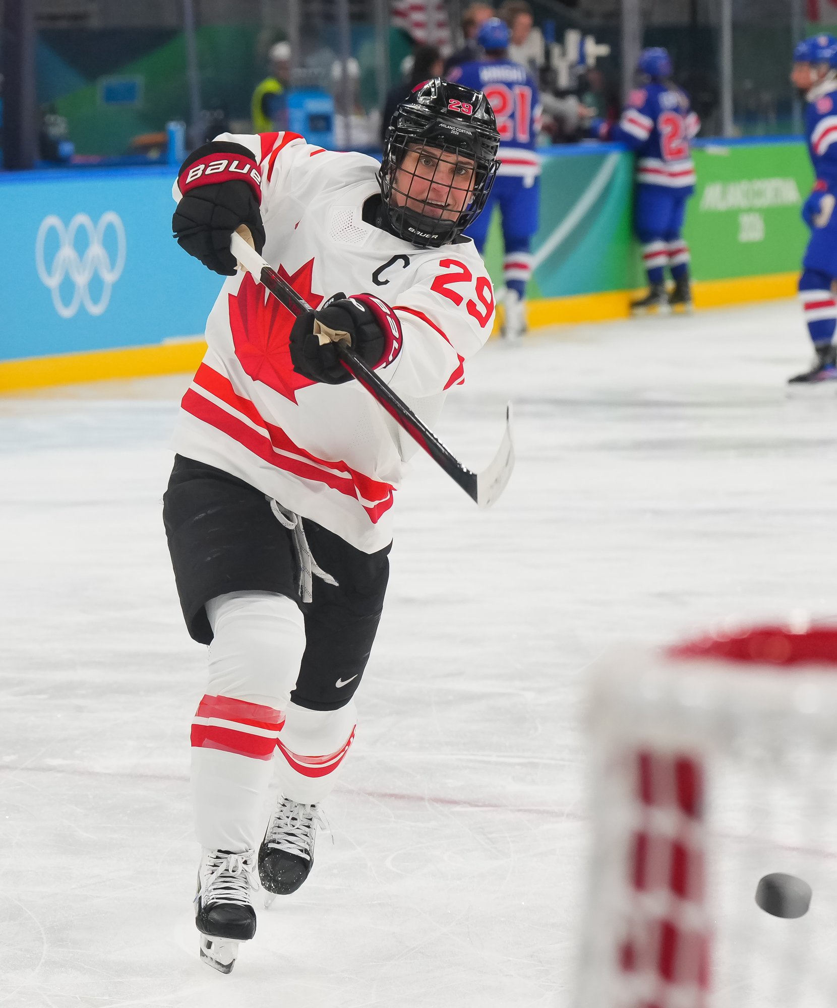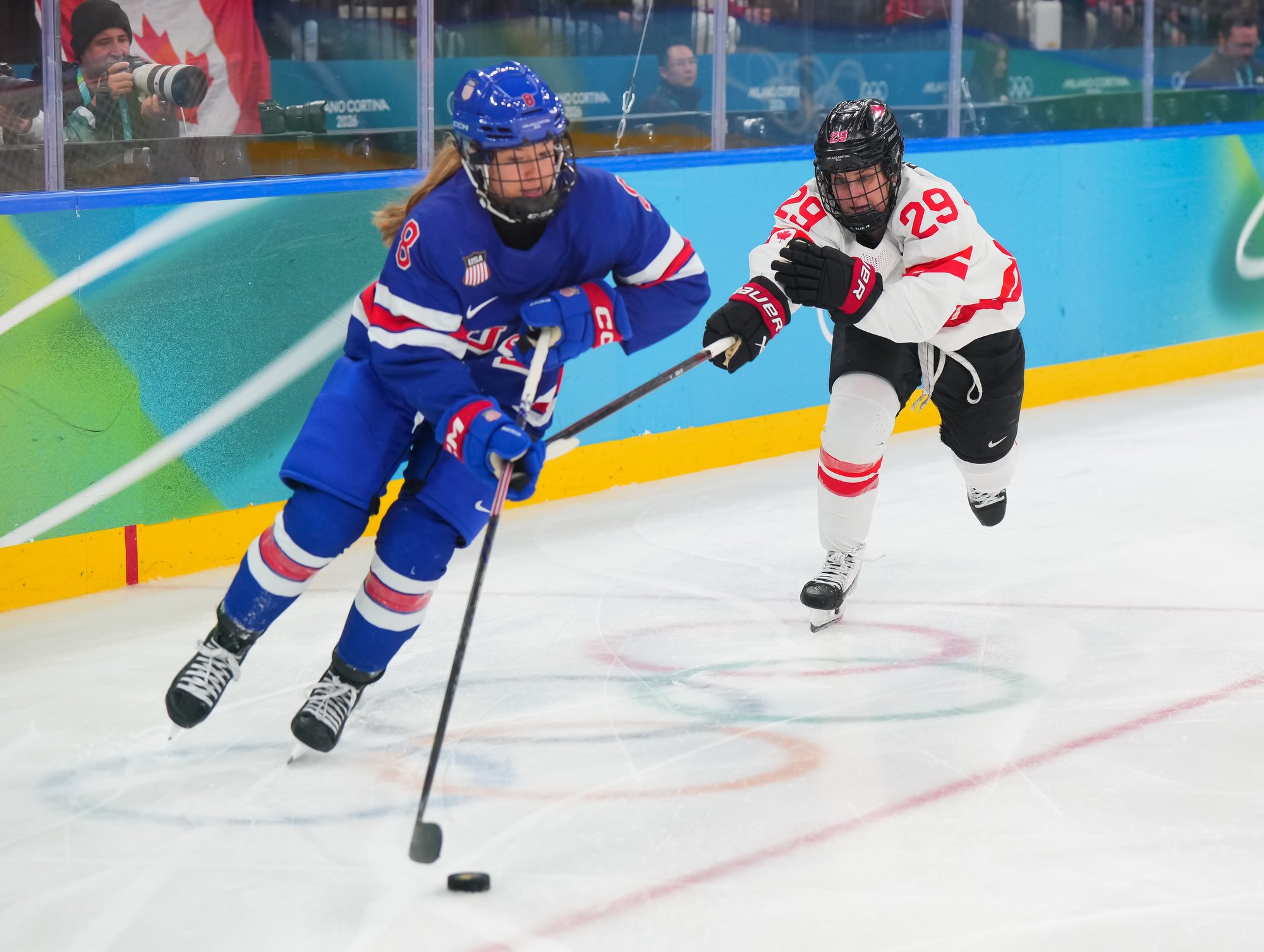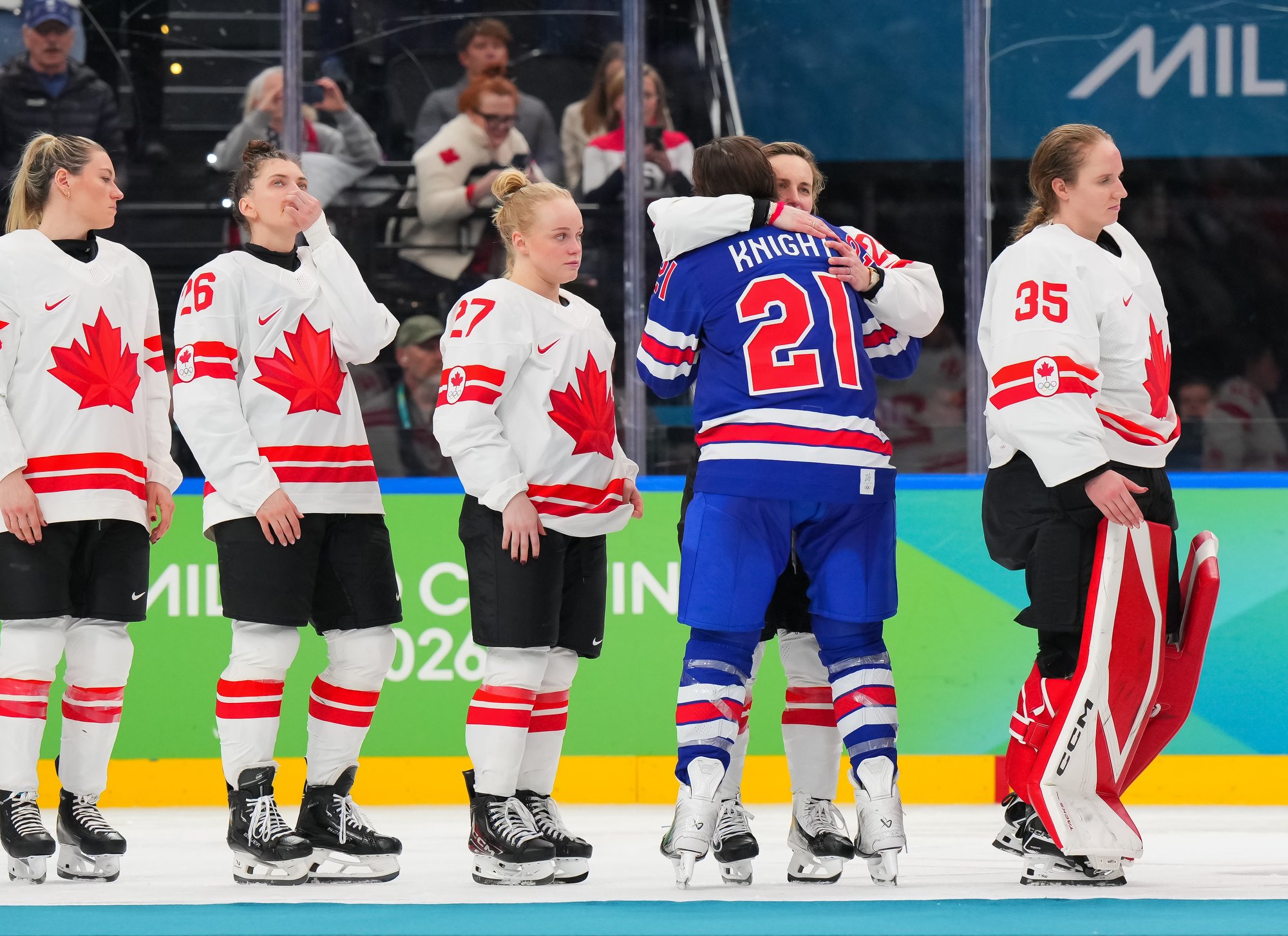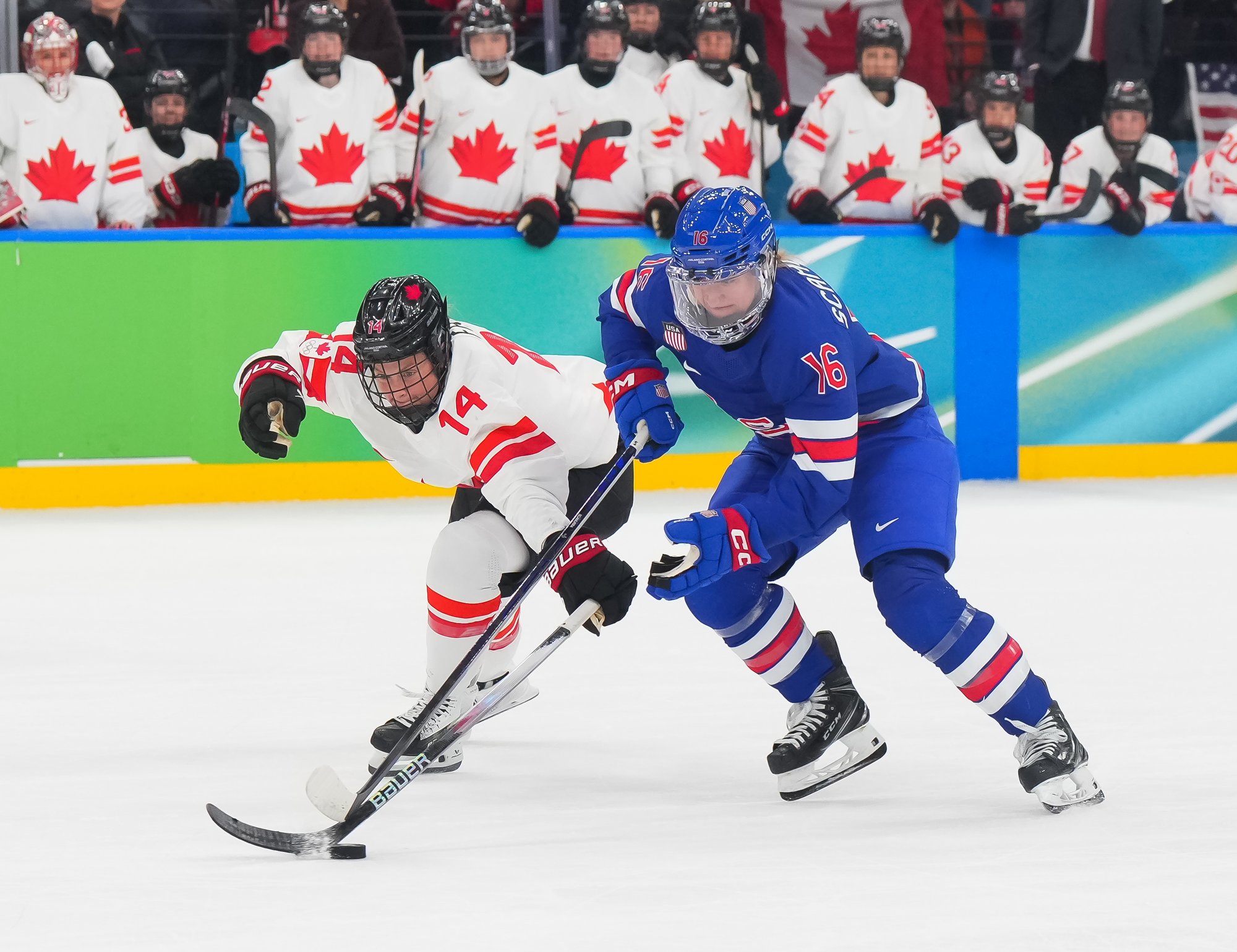 Santagiulia was packed with screaming fans, split more or less evenly between the two nations, and they had plenty to cheer for right from the get-go. Canada’s biggest challenge was to negate the U.S.’s flow and speed. To that end, they dumped the puck in and made the American defence chase the puck. In trouble in their own end, they cleared the puck to open ice, again forcing the Americans to chase down every loose puck. One-on-one battles along the boards? Not so much. Canada wasn’t interested.