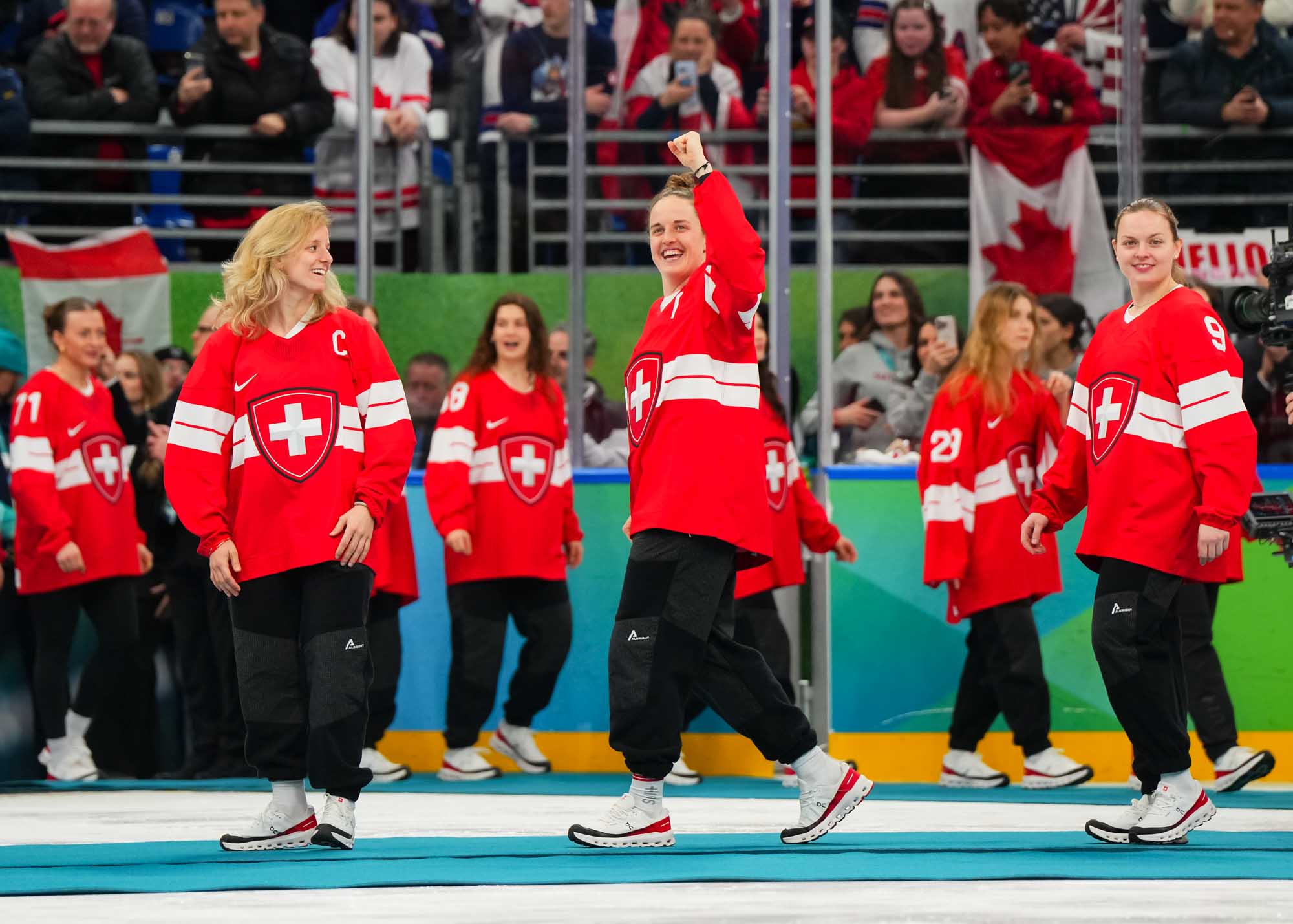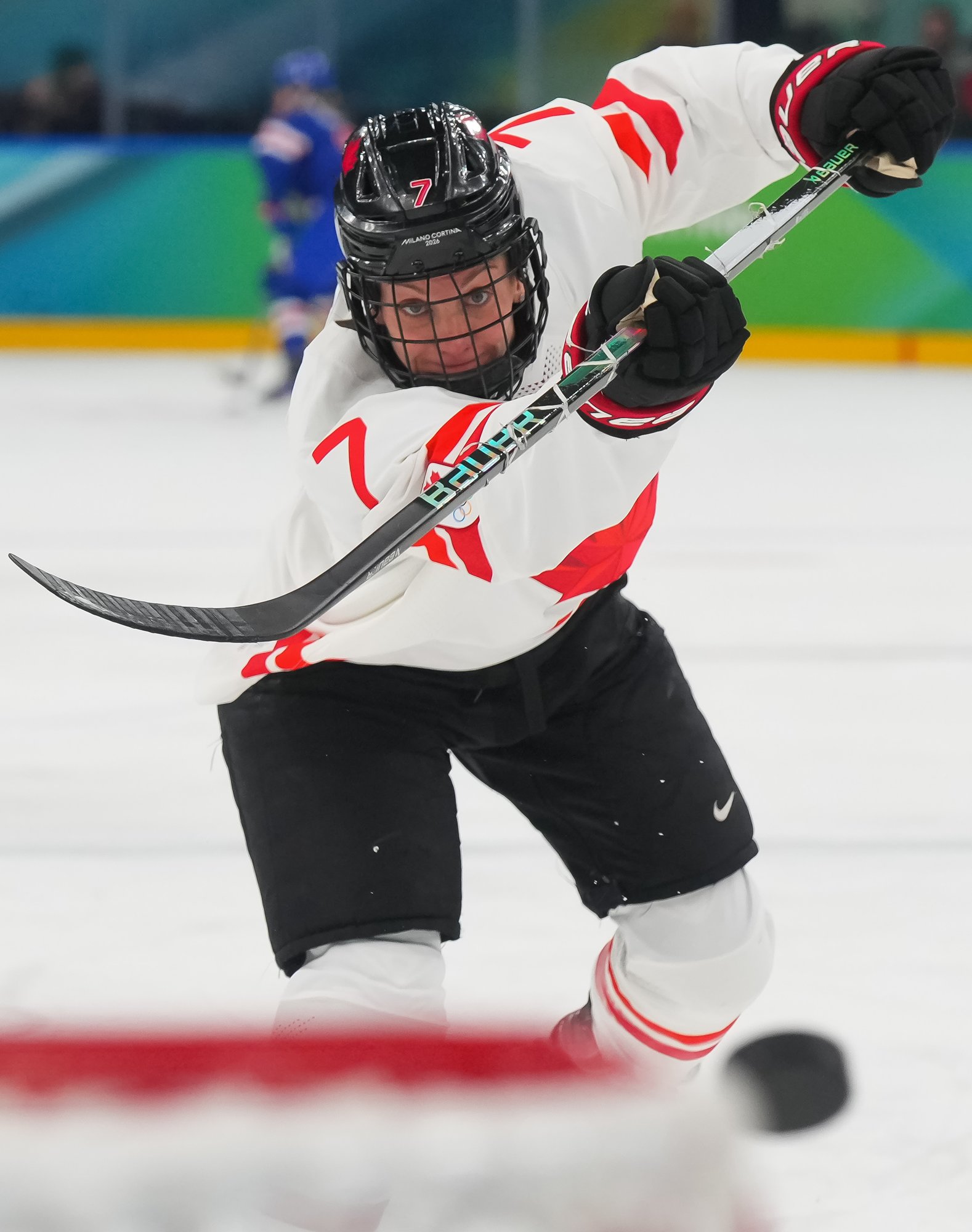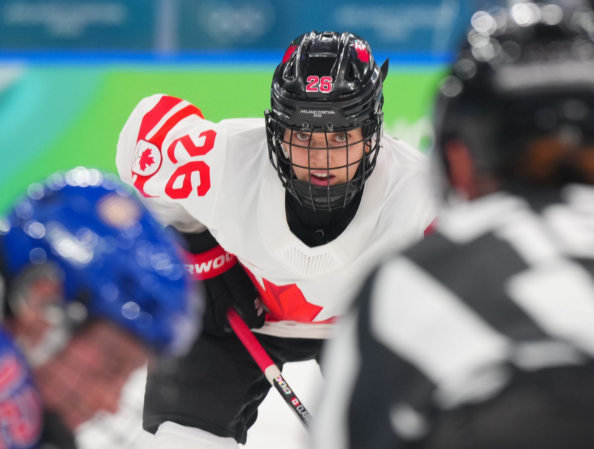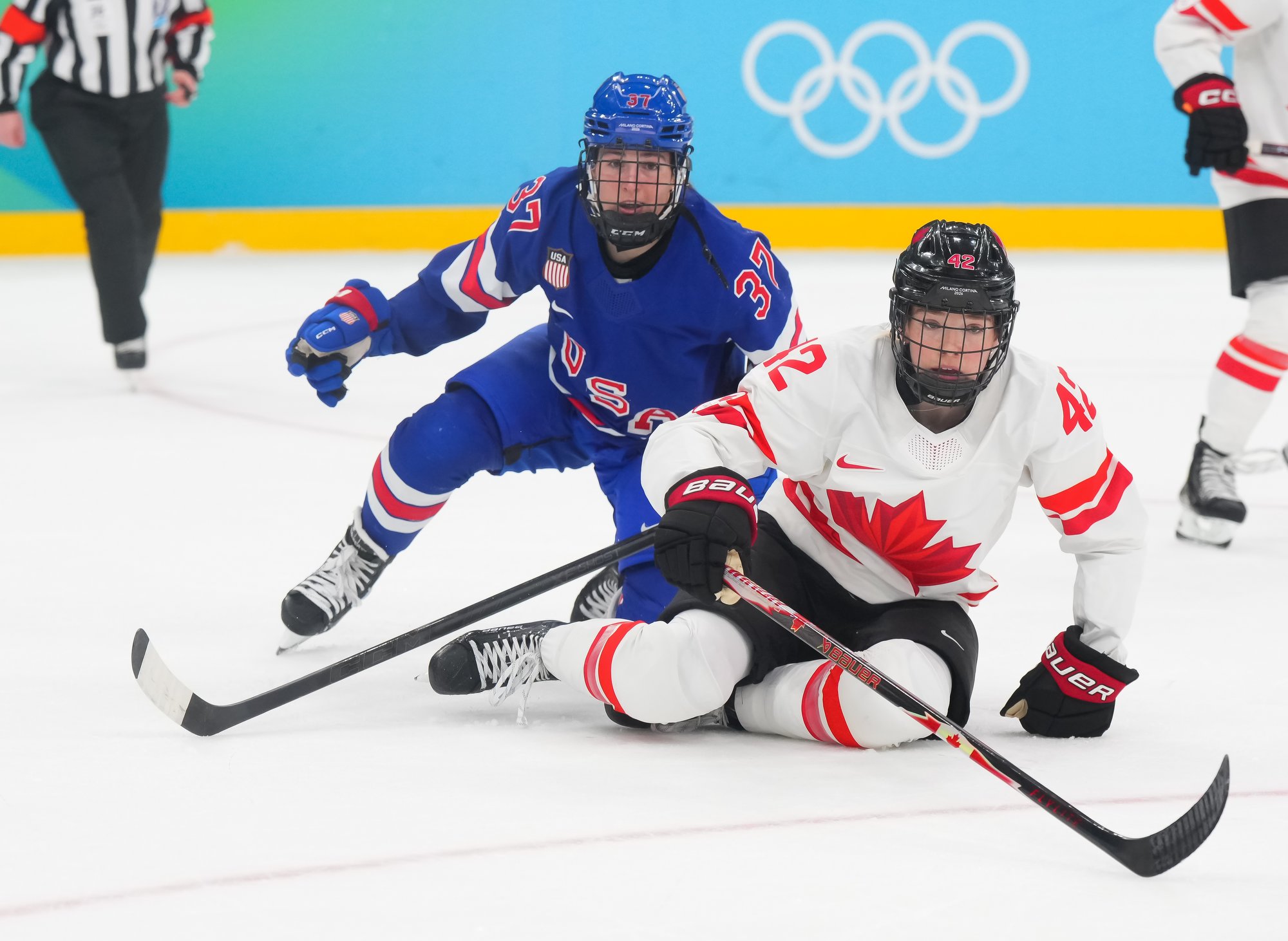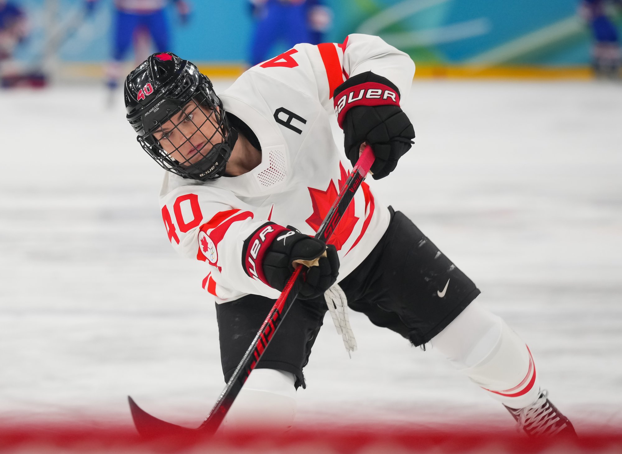 Santagiulia was packed with screaming fans, split more or less evenly between the two nations, and they had plenty to cheer for right from the get-go. Canada’s biggest challenge was to negate the U.S.’s flow and speed. To that end, they dumped the puck in and made the American defence chase the puck. In trouble in their own end, they cleared the puck to open ice, again forcing the Americans to chase down every loose puck. One-on-one battles along the boards? Not so much. Canada wasn’t interested.