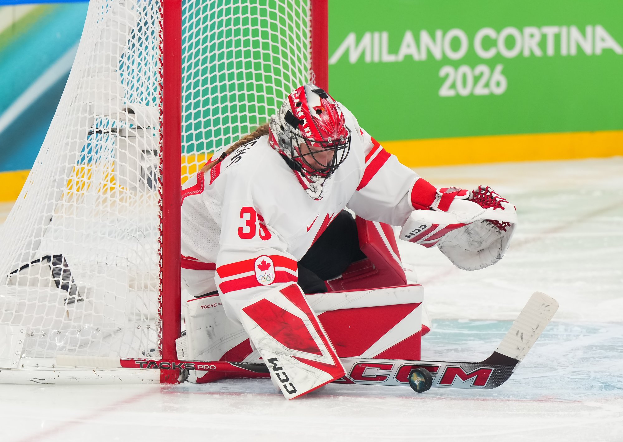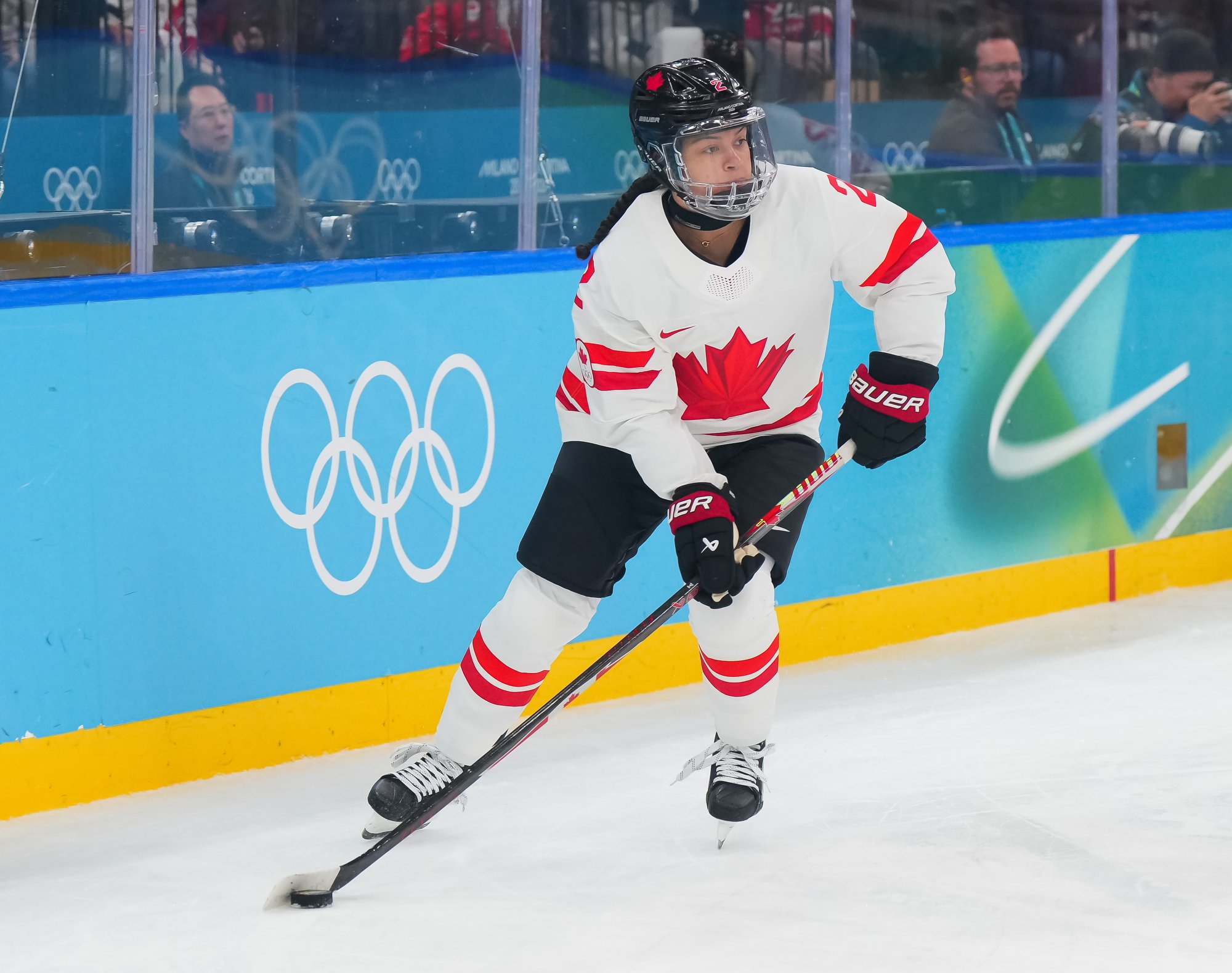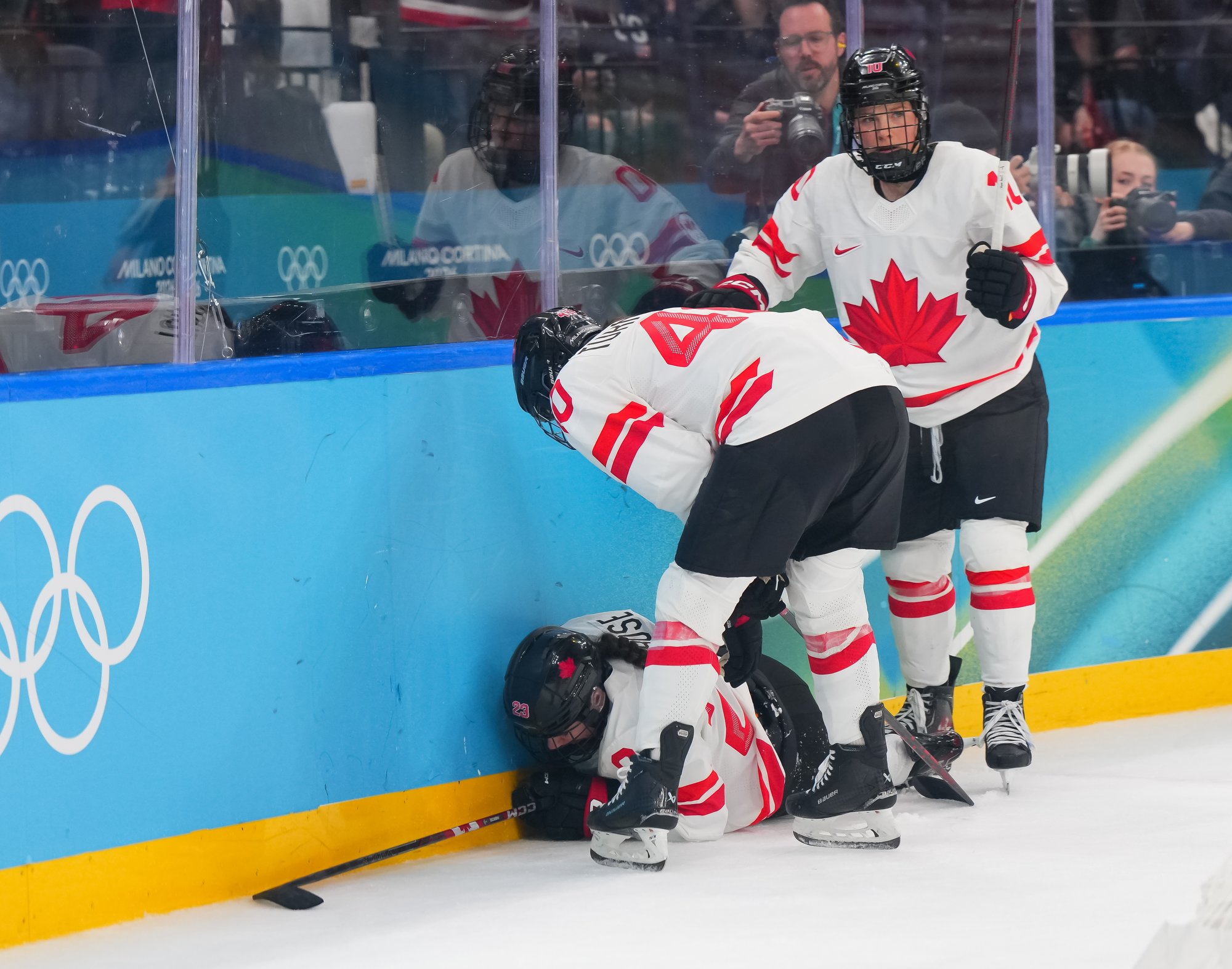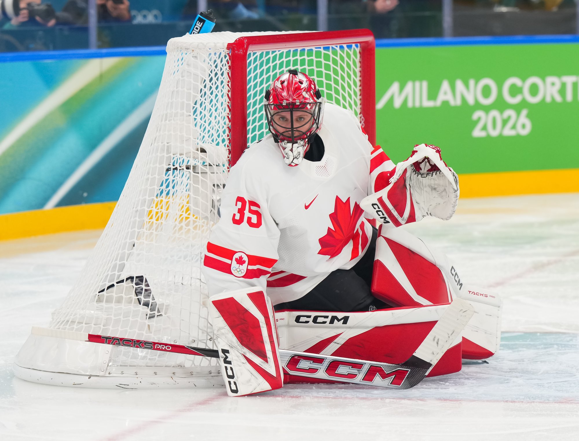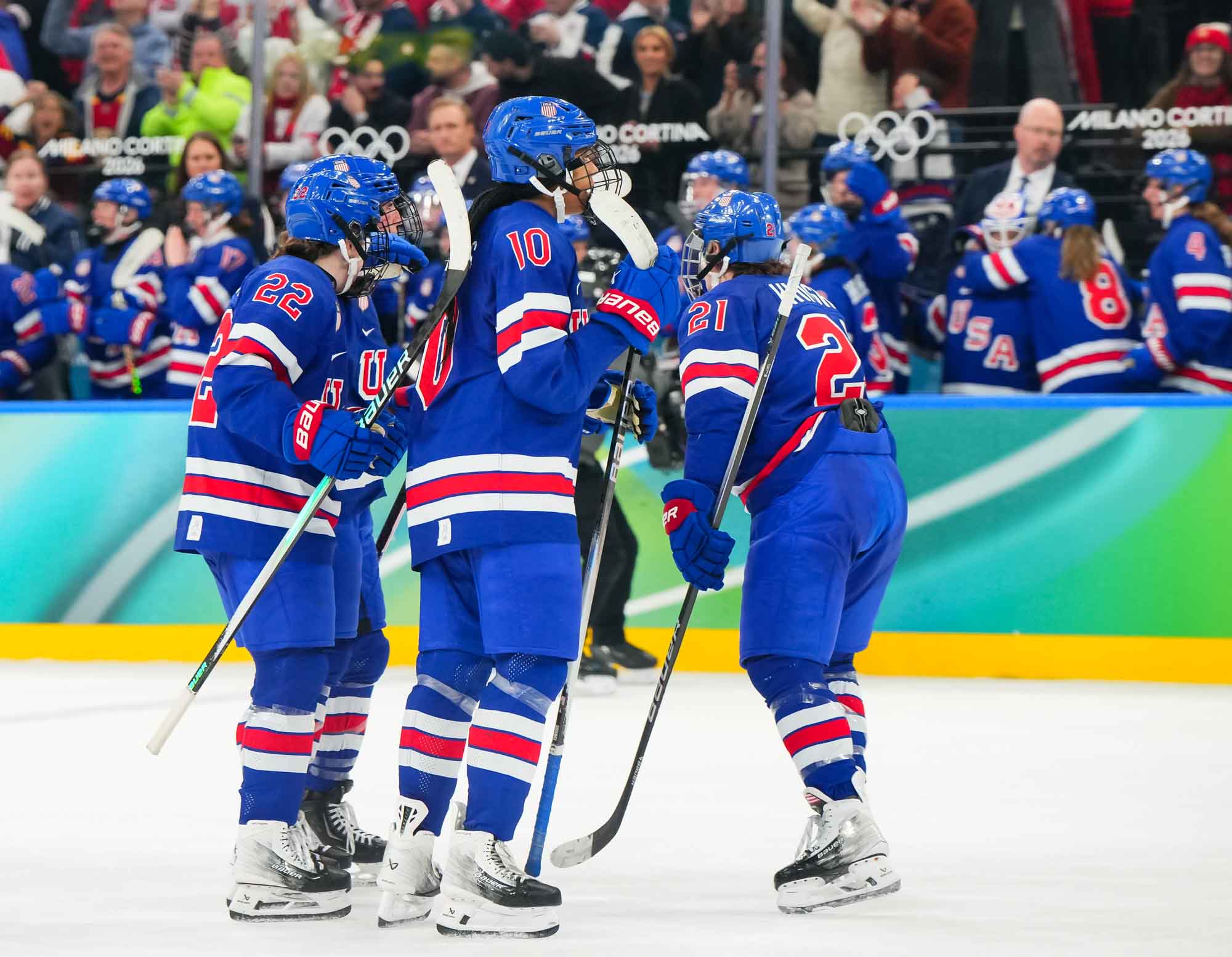 Santagiulia was packed with screaming fans, split more or less evenly between the two nations, and they had plenty to cheer for right from the get-go. Canada’s biggest challenge was to negate the U.S.’s flow and speed. To that end, they dumped the puck in and made the American defence chase the puck. In trouble in their own end, they cleared the puck to open ice, again forcing the Americans to chase down every loose puck. One-on-one battles along the boards? Not so much. Canada wasn’t interested.