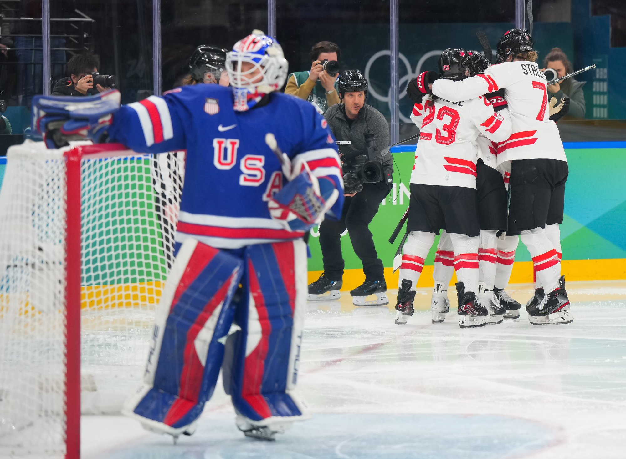 Incredibly, it was Canada that capitalized on the four-on-five situation. An American turnover gave Laura Stacey a two-on-one when Kristin O’Neill jumped into the play and skated with every fibre of her being to join the rush. And then, just when it looked like Stacey might be checked, she squeezed the puck over to O'Neill, who now went in alone. She made a brilliant deke on Frankel and tucked the puck in the empty side of the net, just 54 seconds into the period. Incredibly, the scoreboard read Canada 1-United States 0.