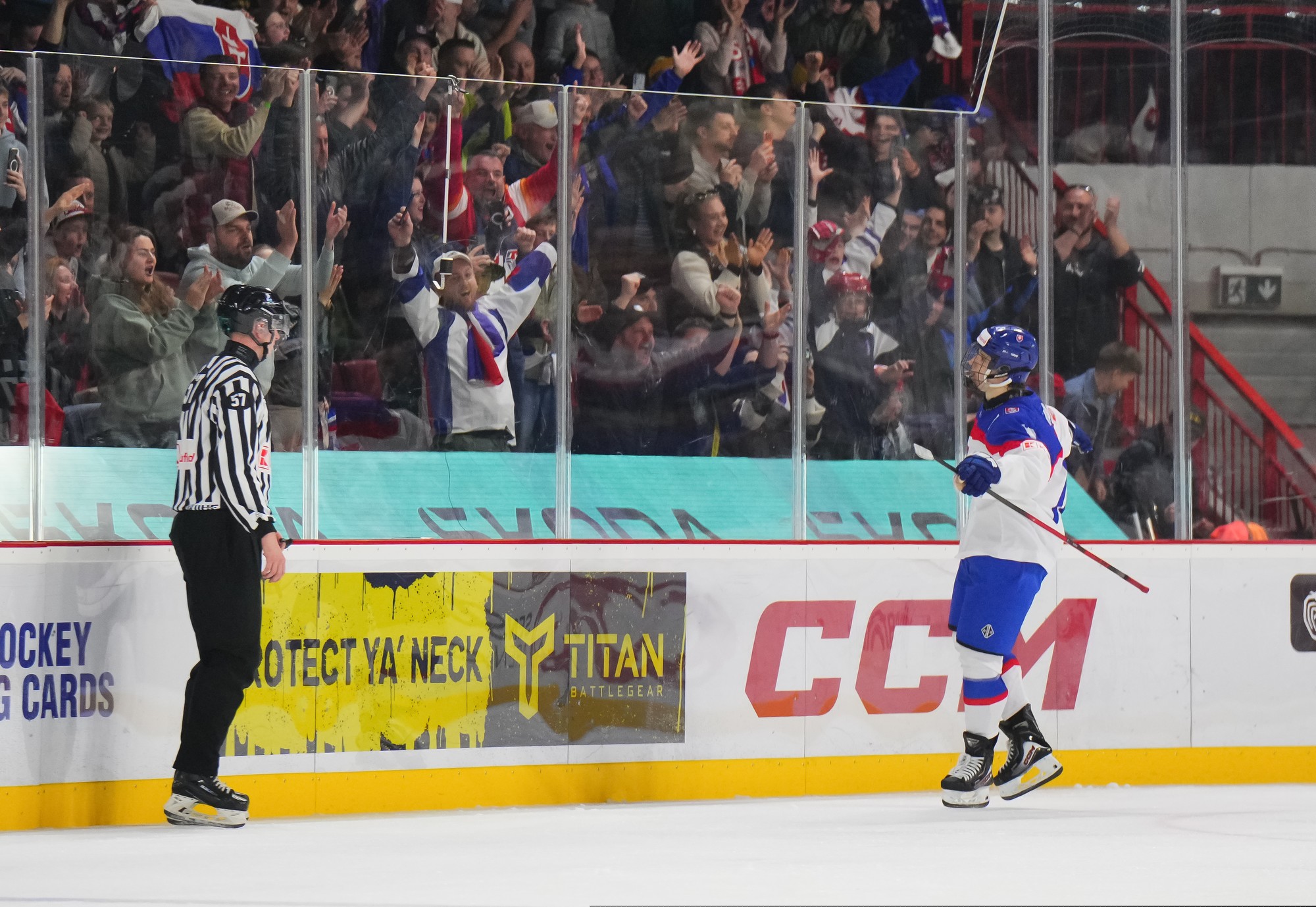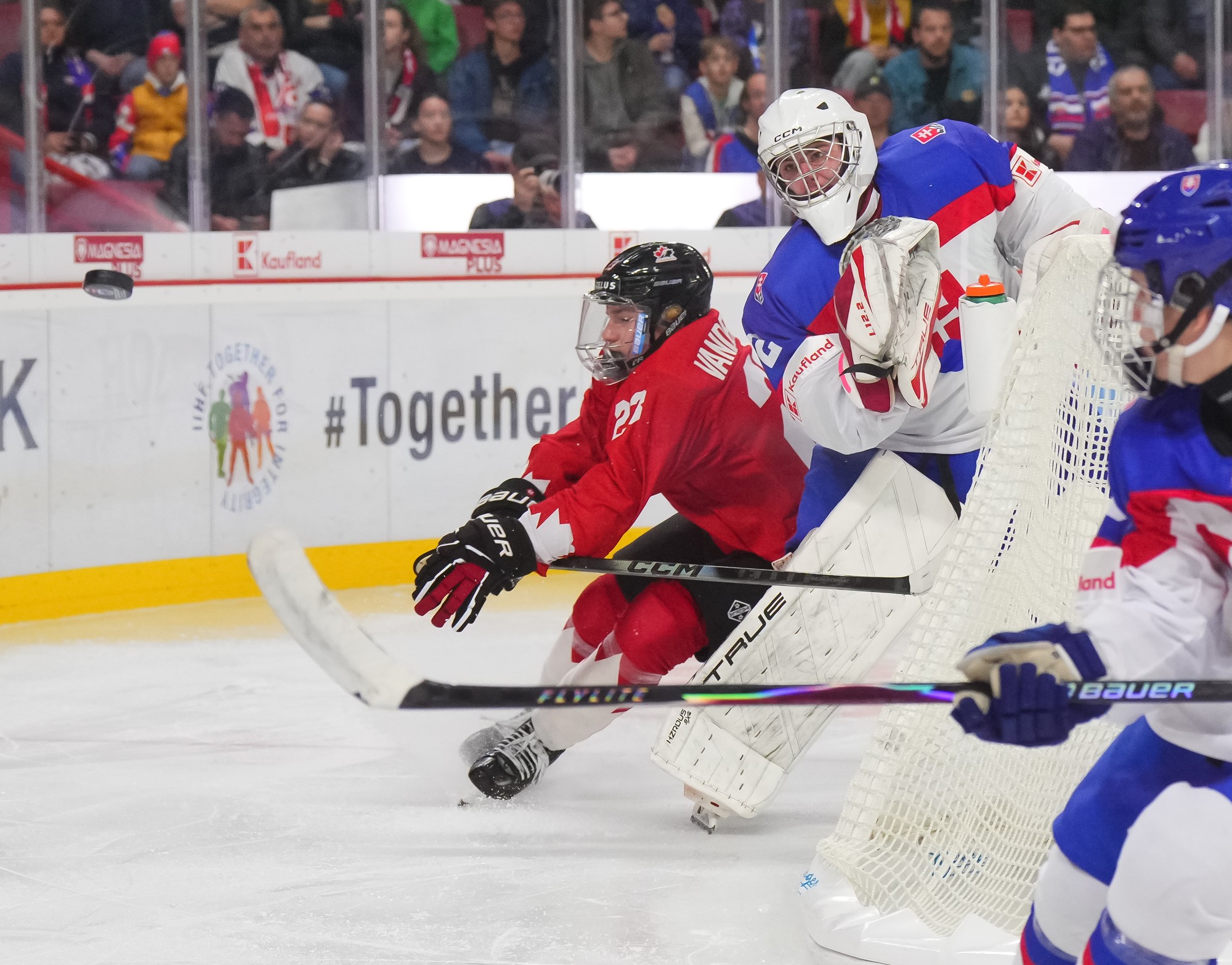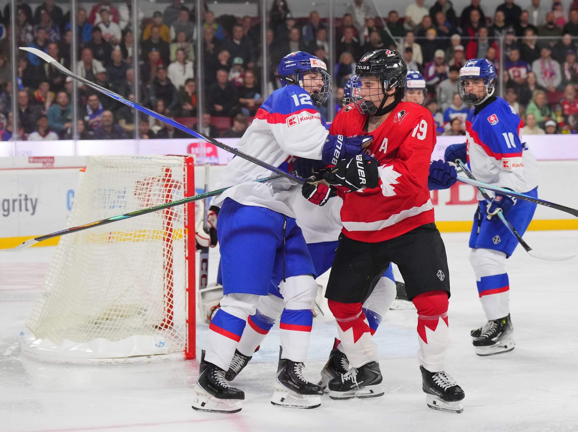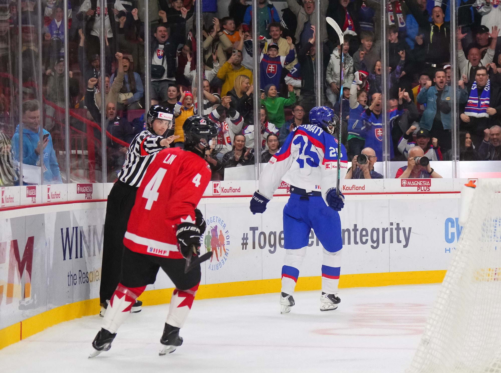 But Canada has resilience in its hockey DNA. A couple of minutes after that goal, with the jubilation still bubbling around the arena, a Slovak penalty led to an equalizer. This was one from the coach’s playbook, slick passing around the zone culminating in Adam Valentini’s feed in front of the net for Mathis Preston to touch home at the back door.