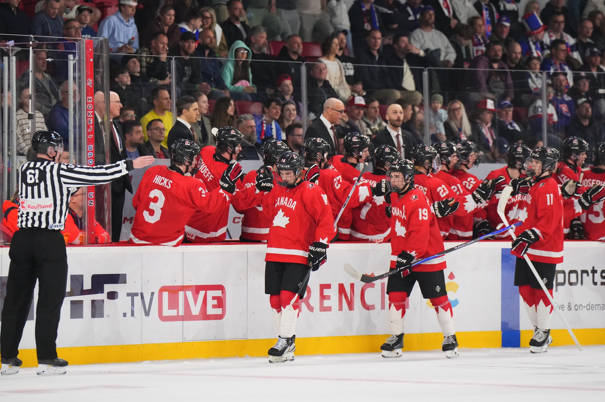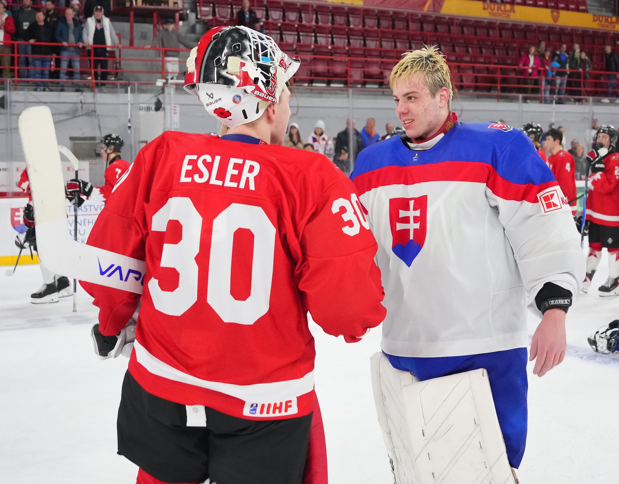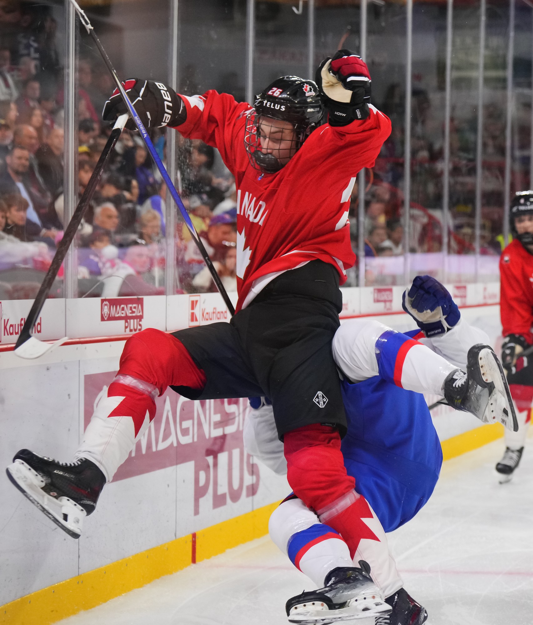 But Canada has resilience in its hockey DNA. A couple of minutes after that goal, with the jubilation still bubbling around the arena, a Slovak penalty led to an equalizer. This was one from the coach’s playbook, slick passing around the zone culminating in Adam Valentini’s feed in front of the net for Mathis Preston to touch home at the back door.