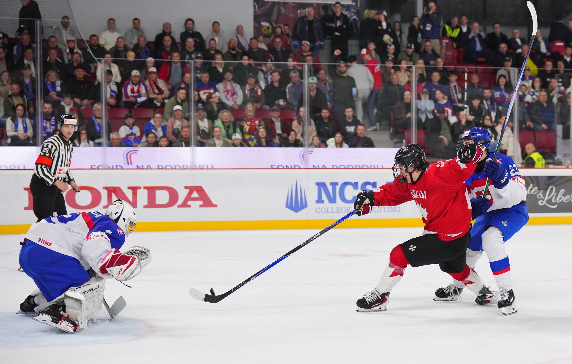 Kazda’s neat finish, drawing back-up goalie Carter Esler off his crease and calmly slotting the puck behind him, sparked joyous scenes at a fervent Pavol Demitra Stadium on the opening night of the 2026 IIHF Men’s U18 World Championship.