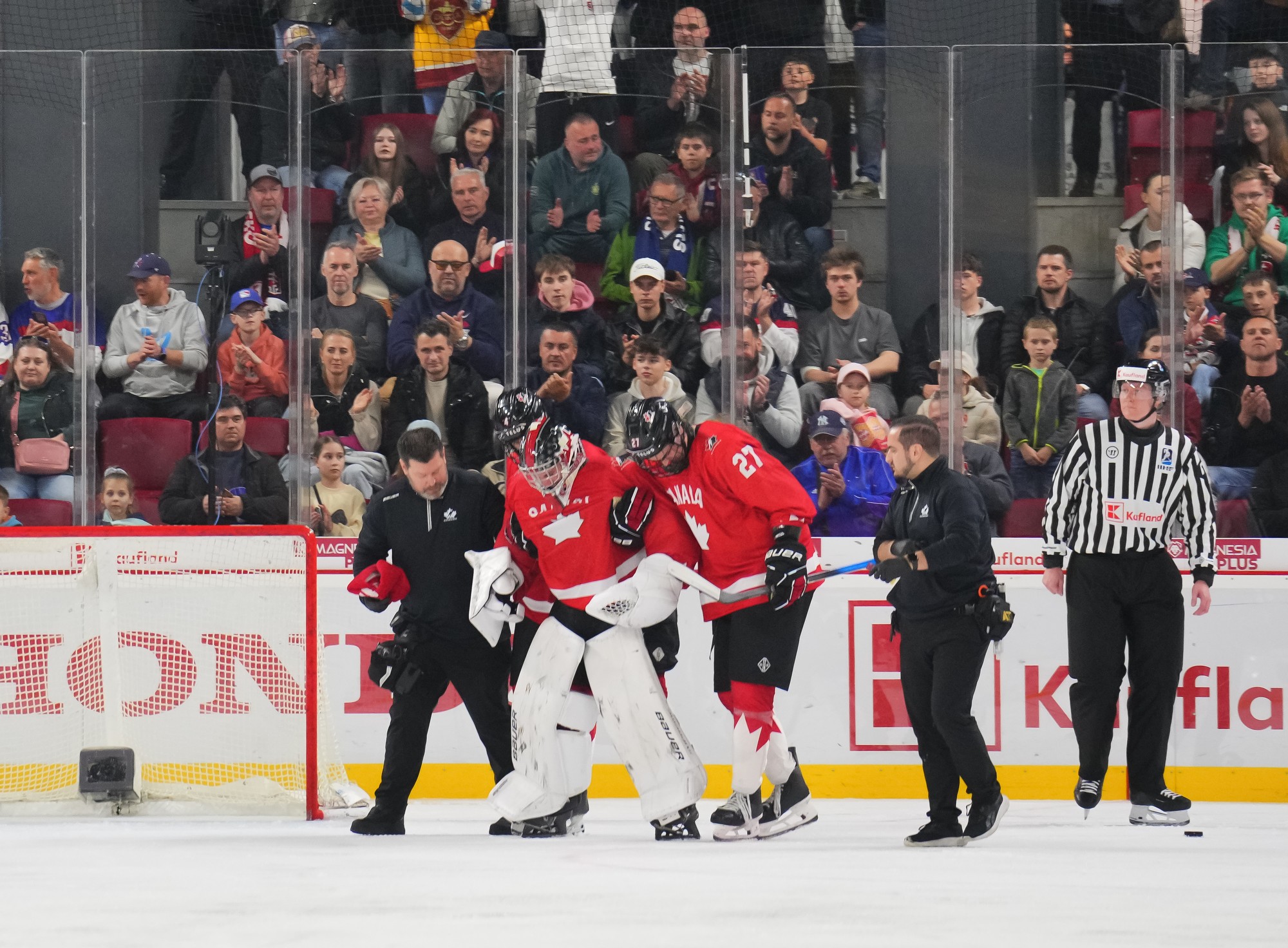 The crowd was quelled – but only briefly. Maxim Simko’s forward charge soon cranked the volume back up, even though Kazda’s shot did not trouble Betts. And the game remained poised at the start of the third. Canada had saw chances missed by di Iorio and Thomas Rousseau.