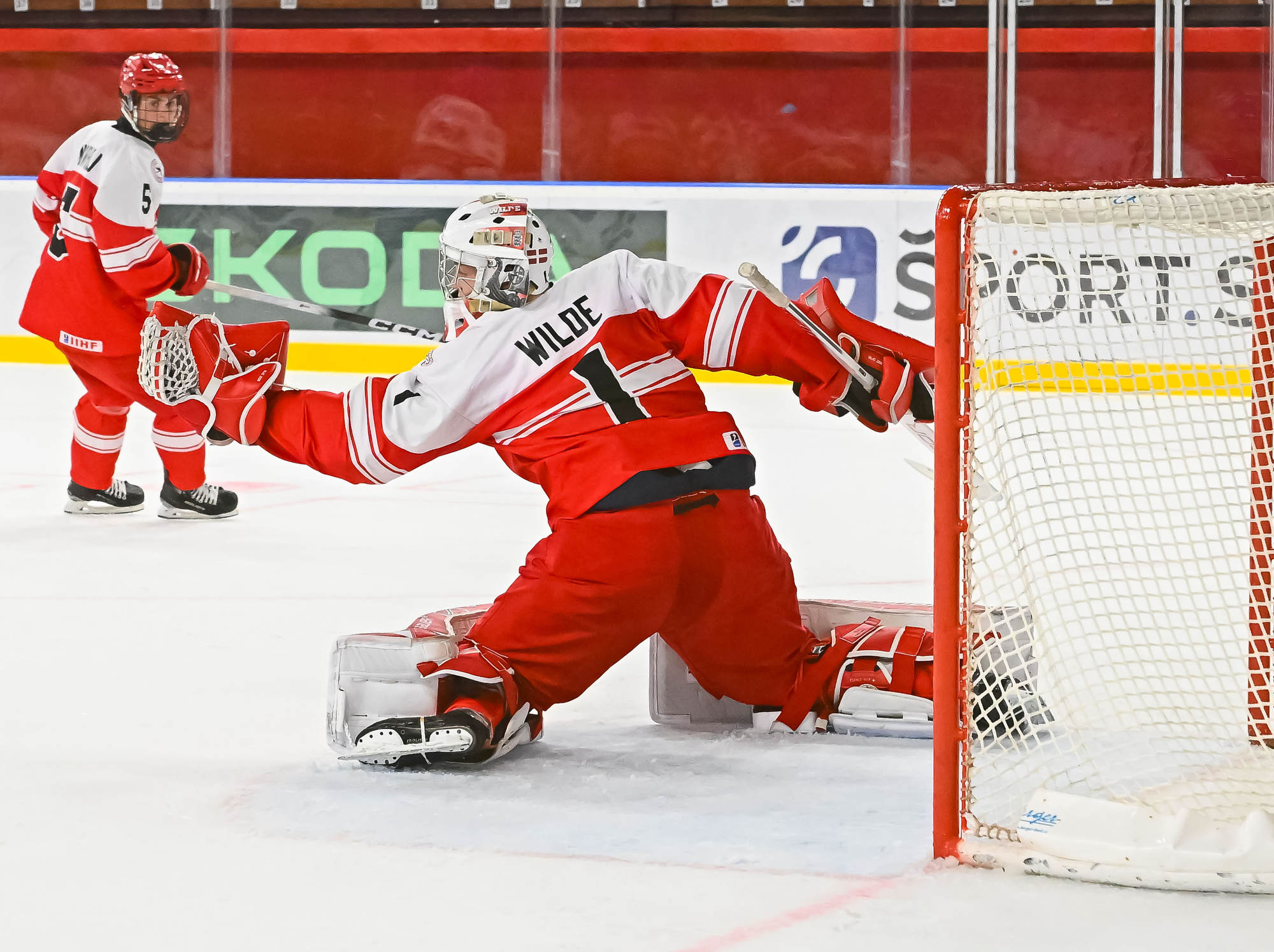 Already on the power play, Denmark had a 5-on-3 opportunity later in the middle frame. Still one man down, Parker Trottier got a shorthanded breakaway but was pulled down by Heinsen with 3:55 left, resulting in a penalty shot. On Trottier’s attempt, however, Wilde was patient and didn’t bite at the deke attempt.