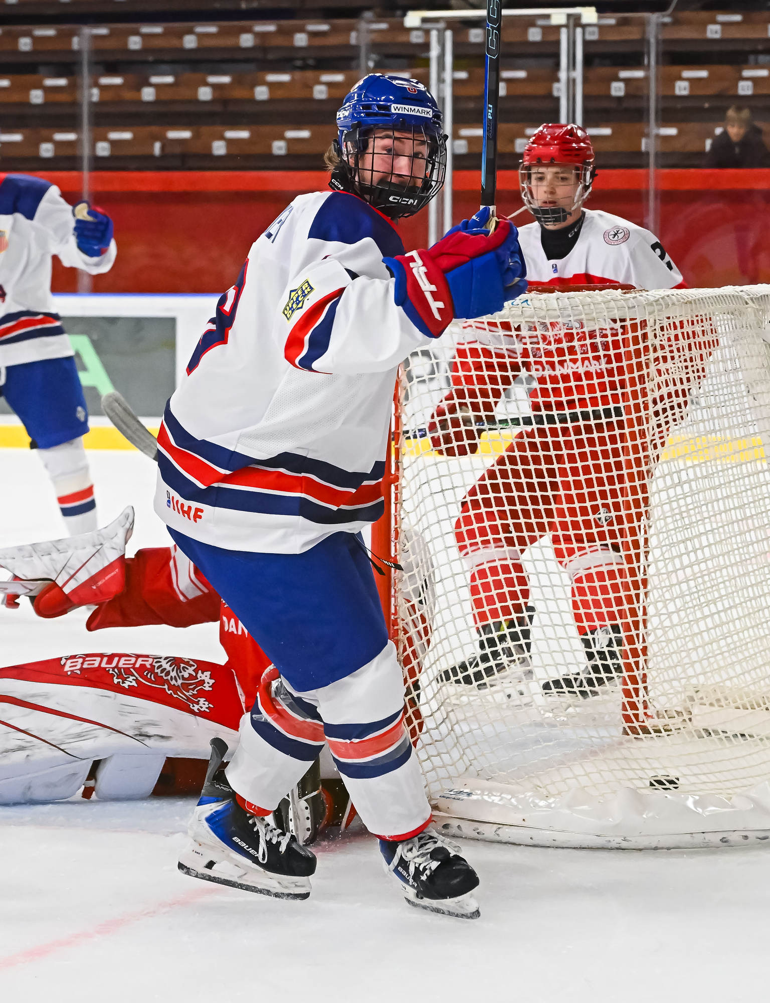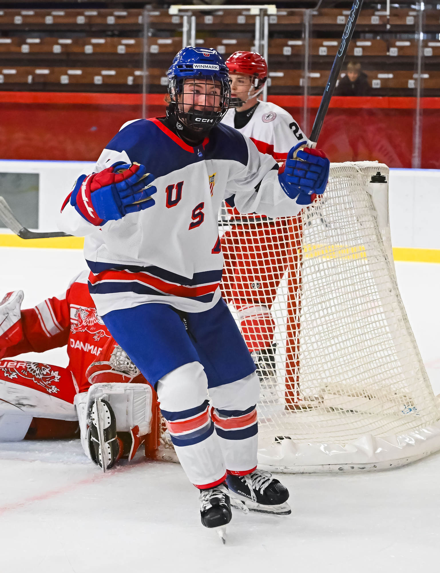 The Americans again held a decisive edge in play in the third period, outshooting the Danes 19-1. Wilde made several more great saves, but the 2-0 goal finally came on a lucky bounce. On the power play, Victor Plante’s centring pass went off the skate of Beuker and in with 3:17 to play.