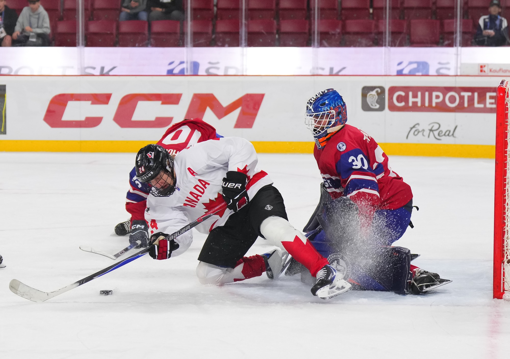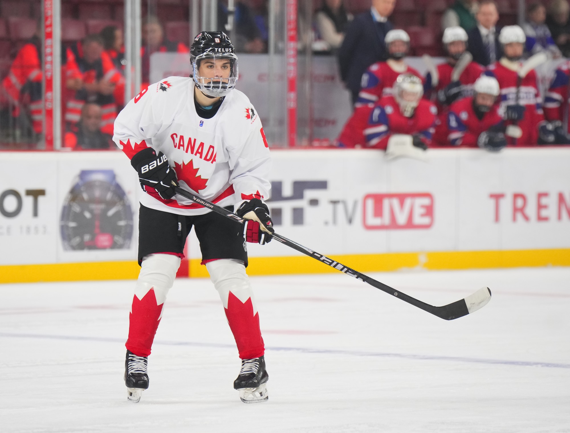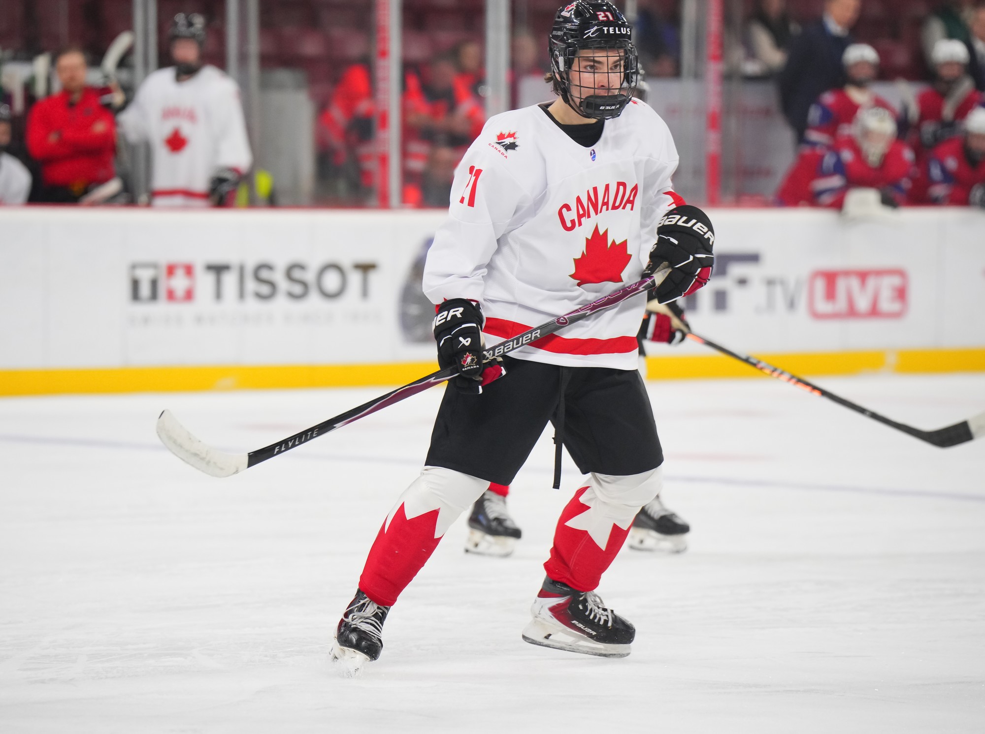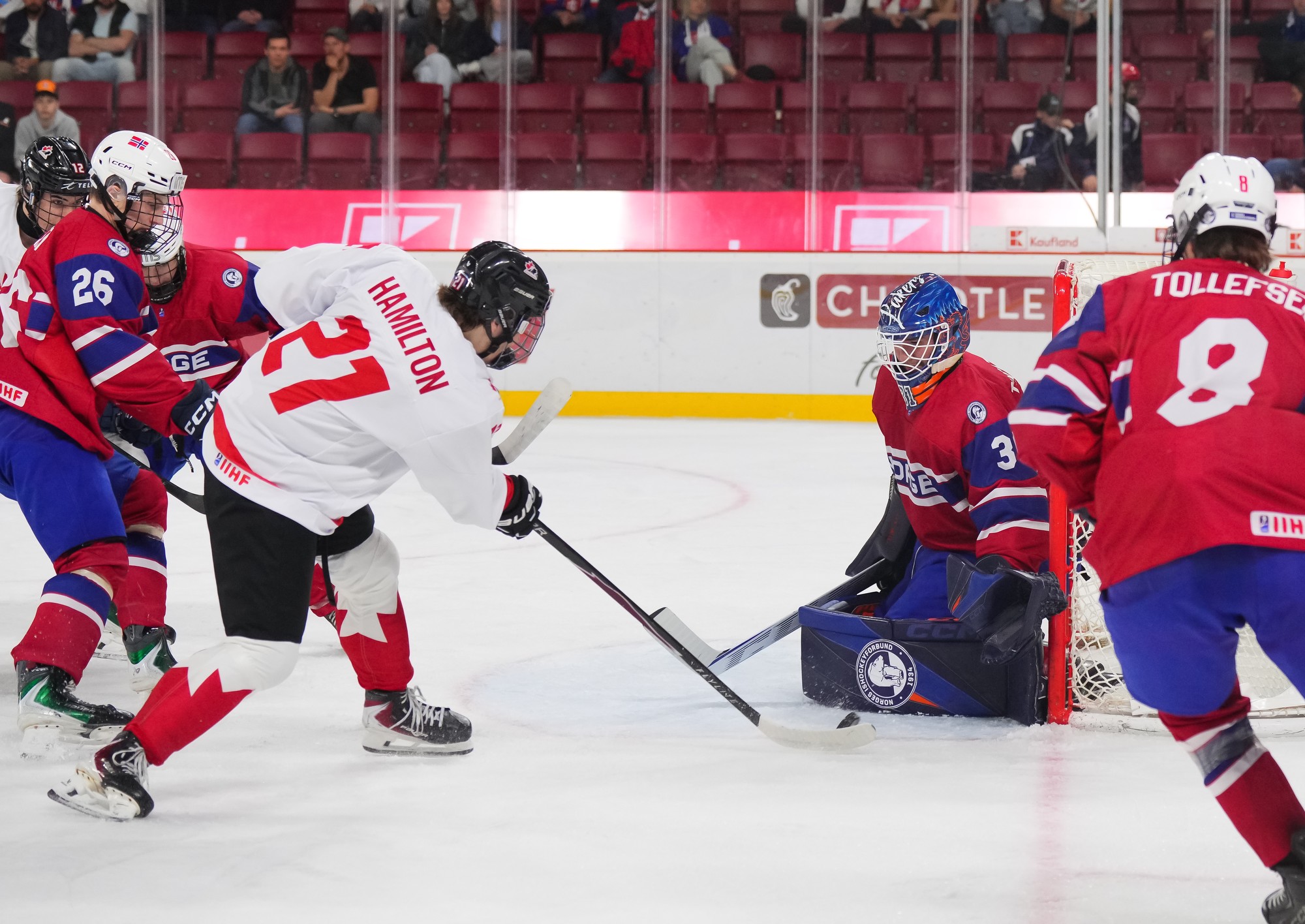 Canada did not have to wait long for more goals. In the 17th minute Zhilkin redirected a Mathis Preston feed into the net, then he assisted as Lawrence added a third just before the intermission for a second power play goal of the game.