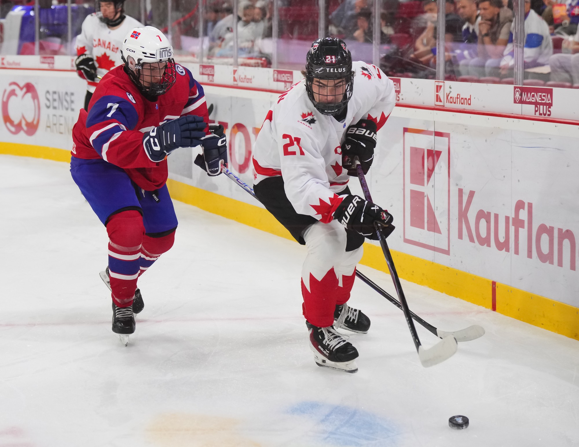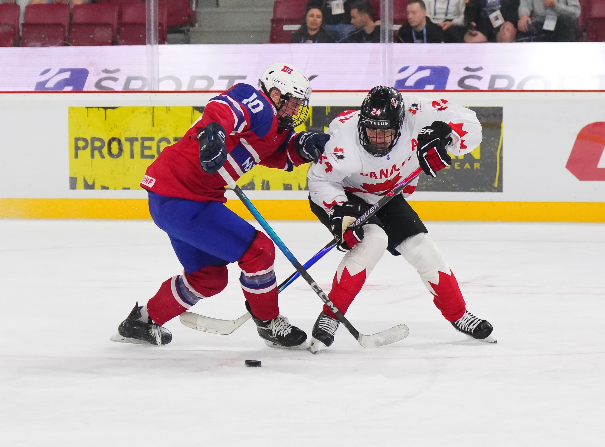 Canada's hat-trick hero Dima Zhilkin moves away from Norwegian defender Philip Tollefsen at the 2026 IIHF U18 Men's World Championship in Trencin, Slovakia.