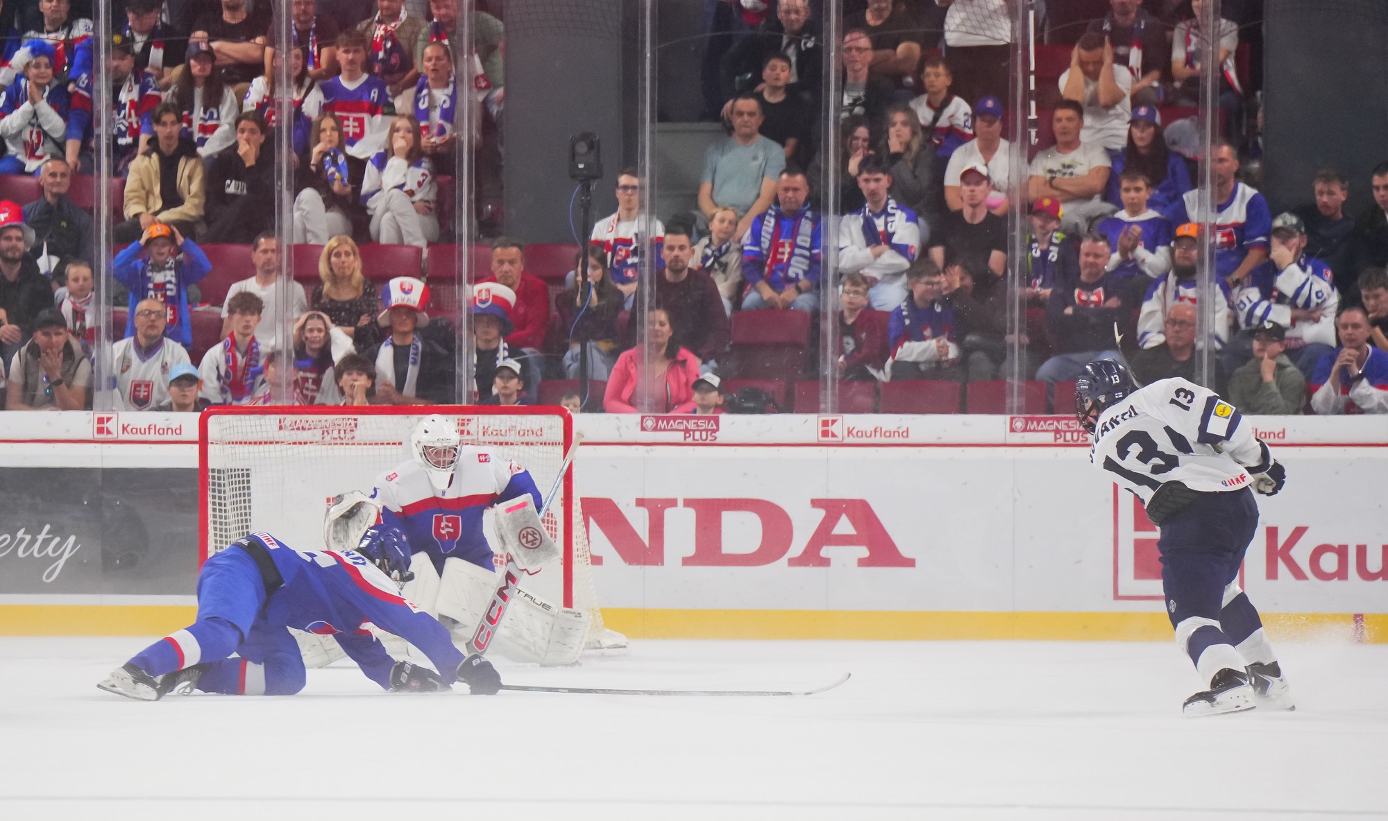 The game continued to fly by the seat of its pants: confusion between Goljar and Celko almost gifted Finland a fourth goal, but Slovakia survived – and even thrived for a time. A breakaway saw Samuel Sramaty on a two-on-one rush. Shaping to pass, he sent Lenni Kokkonen the wrong way before skating through to make it 4-3 on 36:55.