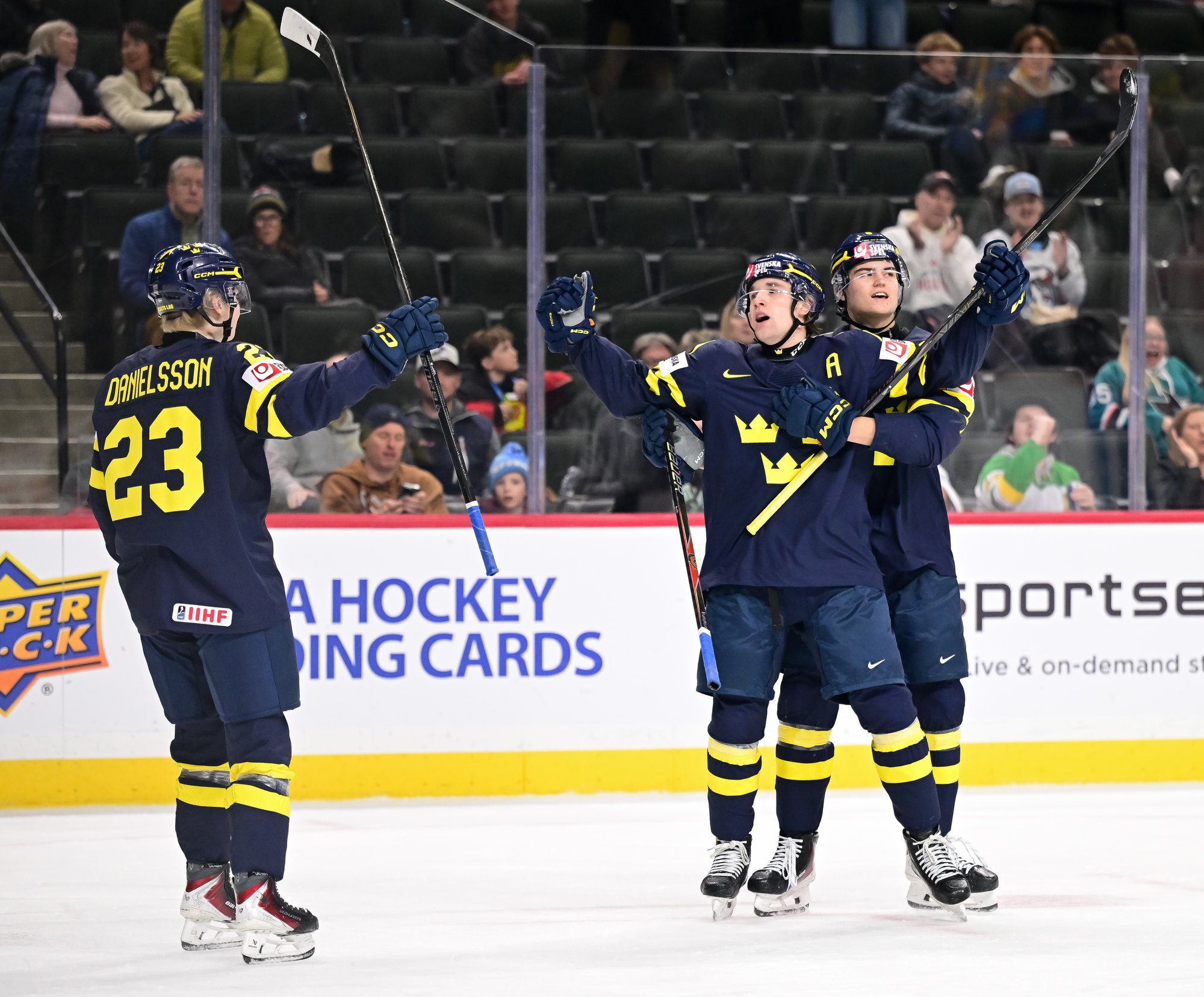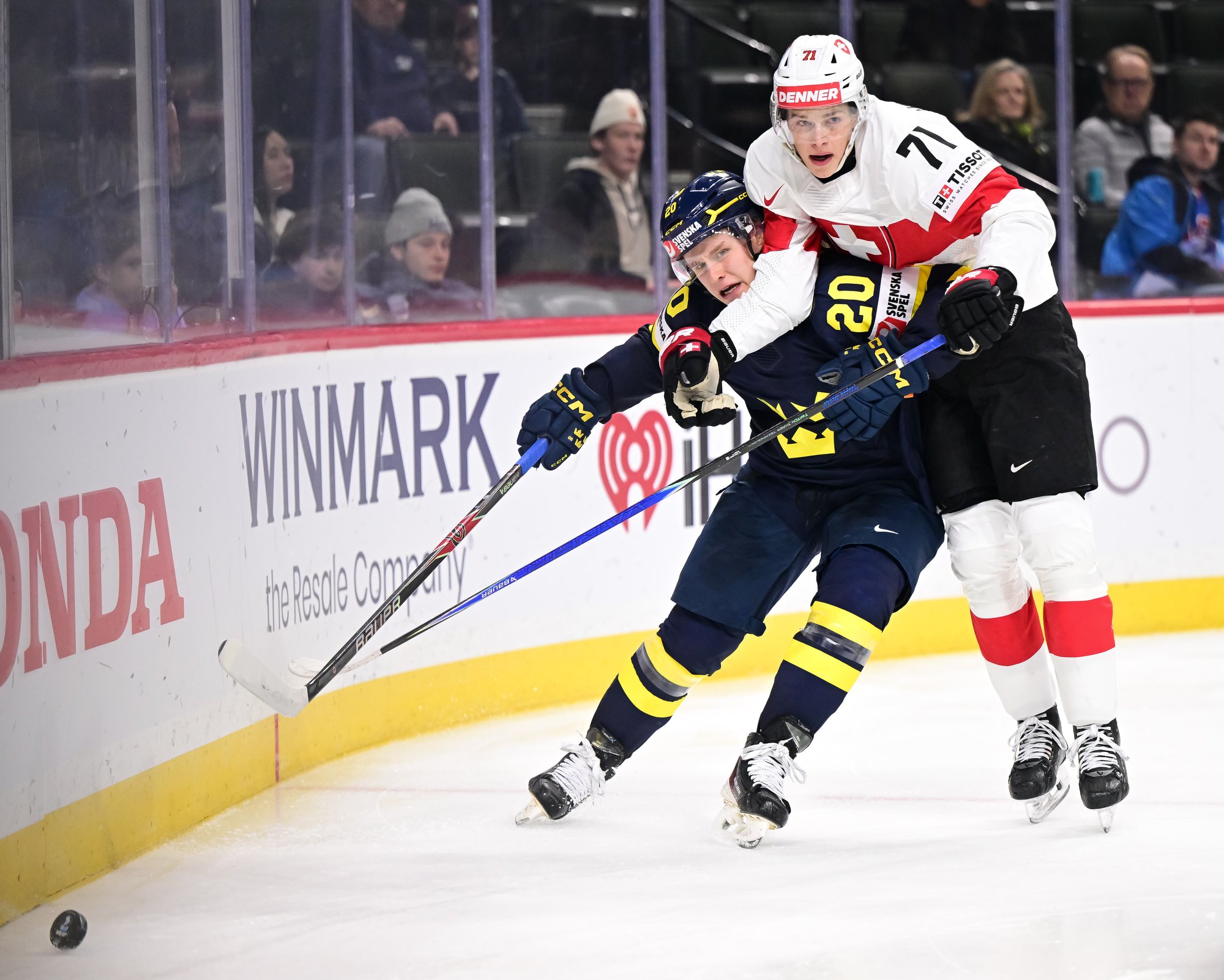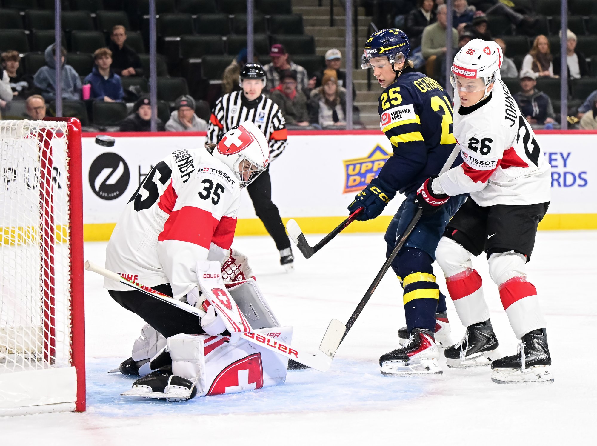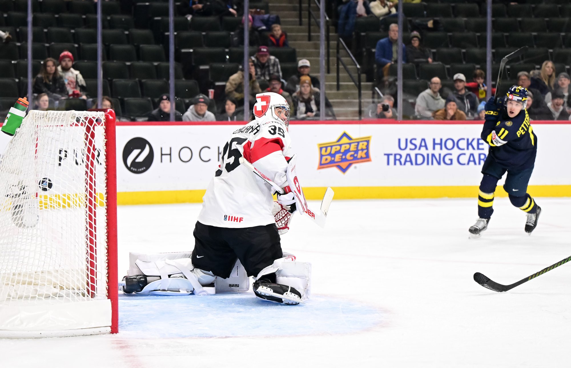 Moments later, Alfons Freij rattled a shot off the post, and at 6:28 the Swedes re-took the lead after the Swiss were lax in trying to clear the zone. Lucas Pettersson got to the puck and beat Elijah Neuenschwander before the goalie knew what had happened.