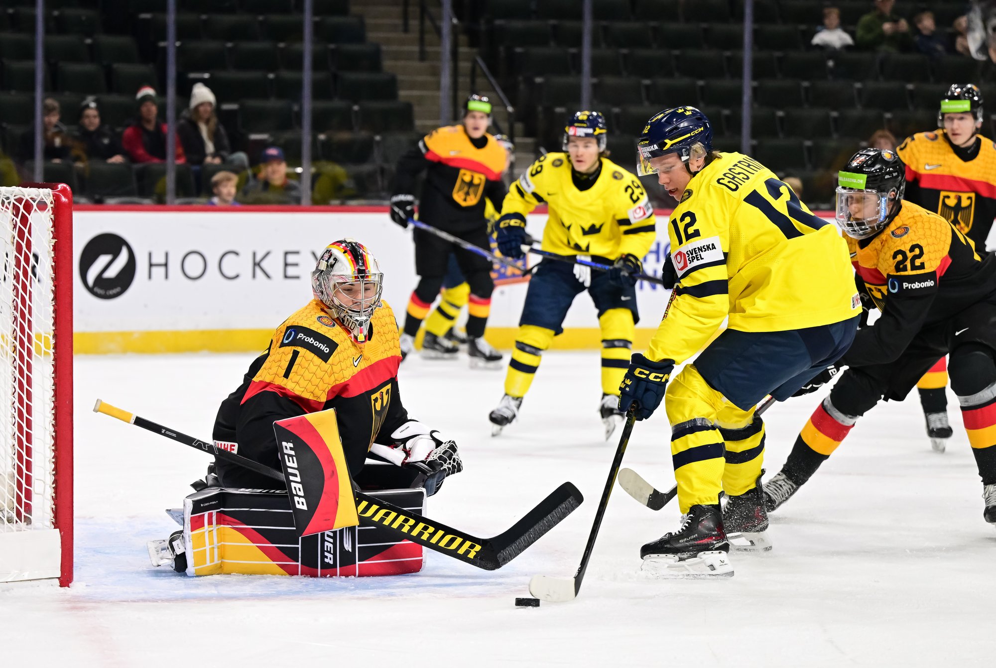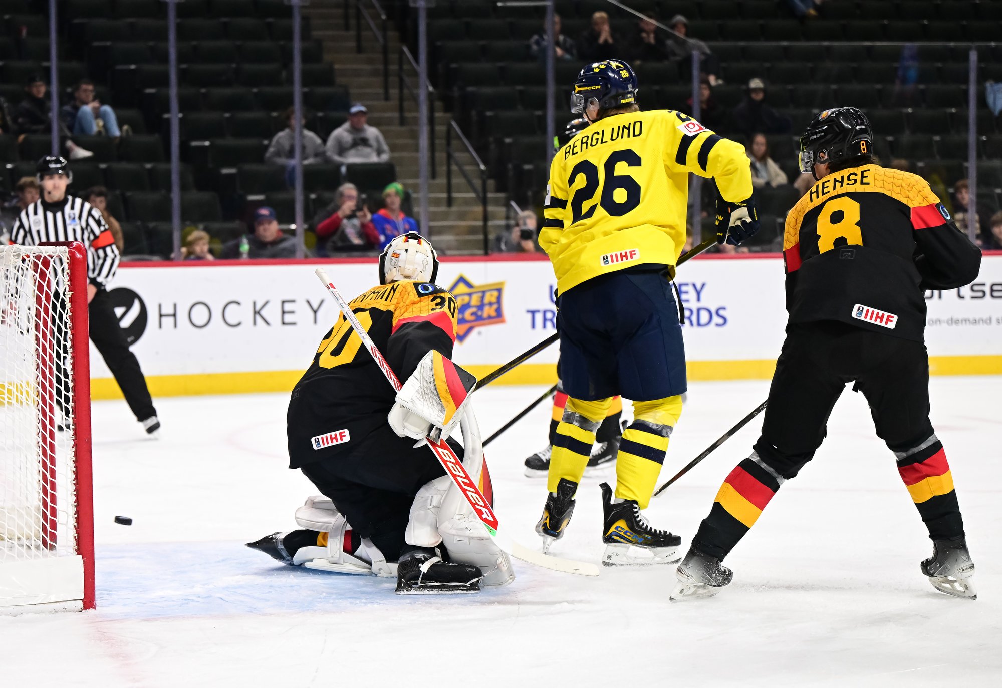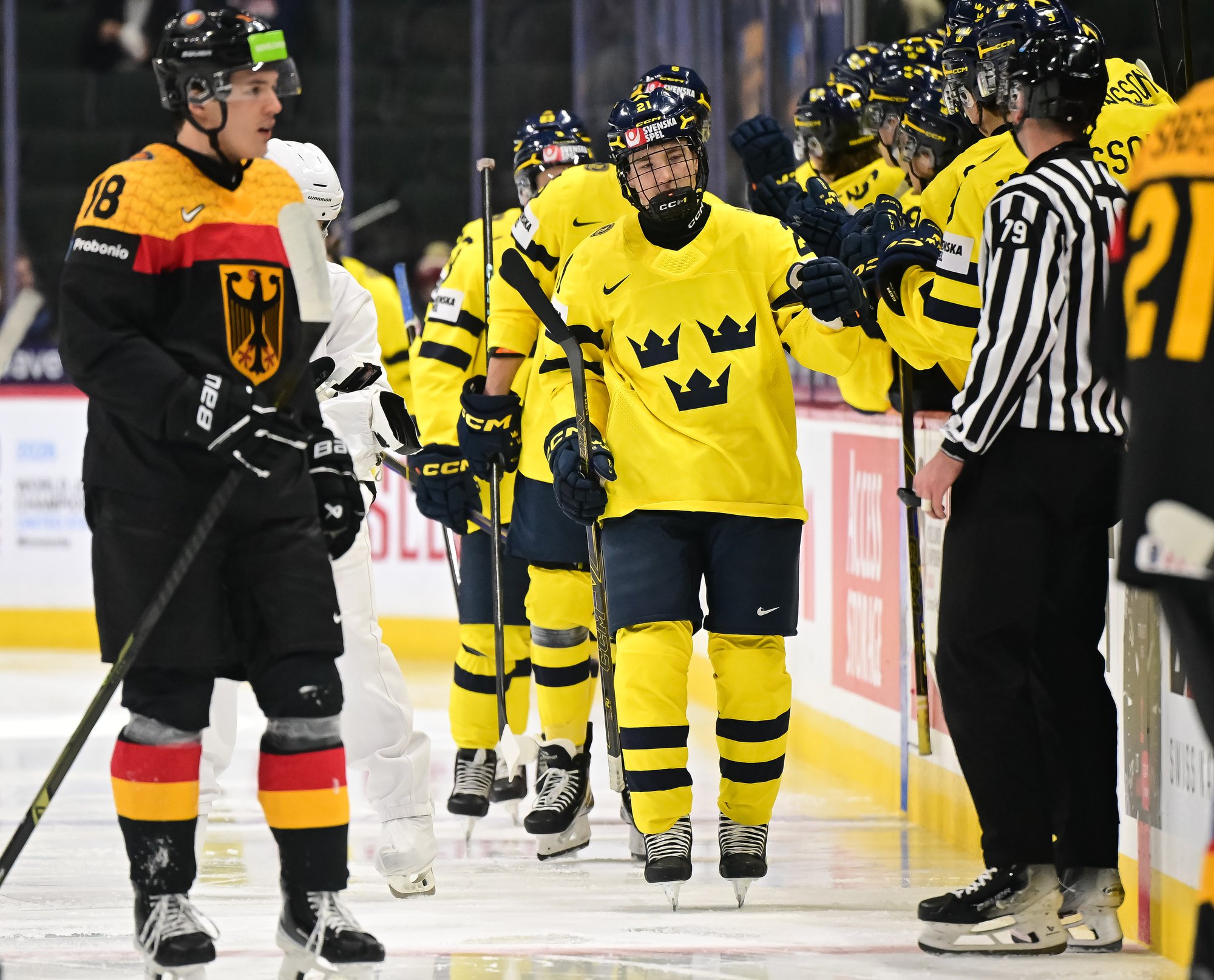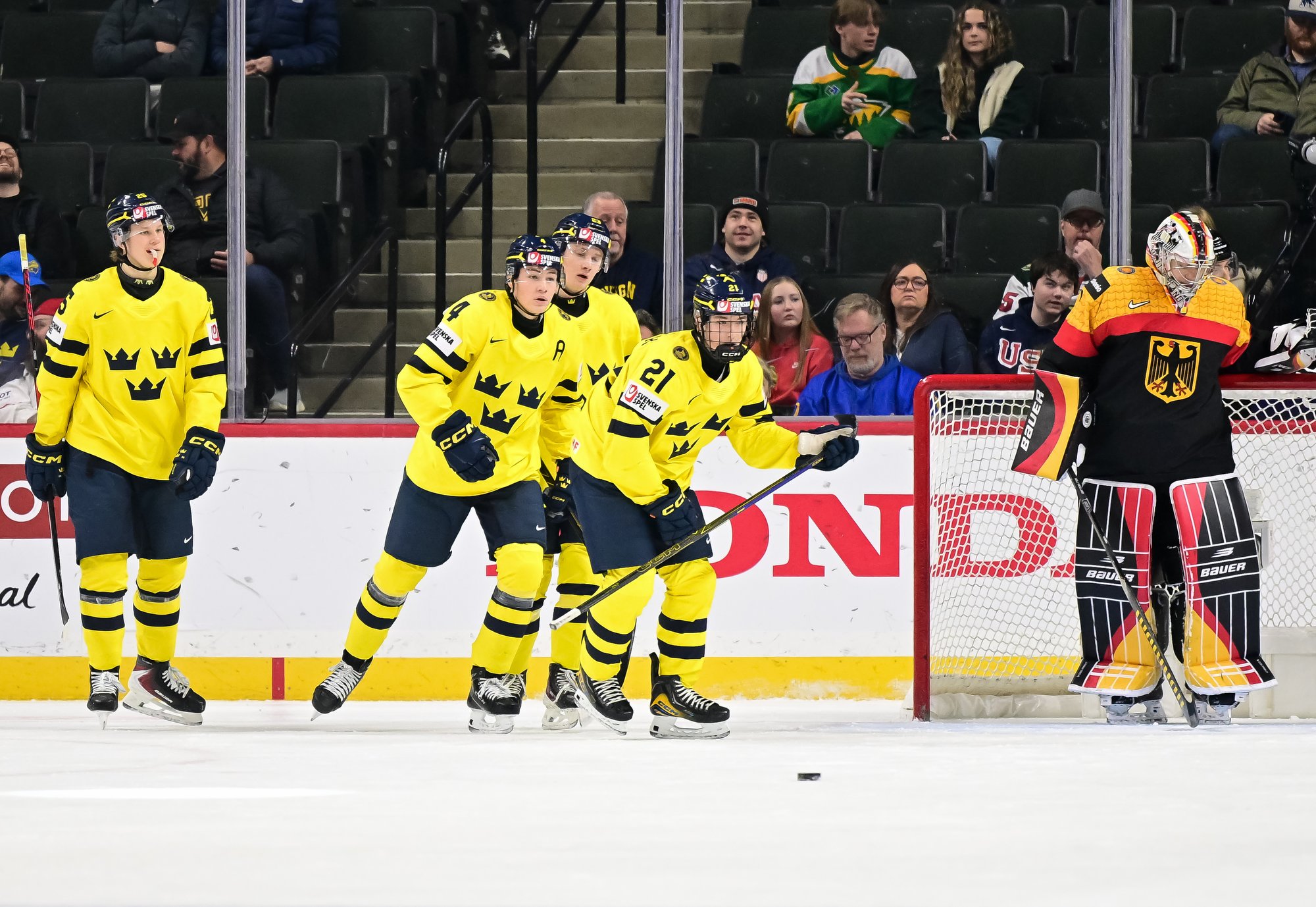 Final shots favoured Sweden 44-17. Swedish goalie Herman Liv made 16 saves for a winning World Junior debut. Germany's Linus Vieillard was replaced by Lukas Stuhrmann after giving up five goals through two periods.
