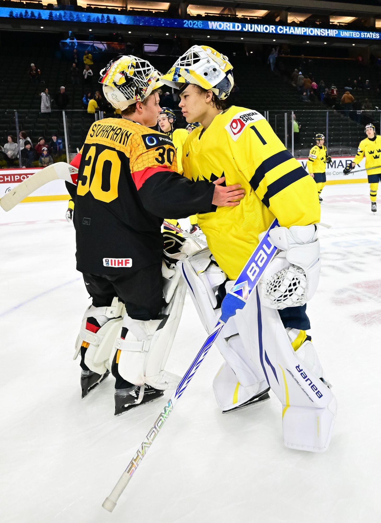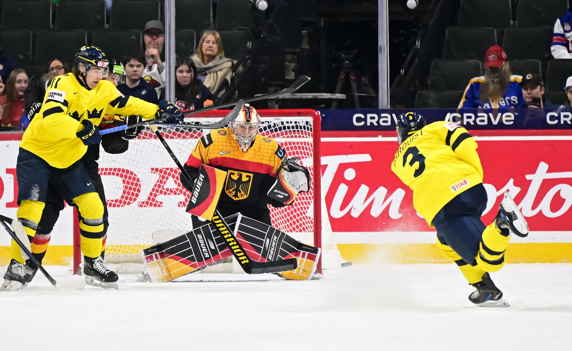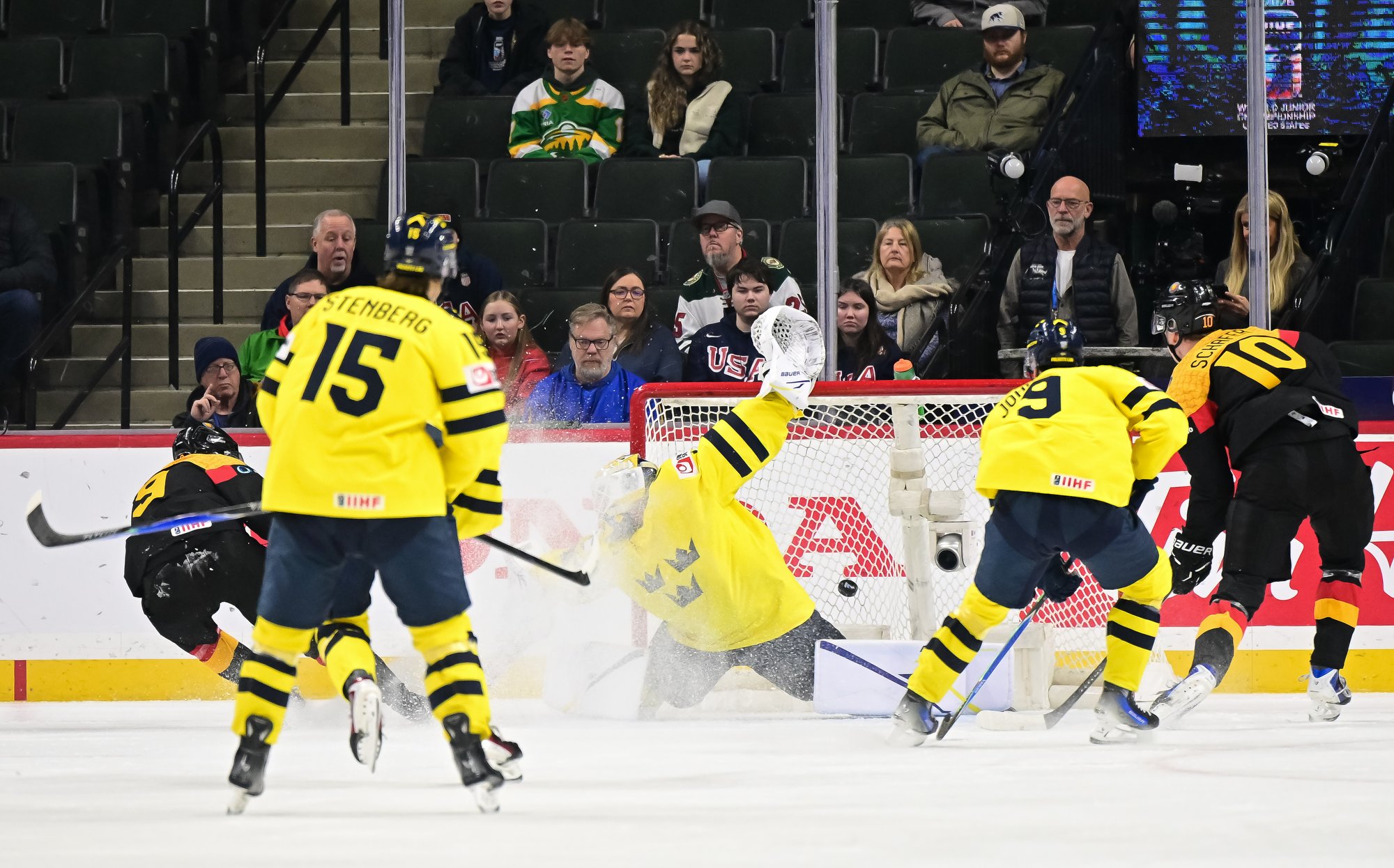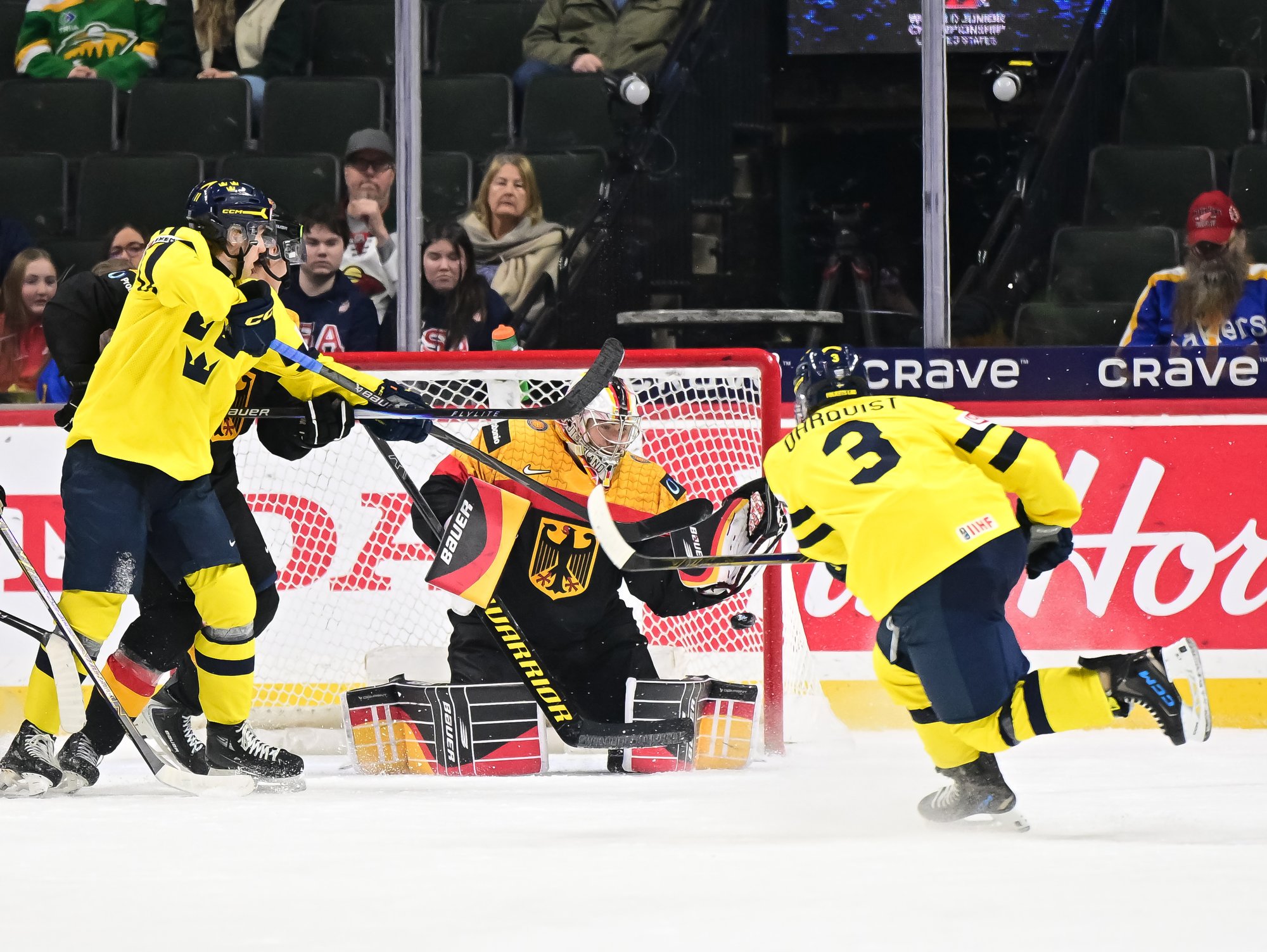 Final shots favoured Sweden 44-17. Swedish goalie Herman Liv made 16 saves for a winning World Junior debut. Germany's Linus Vieillard was replaced by Lukas Stuhrmann after giving up five goals through two periods.