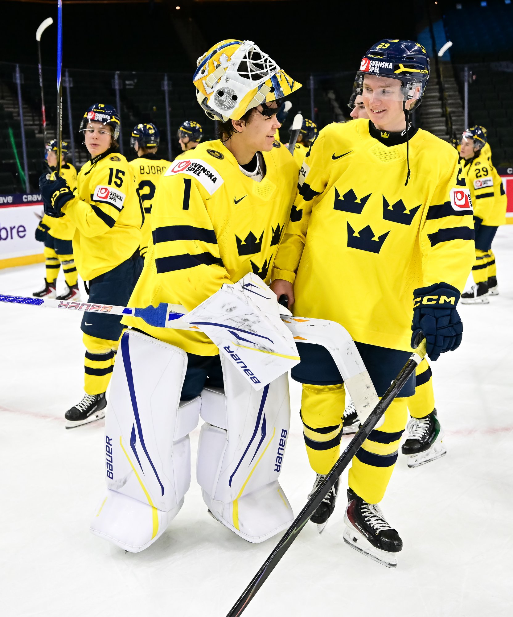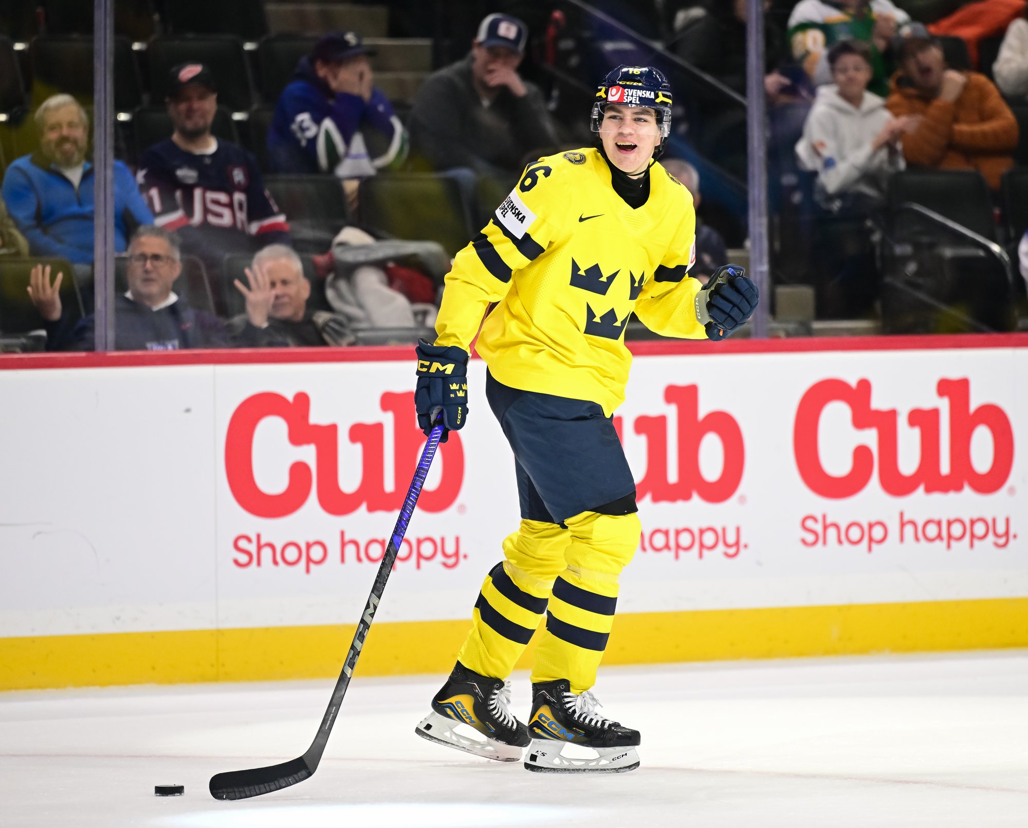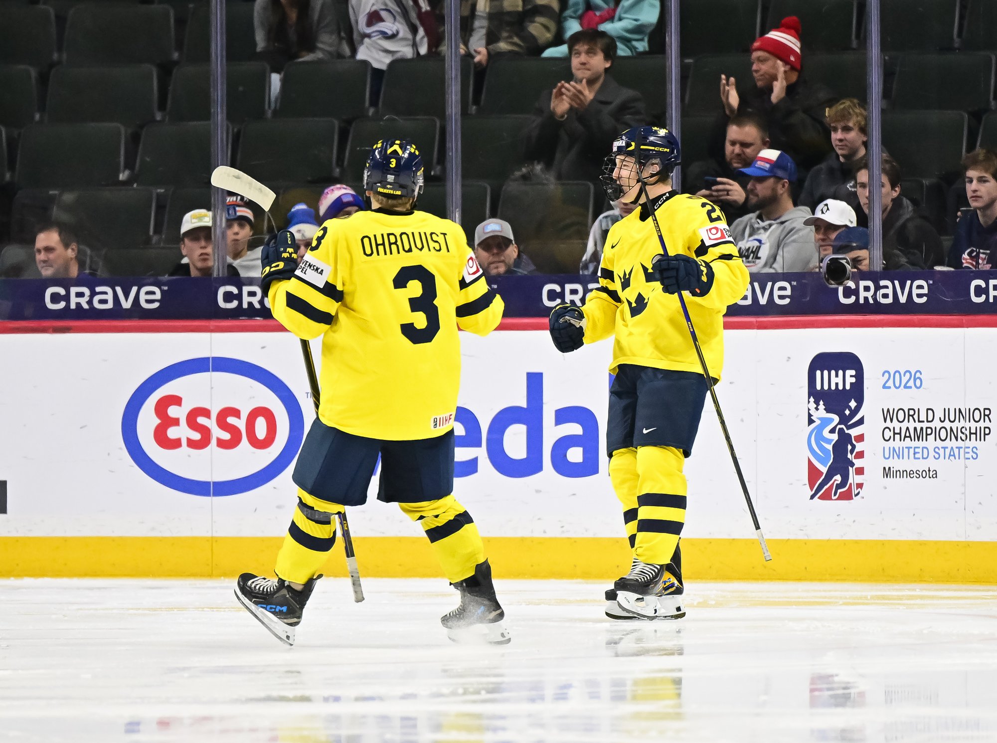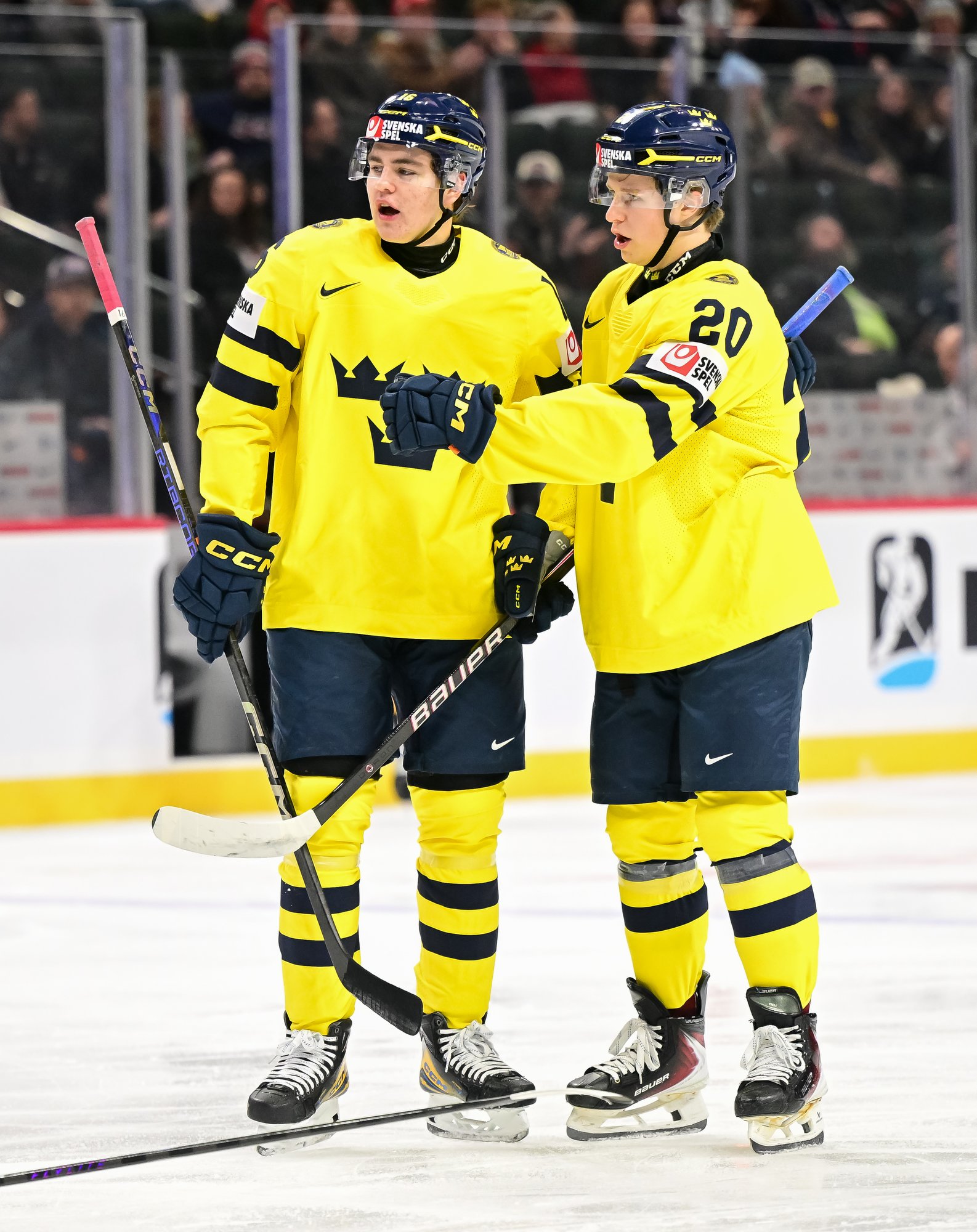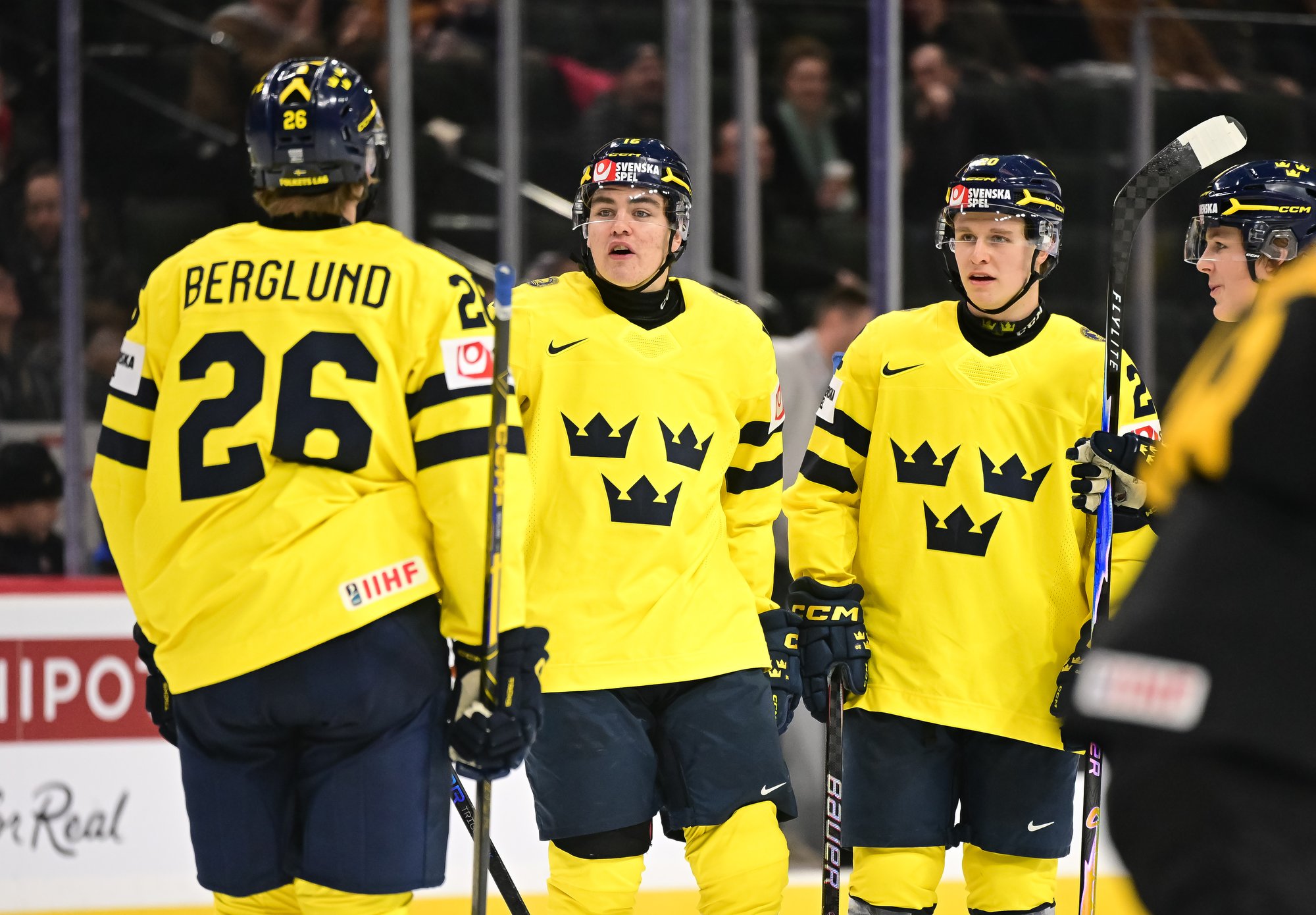 Sweden's Anton Frondell (#16) accepts congratulations from teammate Alfons Freij after getting the first goal in a 8-1 rout of Germany at the 2026 World Juniors.