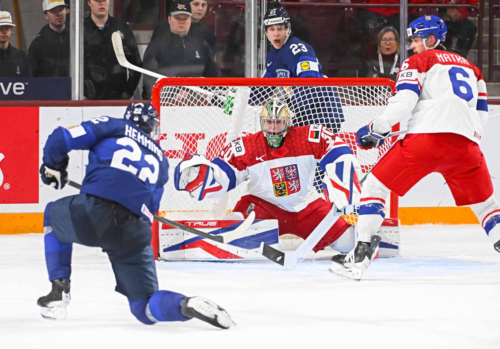 Leo Tuuva got to a loose puck first behind the Czech net and found Hemming in front, and Hemming made no mistake with a quick snap shot and only 19.3 seconds remaining in regulation.